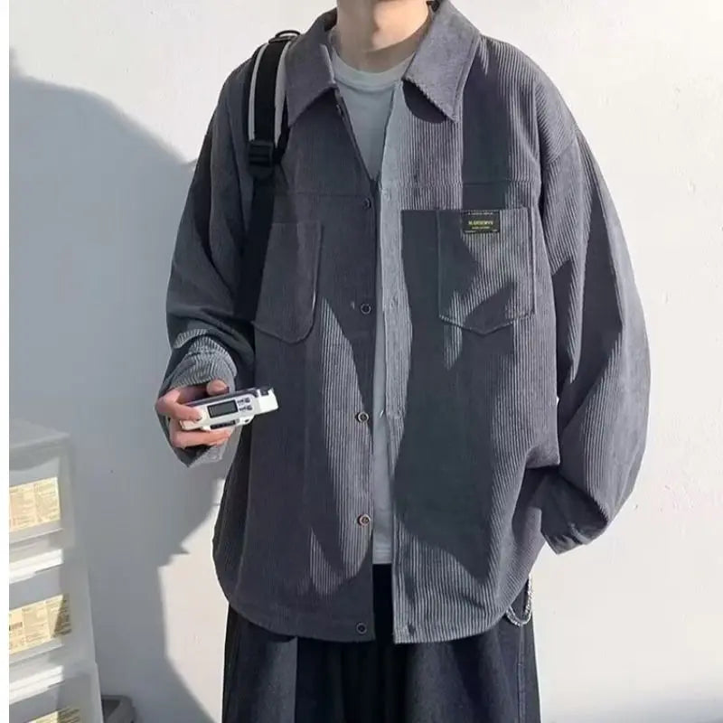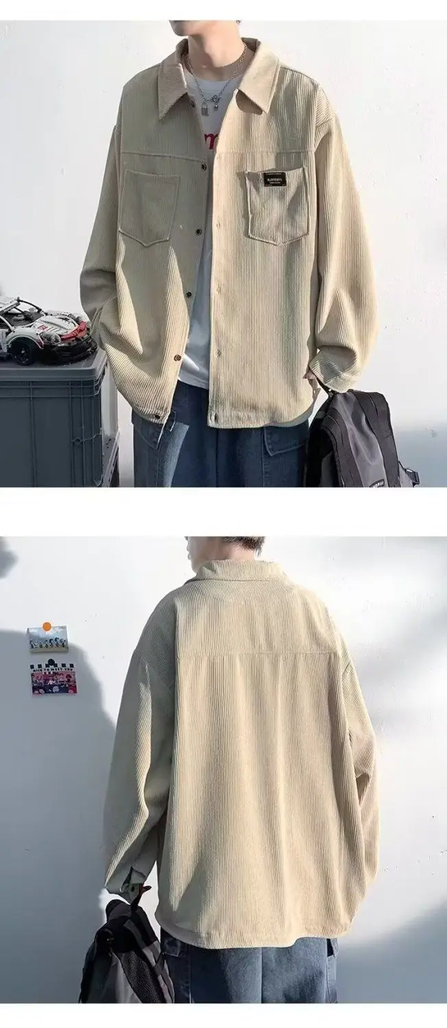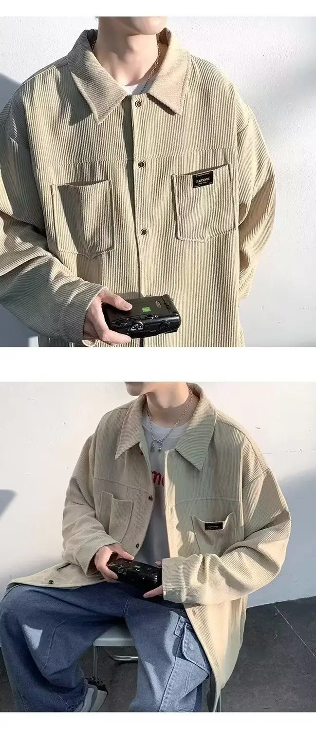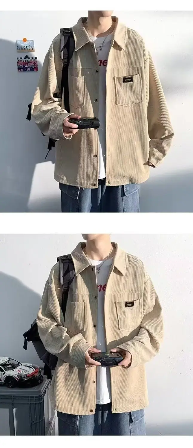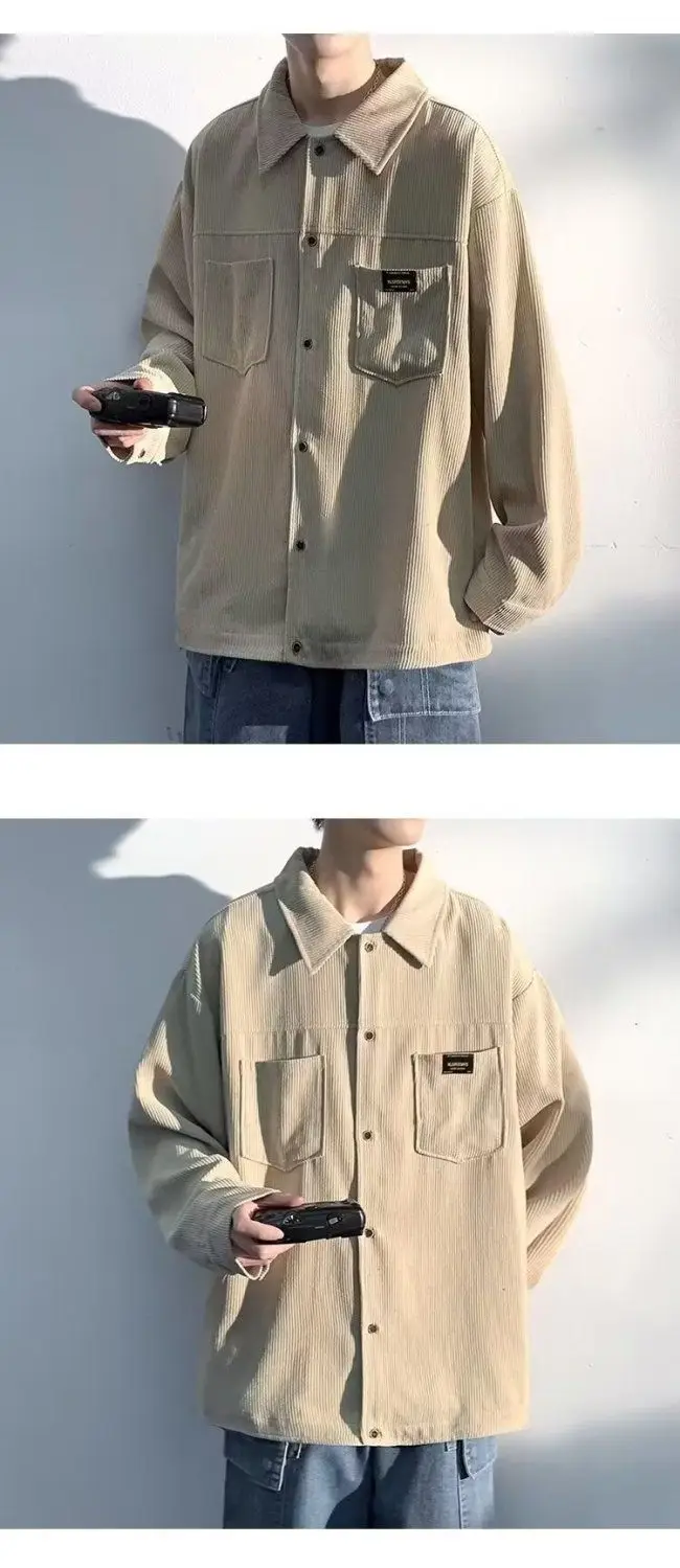 WIAOFELLAS - Retro Solid Color Lapel Jacket Men's Versatile Khaki Work Shirt