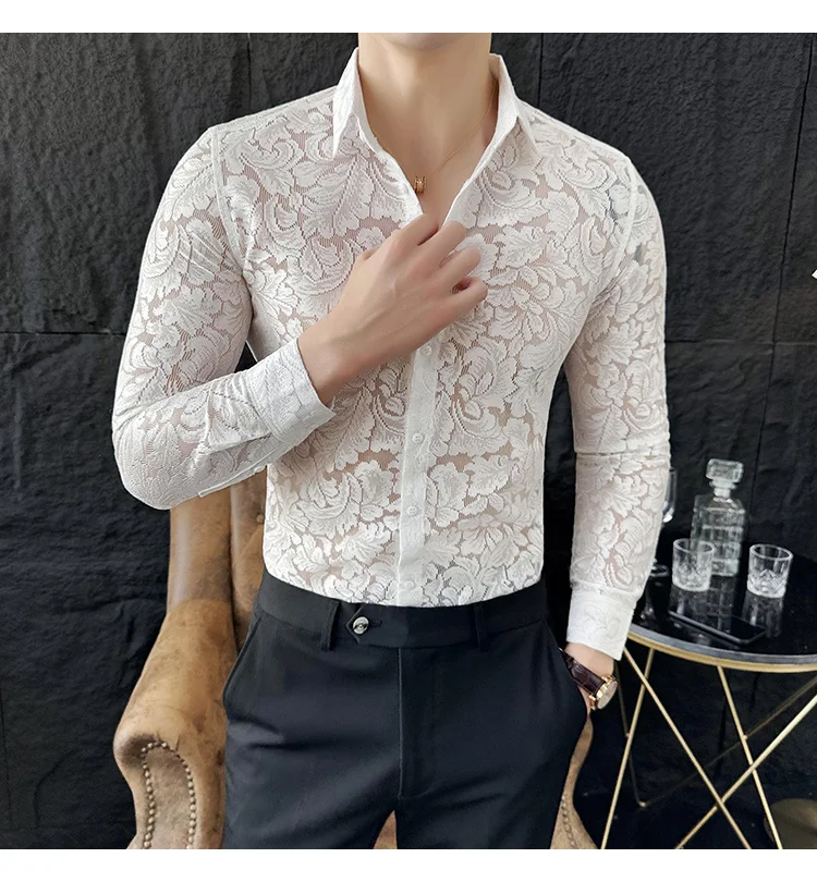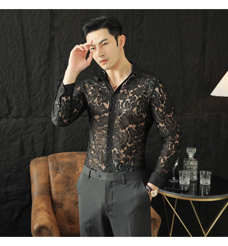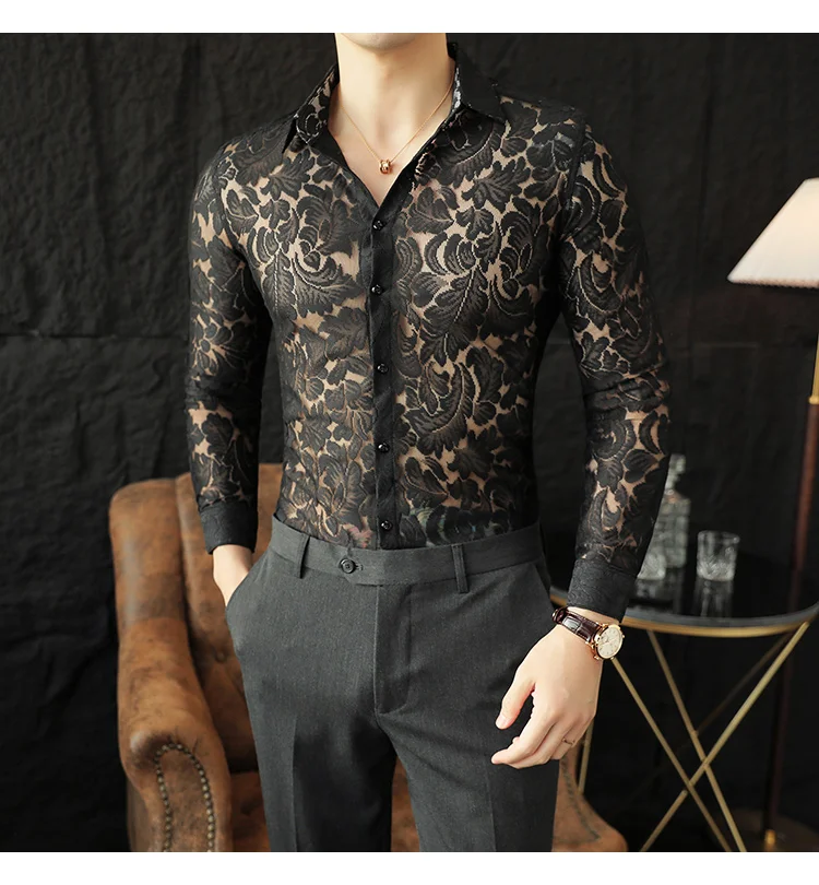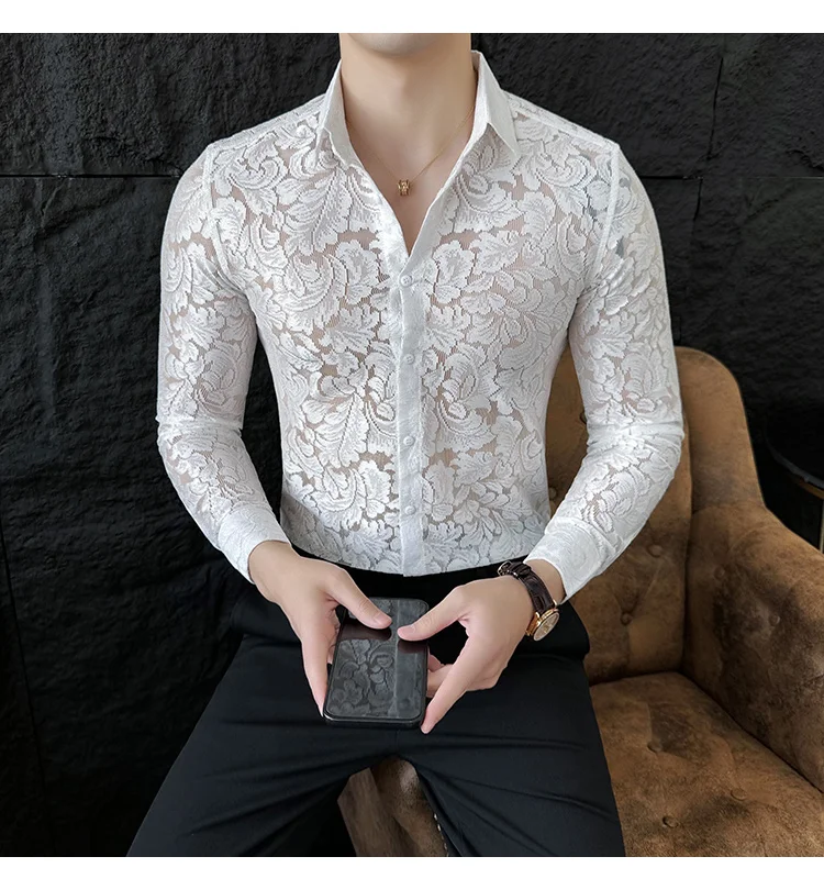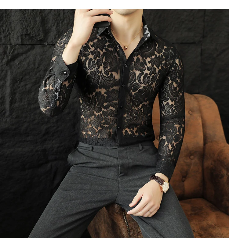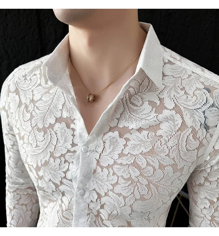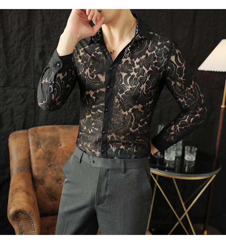 WIAOFELLAS  -  Sexy Men's Mesh See Through Fishnet Lace Shirts Long Sleeved Slim Fit Transparent Shirt for Men Nightclub Prom Camisa Masculina