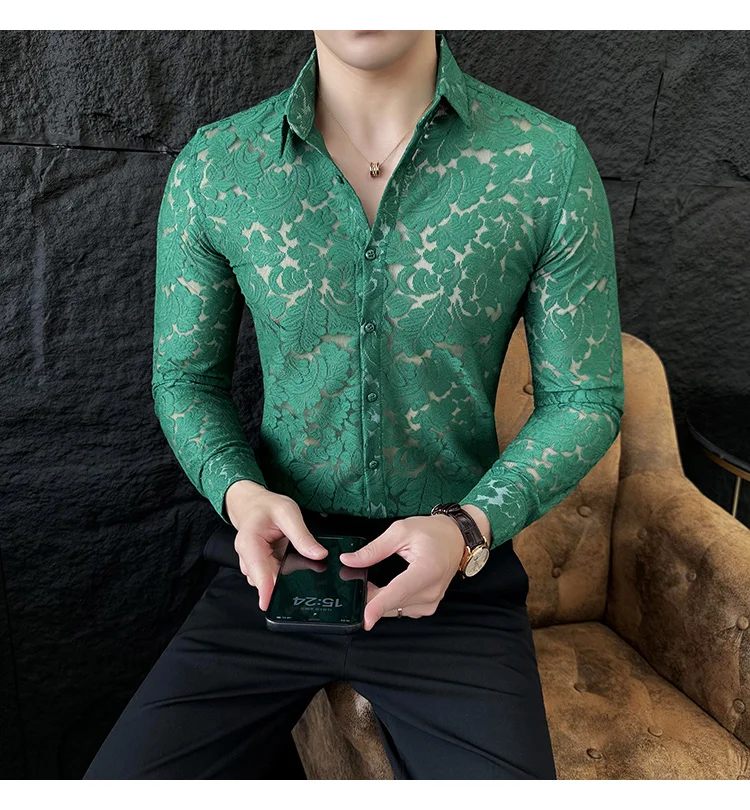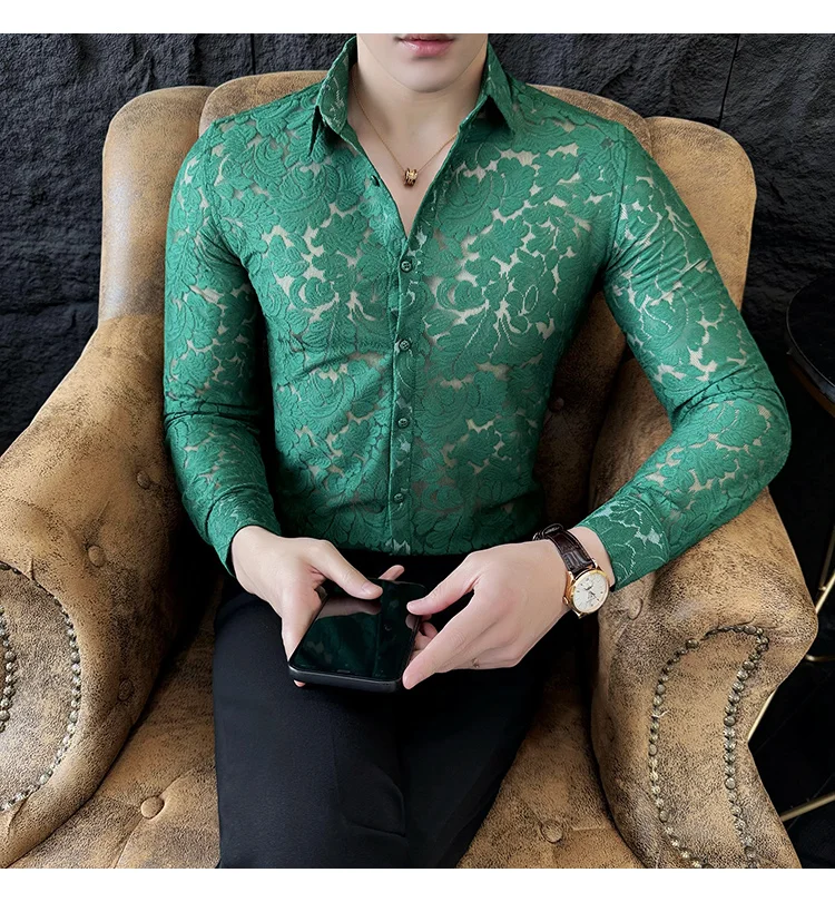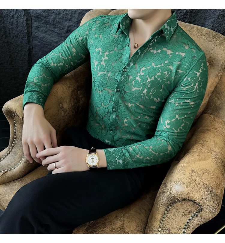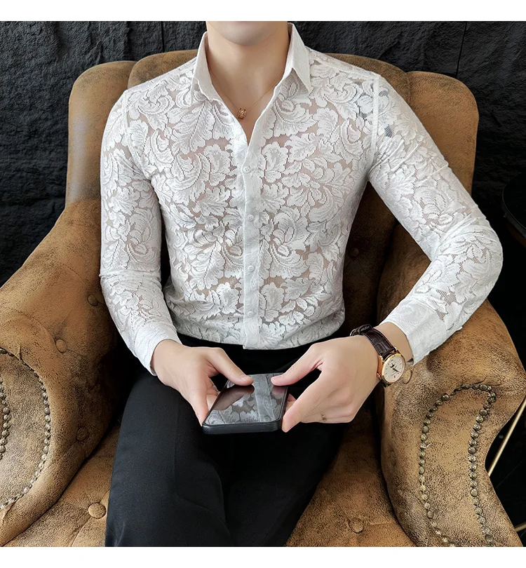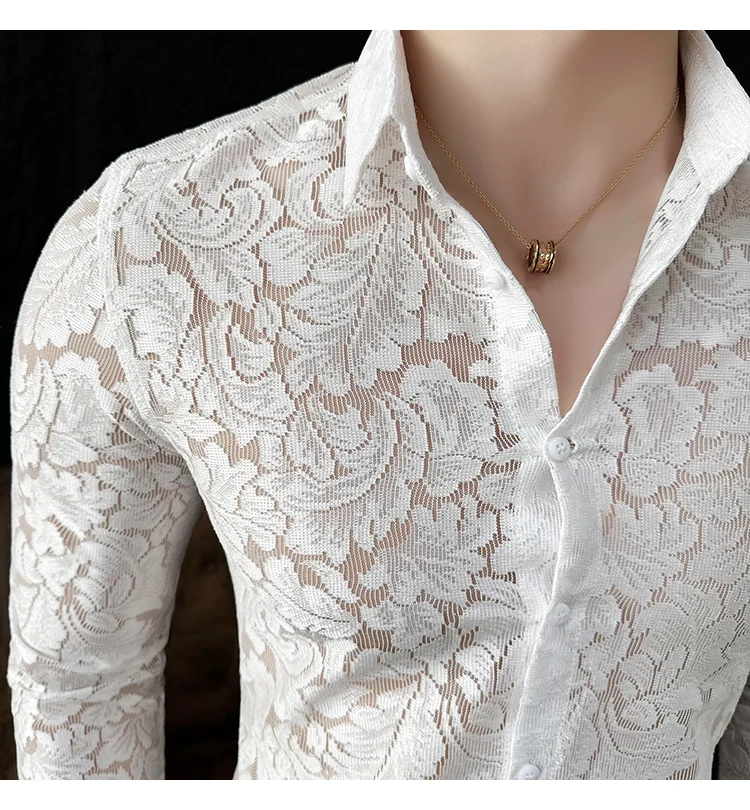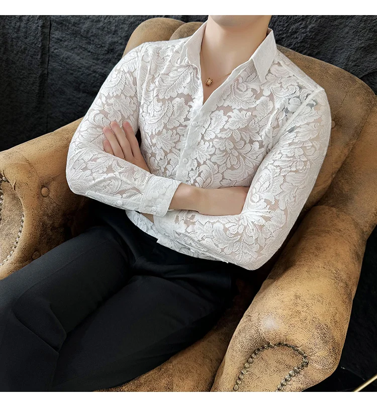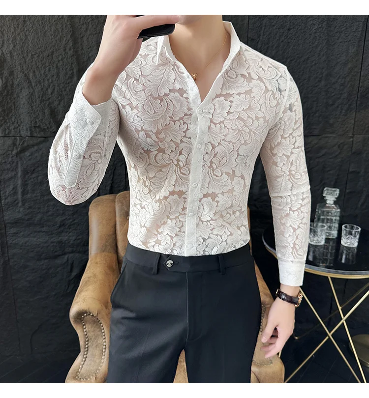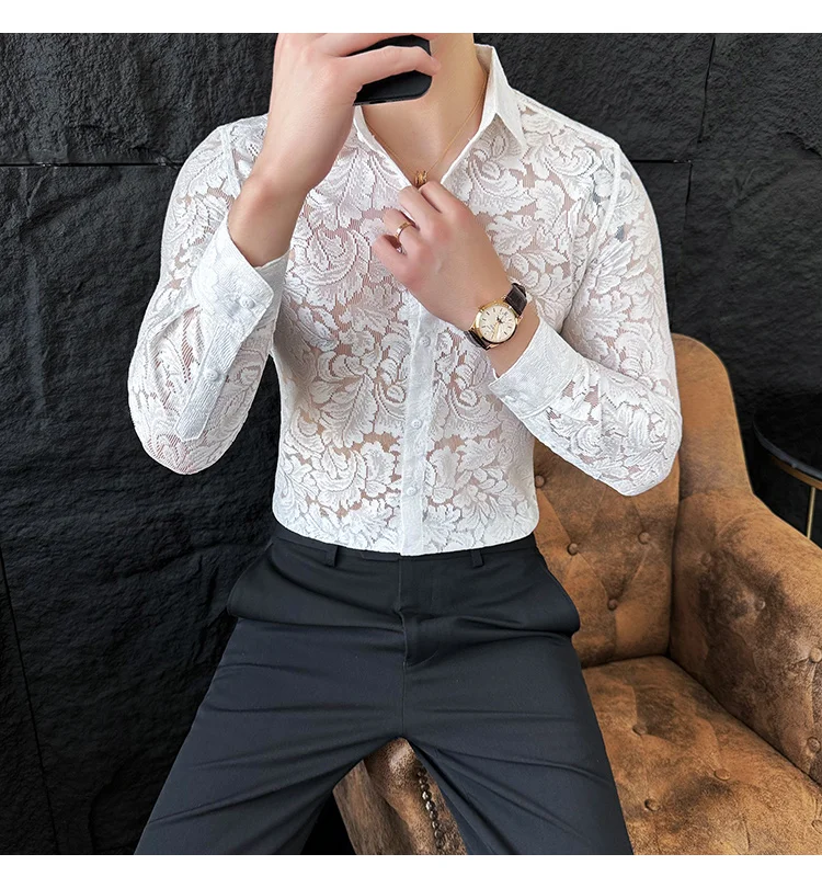 WIAOFELLAS  -  Sexy Men's Mesh See Through Fishnet Lace Shirts Long Sleeved Slim Fit Transparent Shirt for Men Nightclub Prom Camisa Masculina
