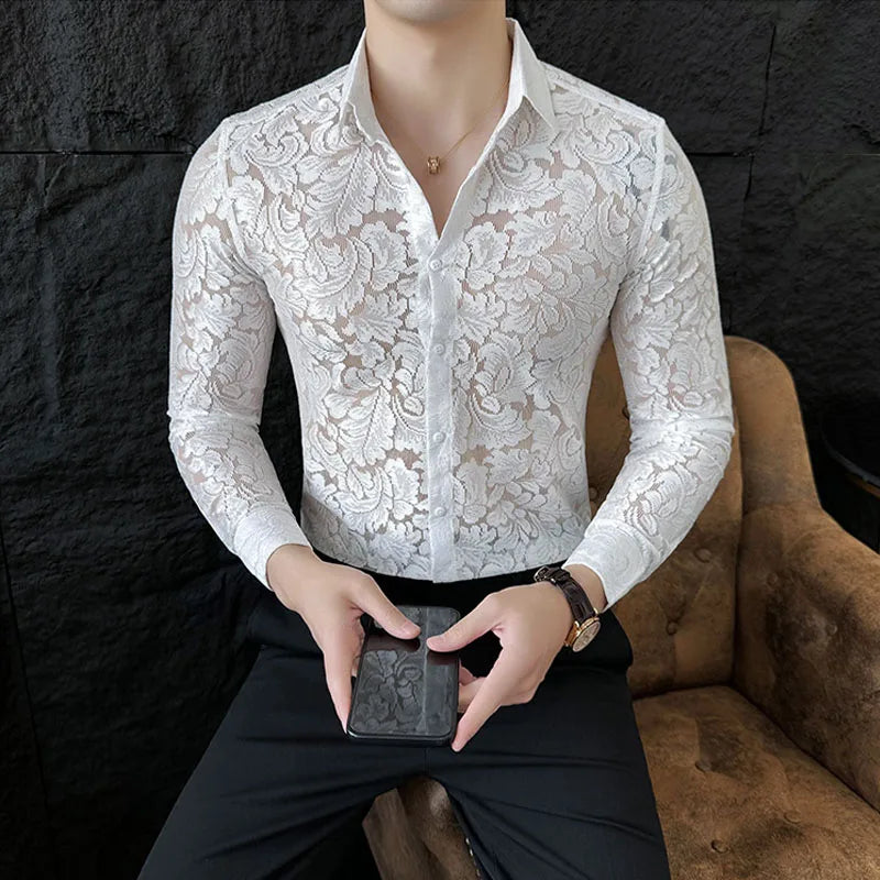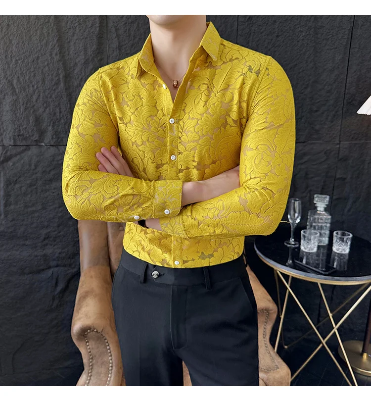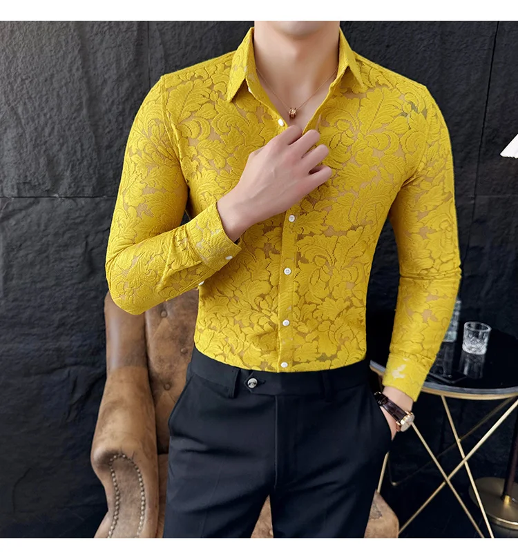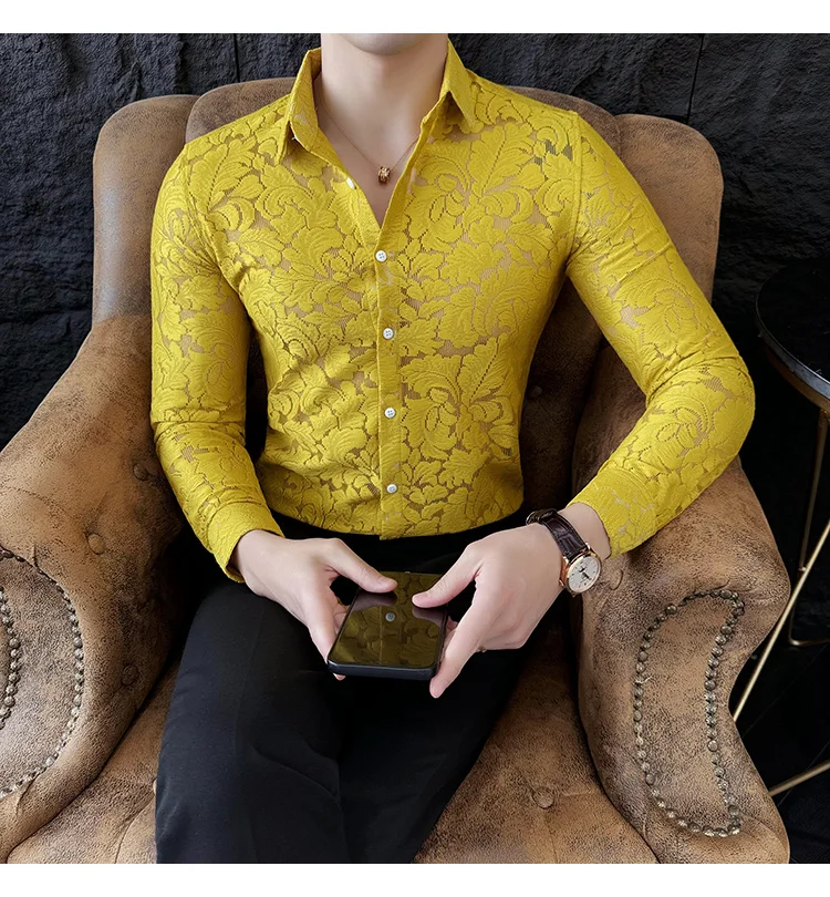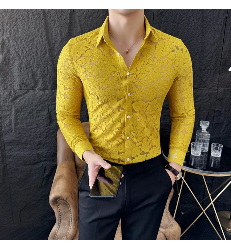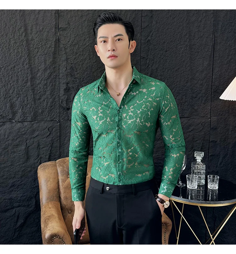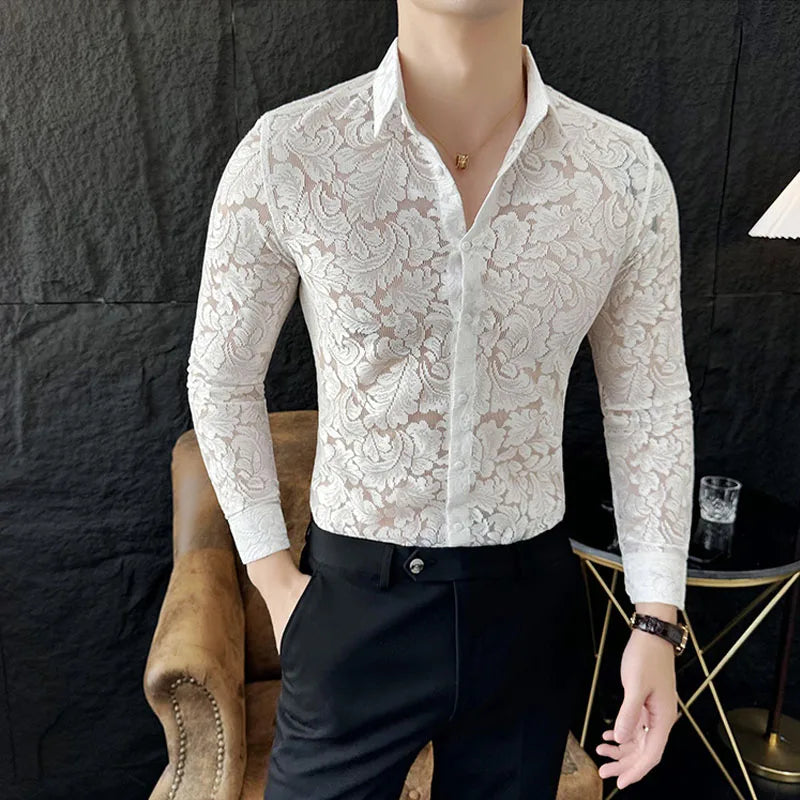 WIAOFELLAS  -  Sexy Men's Mesh See Through Fishnet Lace Shirts Long Sleeved Slim Fit Transparent Shirt for Men Nightclub Prom Camisa Masculina