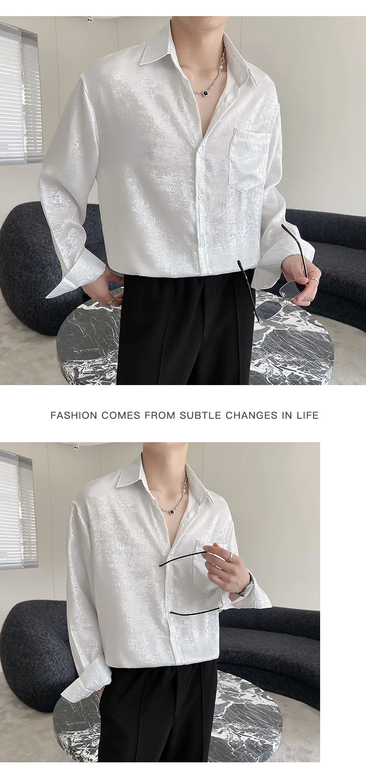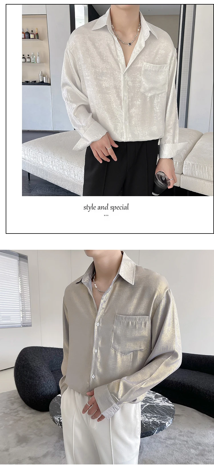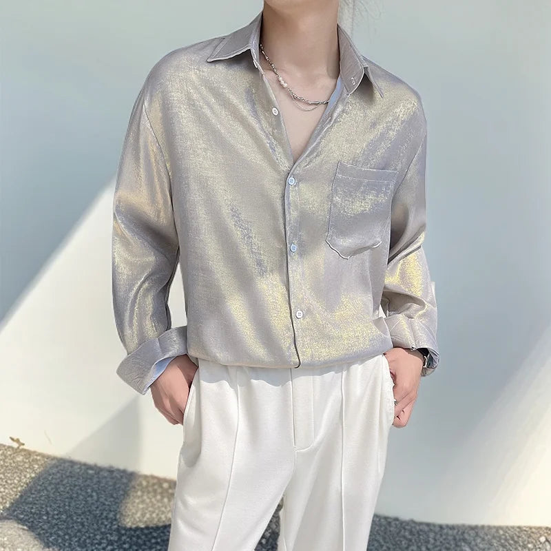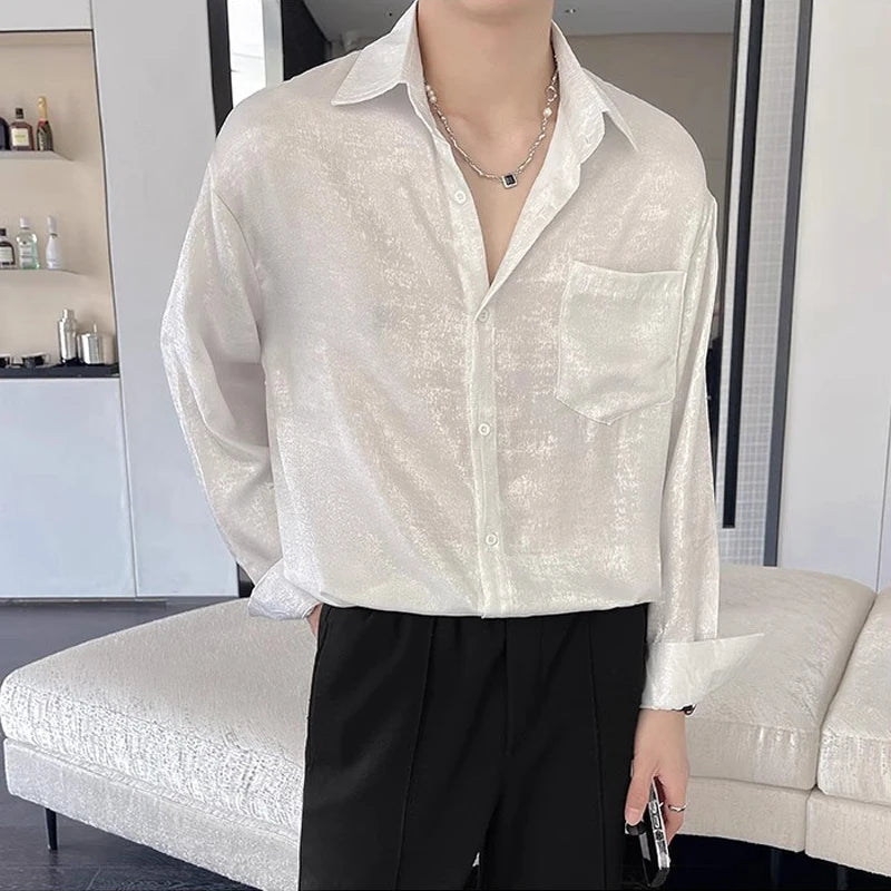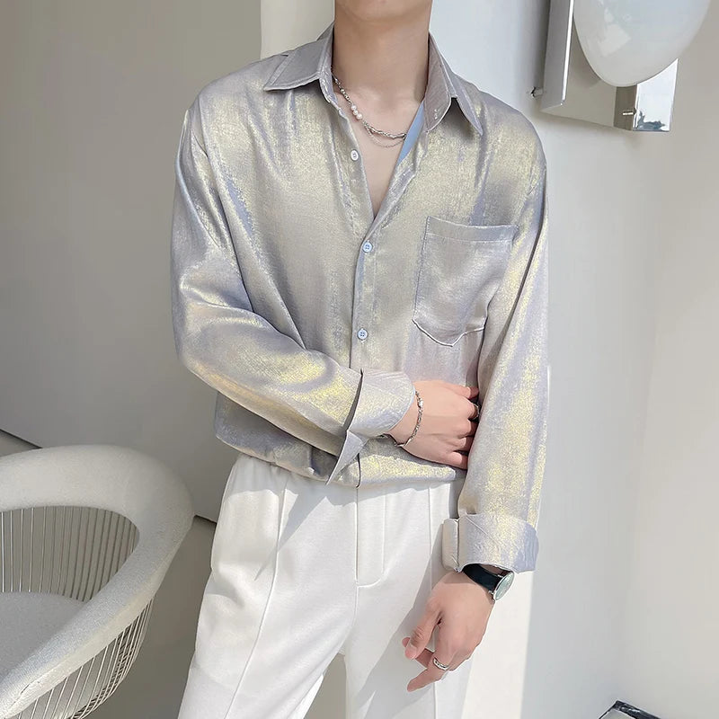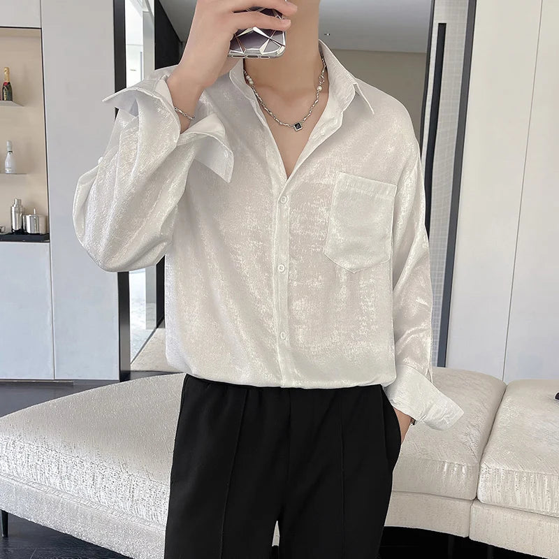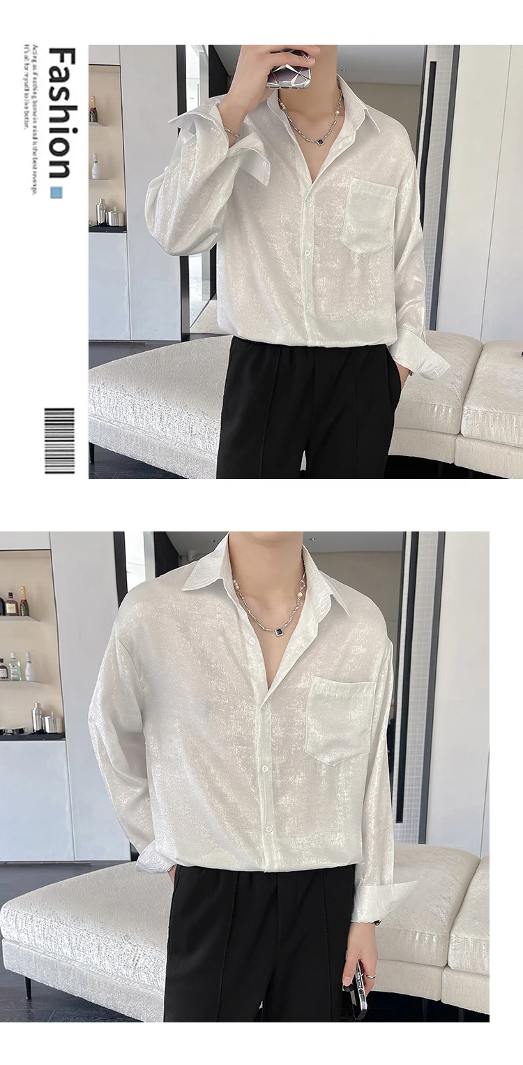 WIAOFELLAS - Sexy Silk Satin Shirts for Men Long Sleeved Shiny Smooth Solid Loose Men's Dress Shirt Autumn Spring Club Prom Mens Clothing