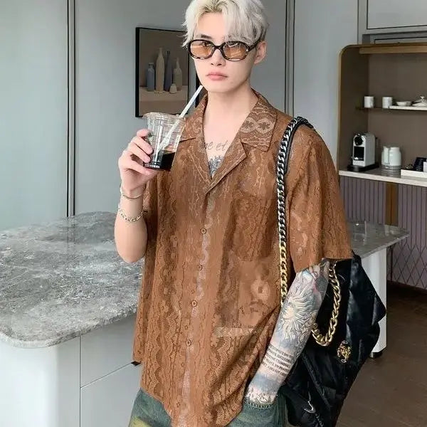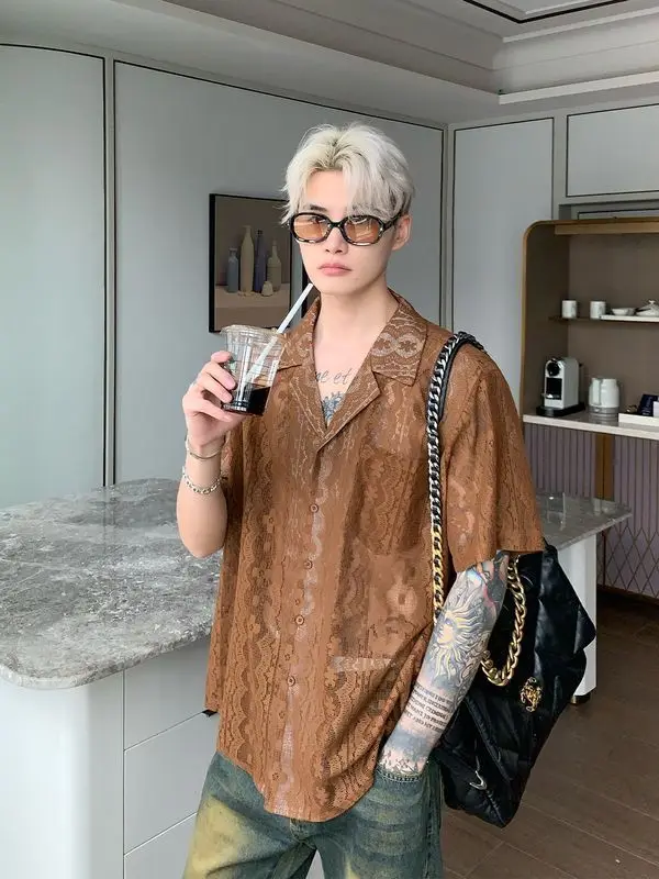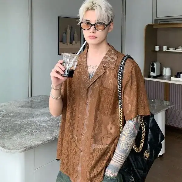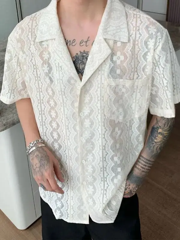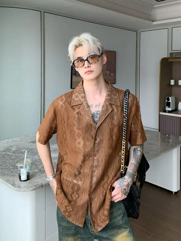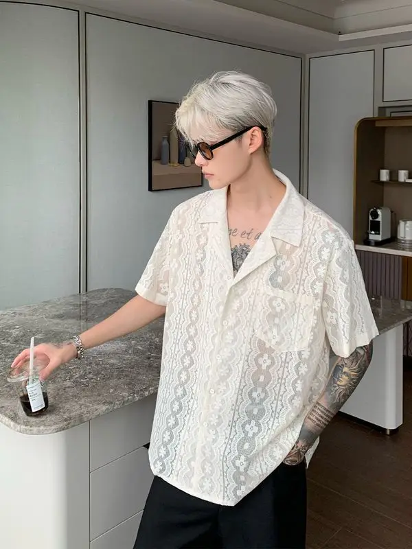 WIAOFELLAS  -  Shirts for Men Summer New High-end Advanced Temperature Designed Niche Retro Style Loose Fashionable Hollow Short-sleeved Shirt