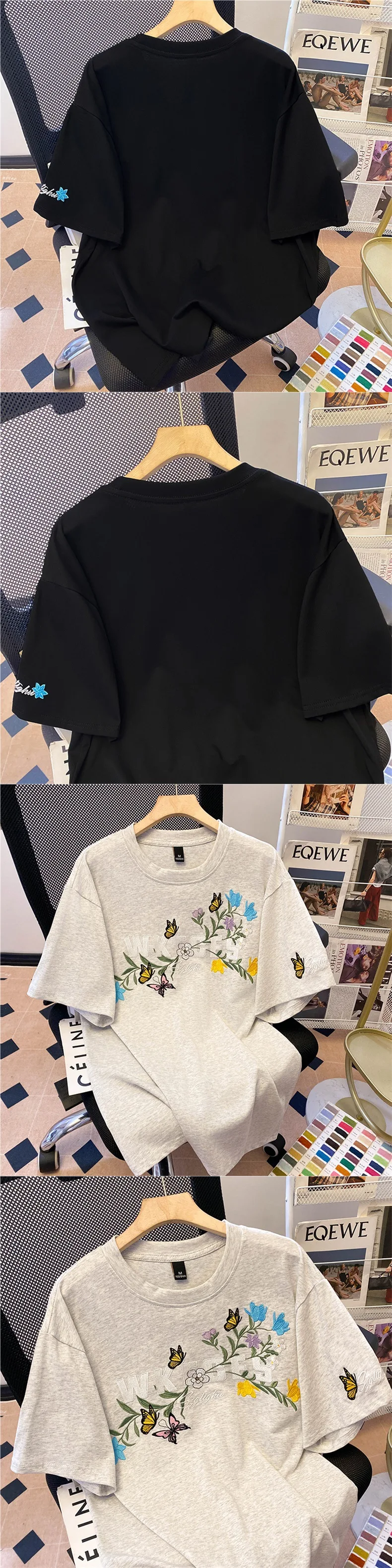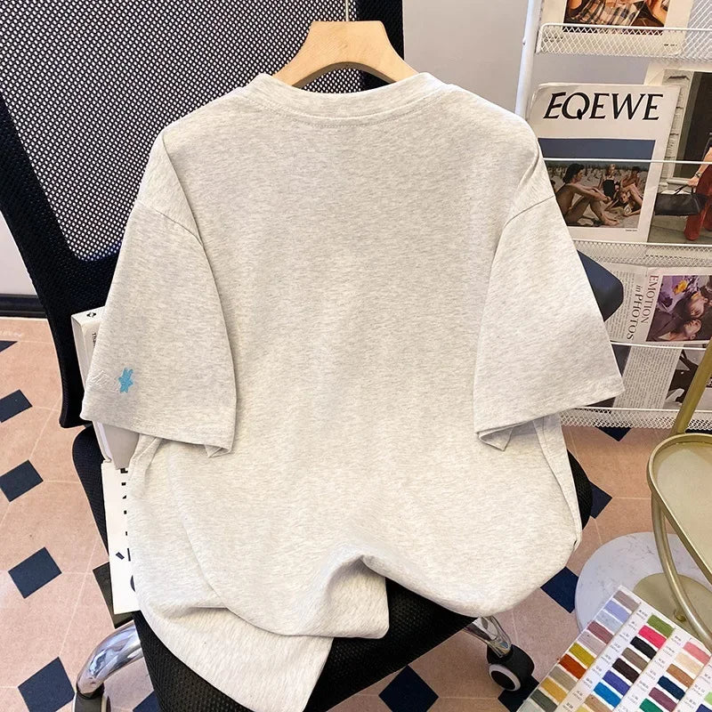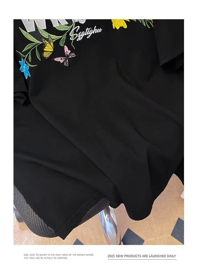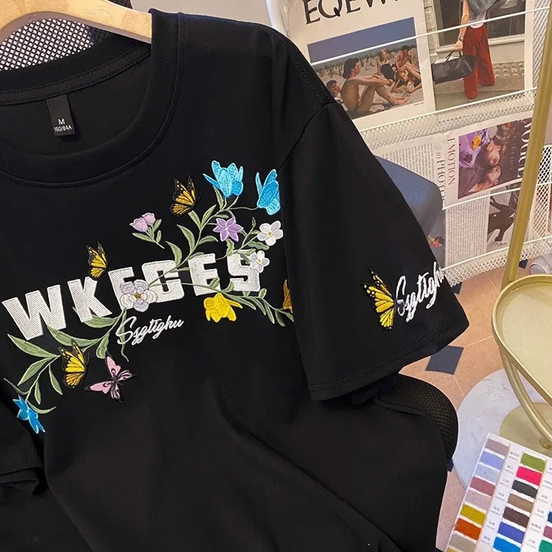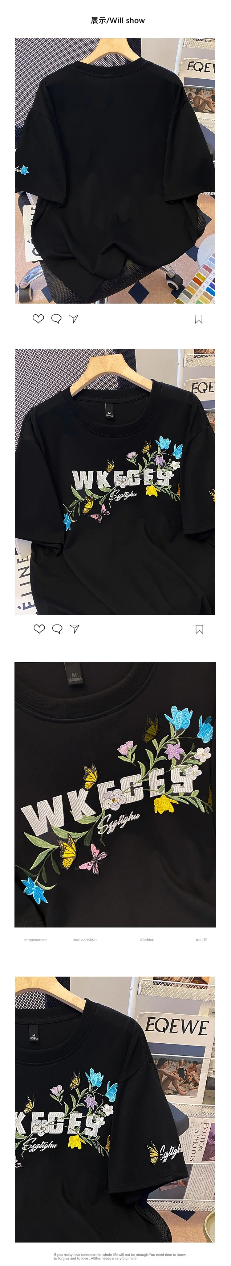 WIAOFELLAS - Short Sleeve T-Shirt Men Summer New Fashion Embroidery Shoulder round Neck Top Women Stylish Versatile Ins Crew Neck Tee