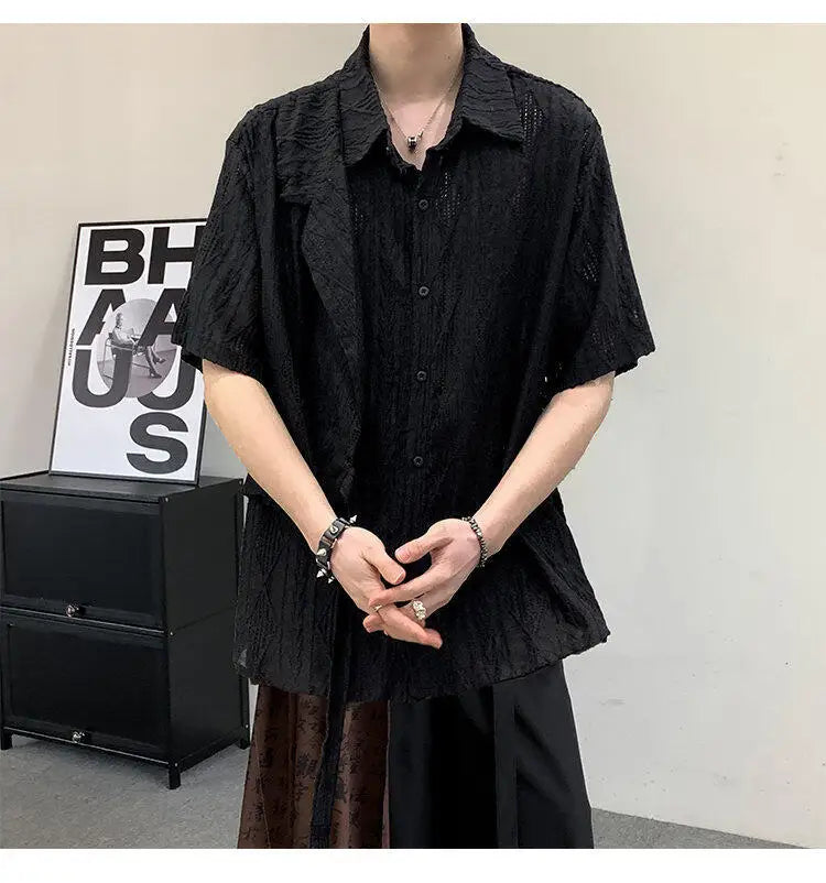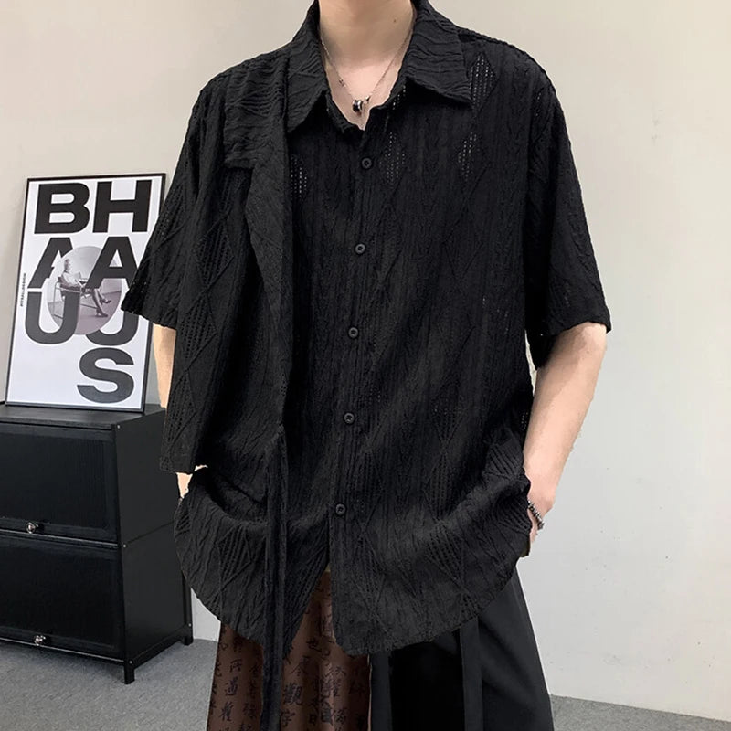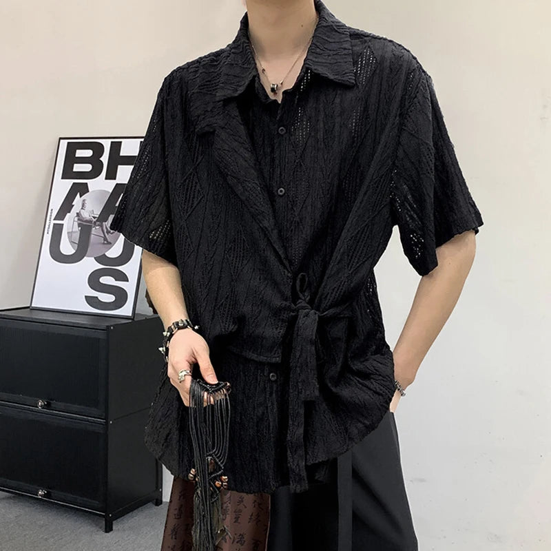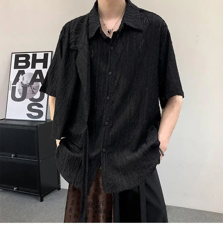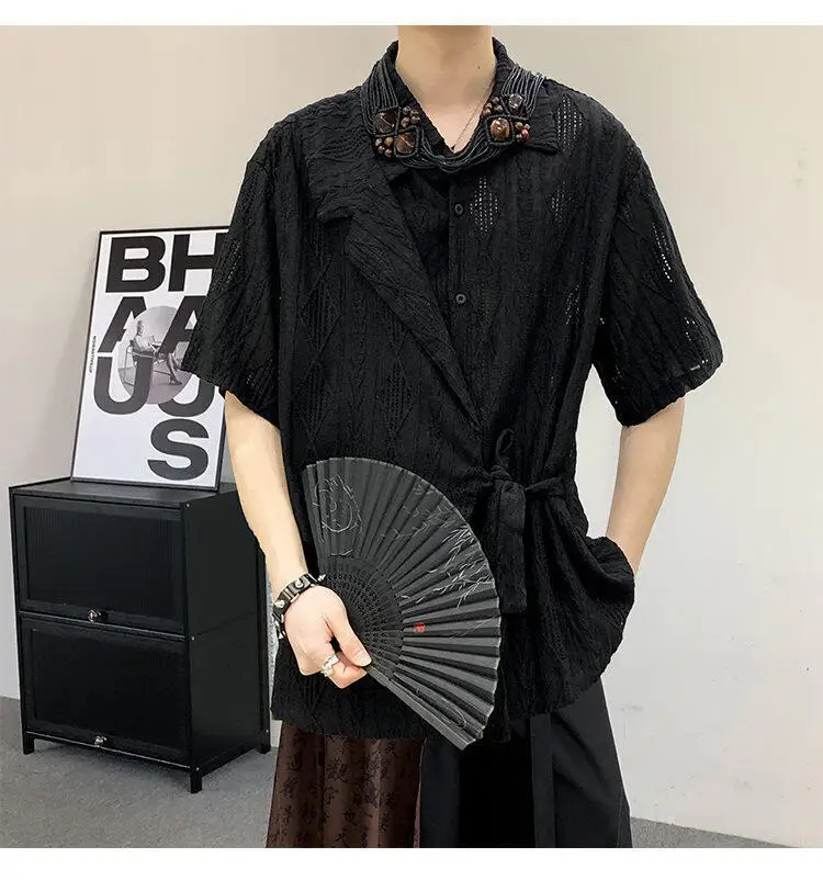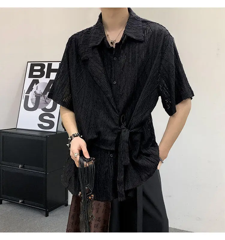 WIAOFELLAS - Short Sleeved Men's Shirts Casual Solid Color Hollow Out Jacquard Lace-up Loose Single Breasted Male Tops Trendy