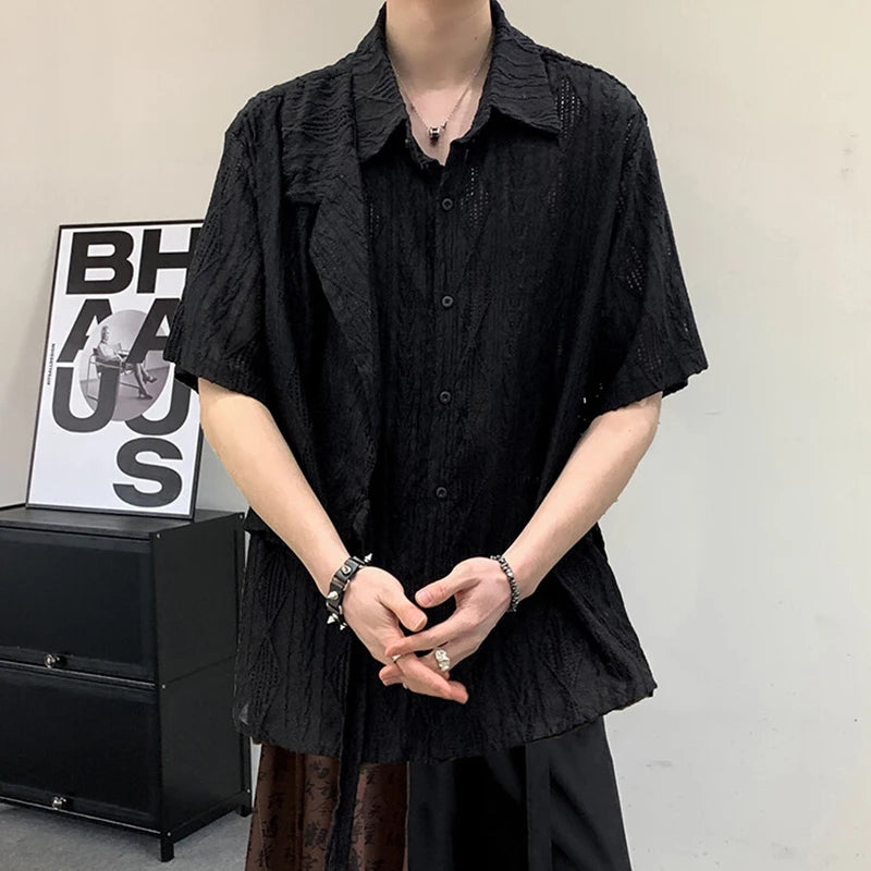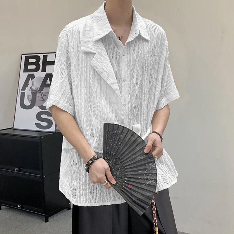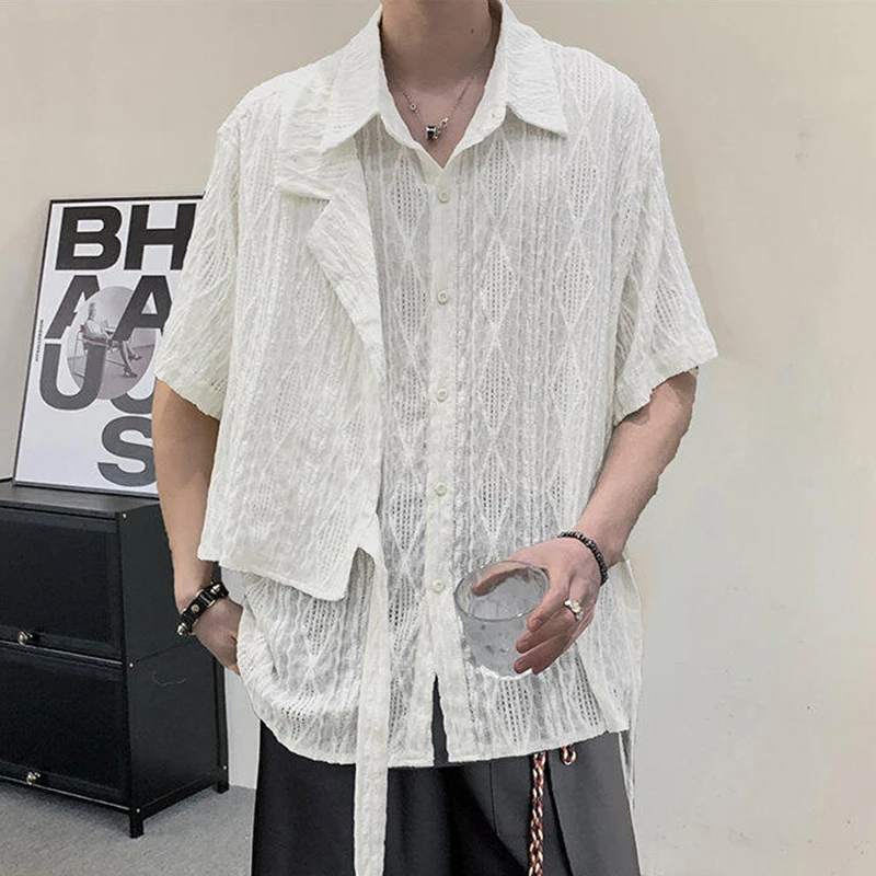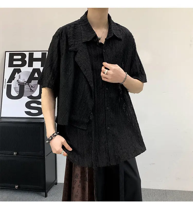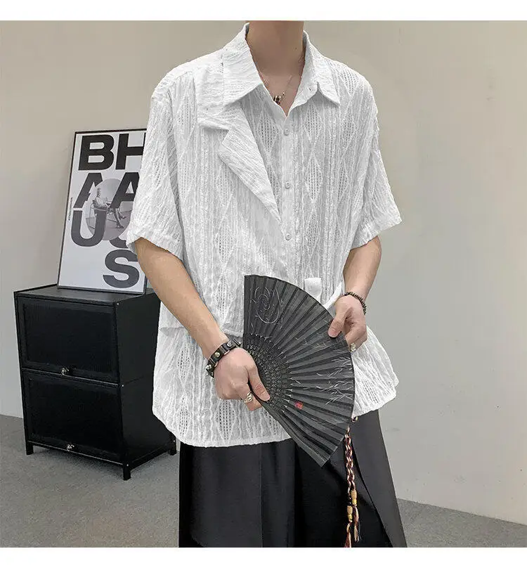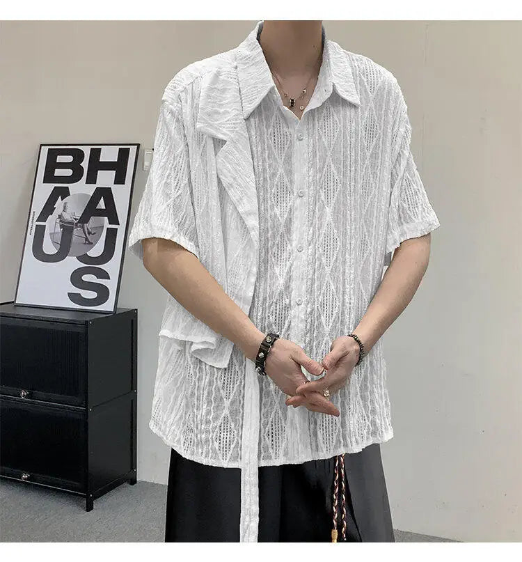 WIAOFELLAS - Short Sleeved Men's Shirts Casual Solid Color Hollow Out Jacquard Lace-up Loose Single Breasted Male Tops Trendy