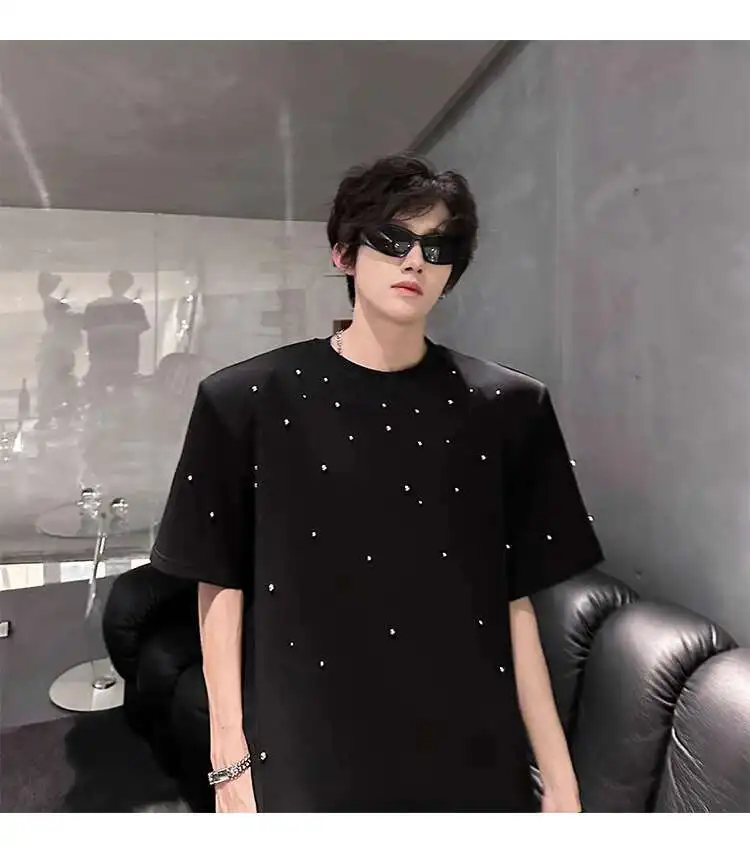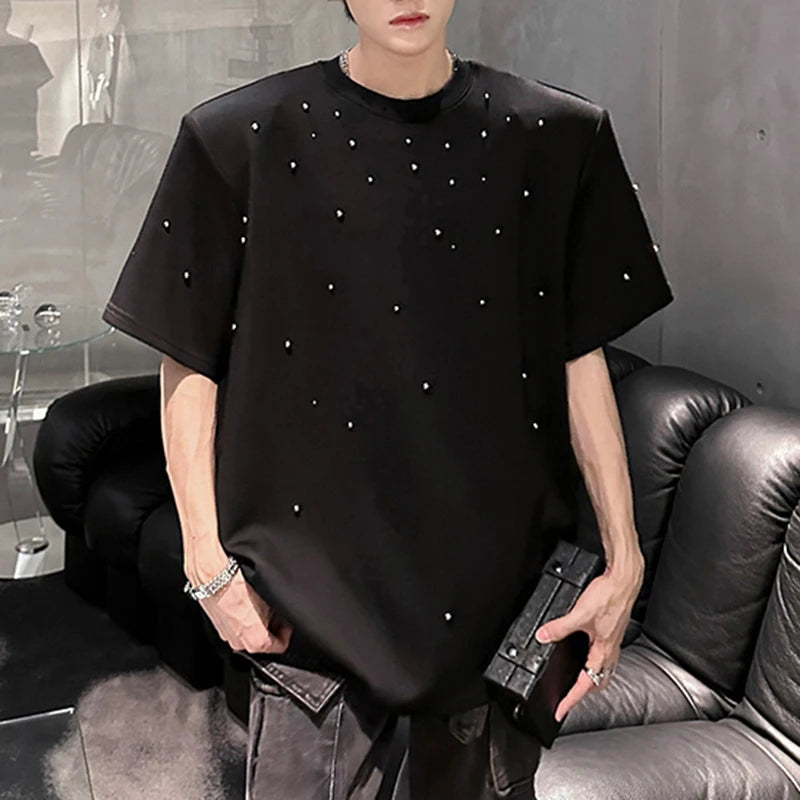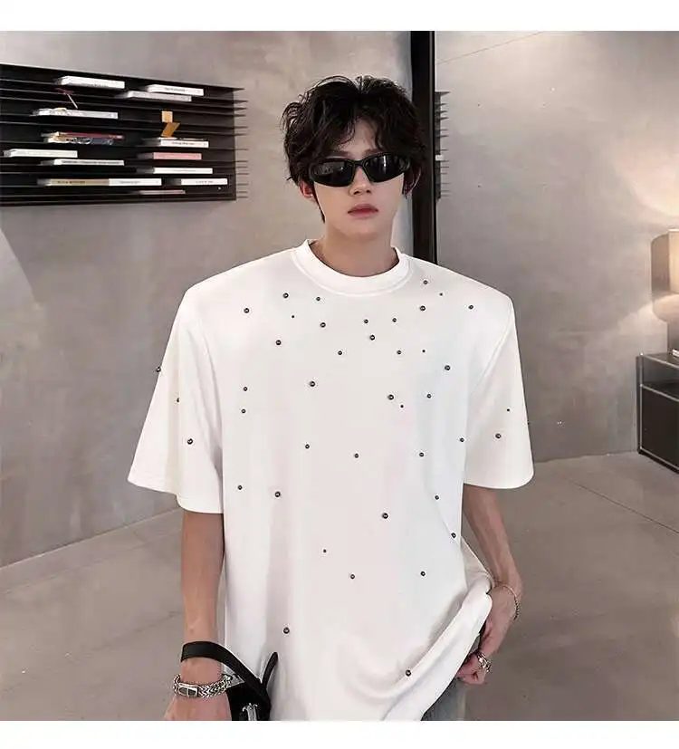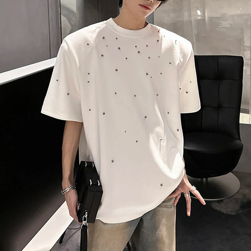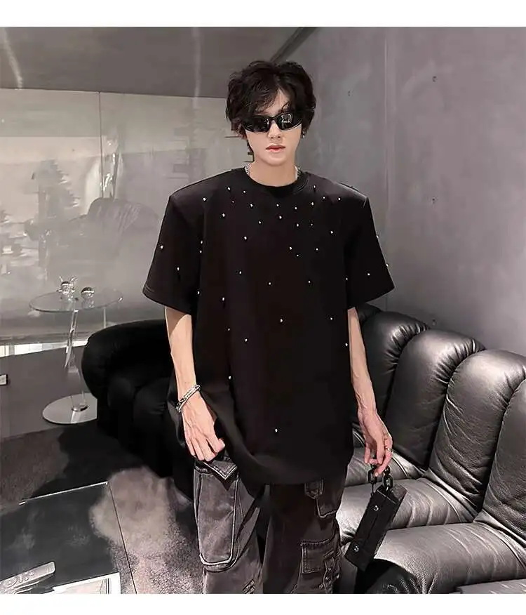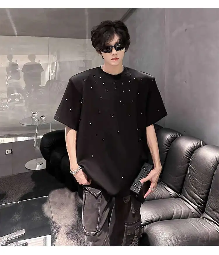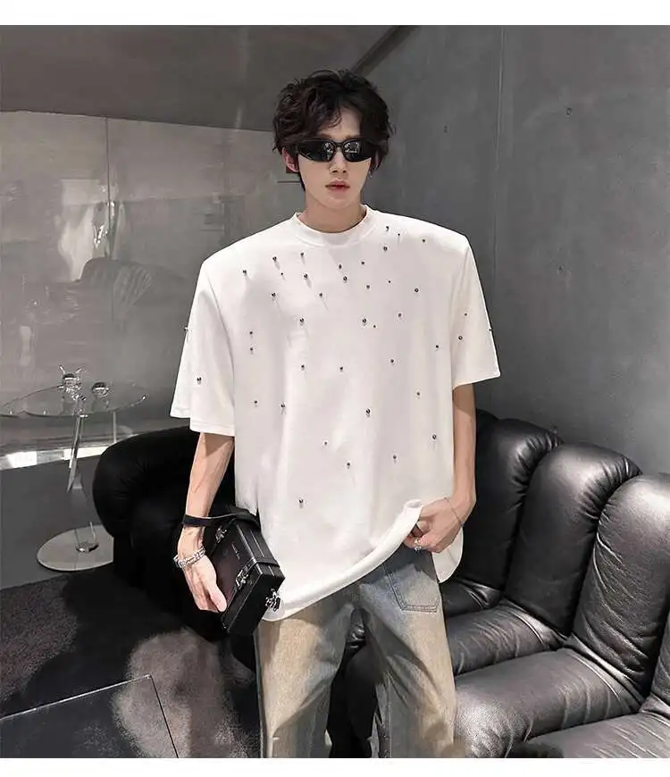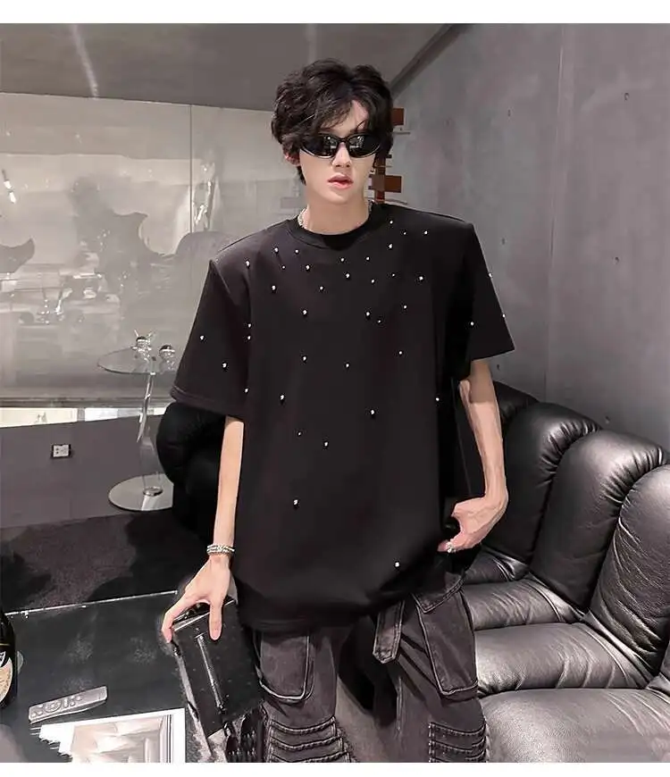 WIAOFELLAS - Shoulder Padded Men's Tees Handmade Pearl Design Simple Solid Color Tops Summer Short Sleeved Loose Male T-shirts