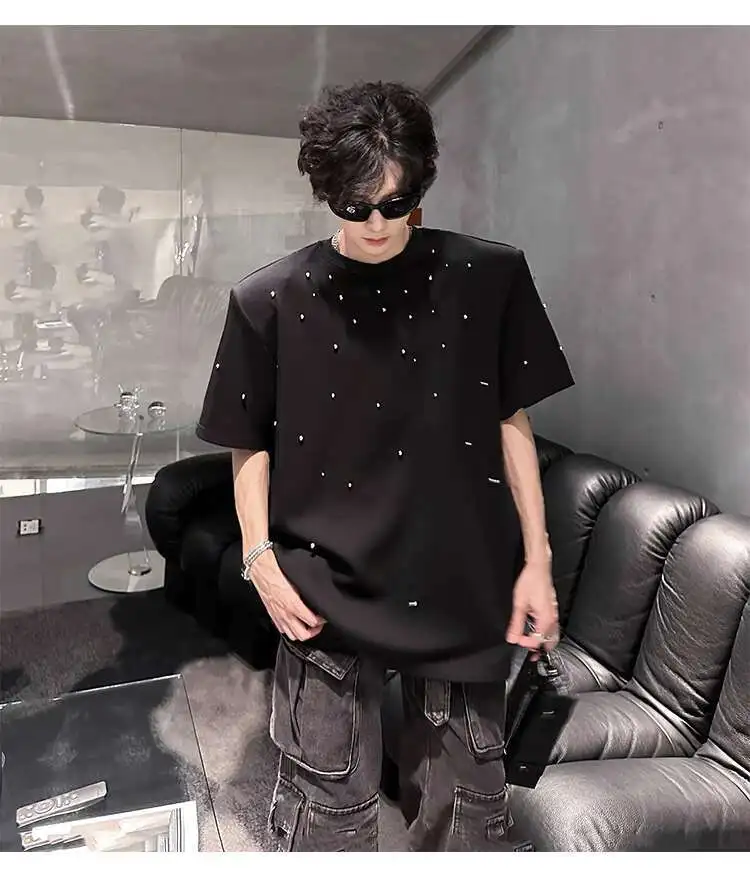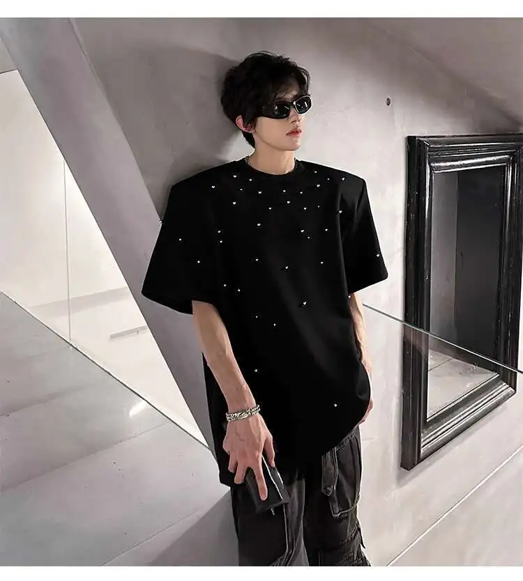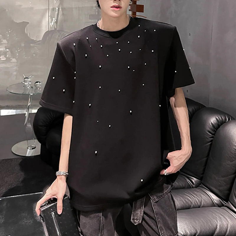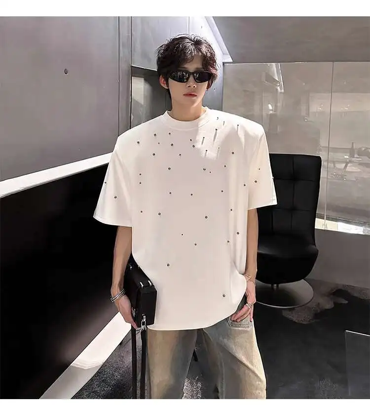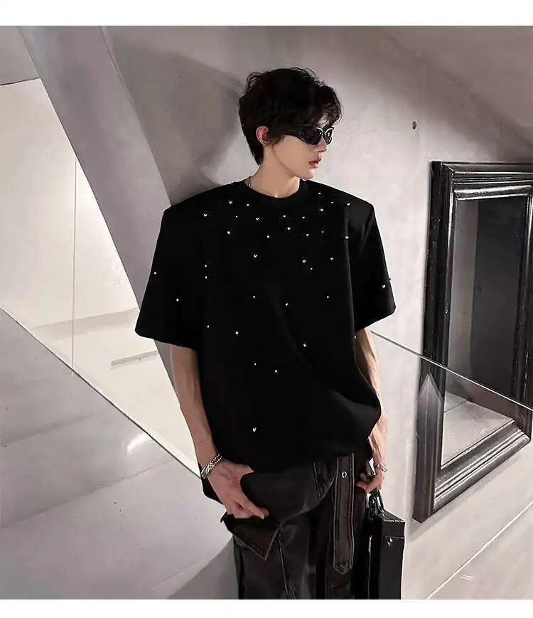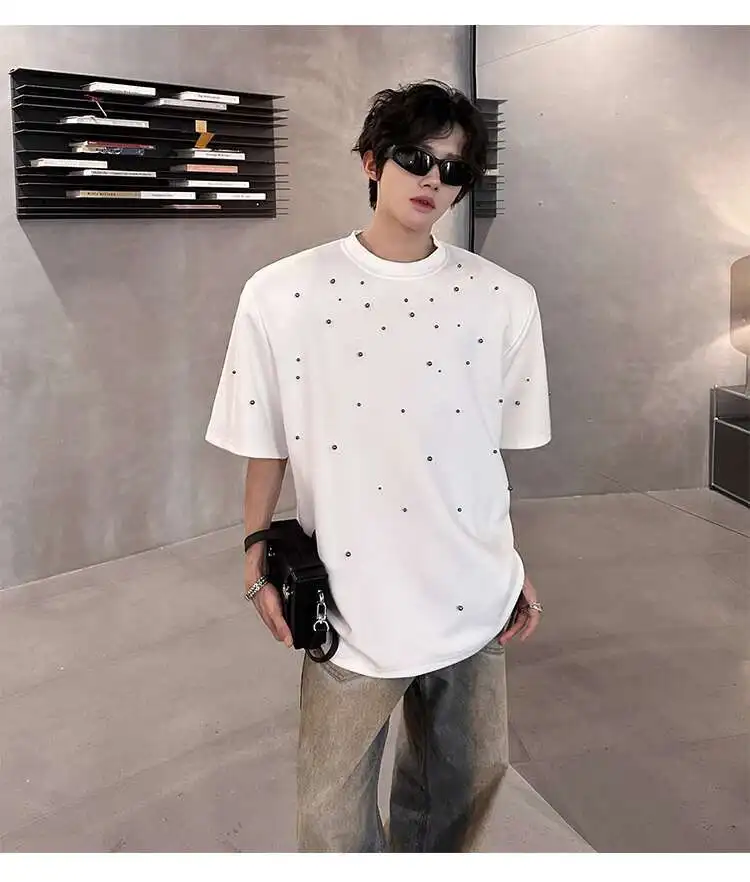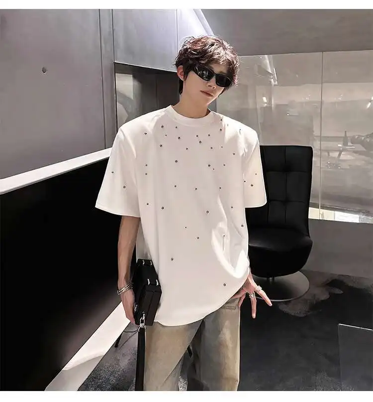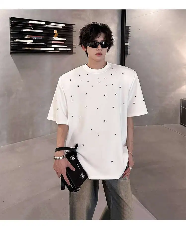 WIAOFELLAS - Shoulder Padded Men's Tees Handmade Pearl Design Simple Solid Color Tops Summer Short Sleeved Loose Male T-shirts