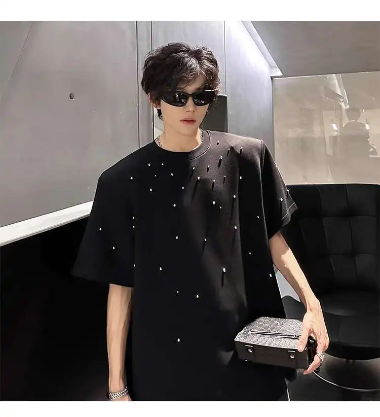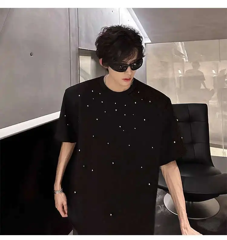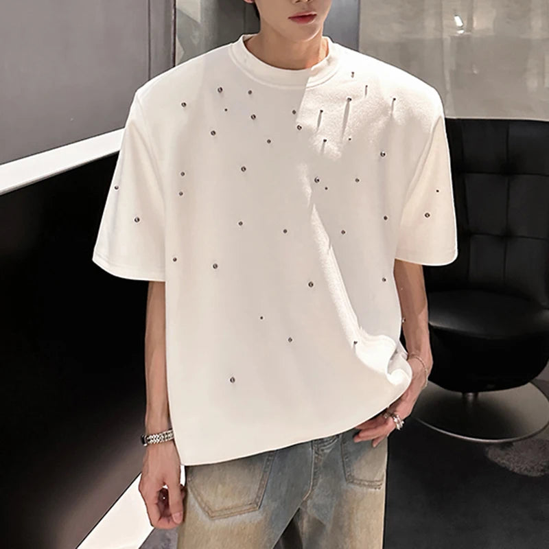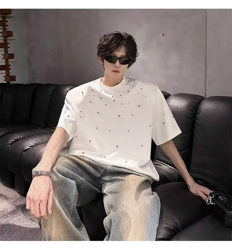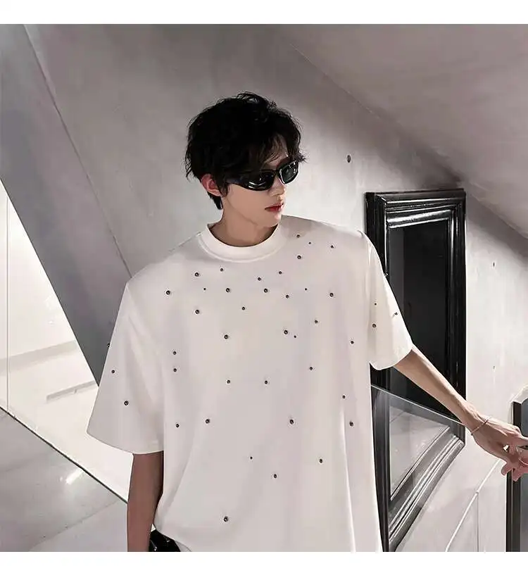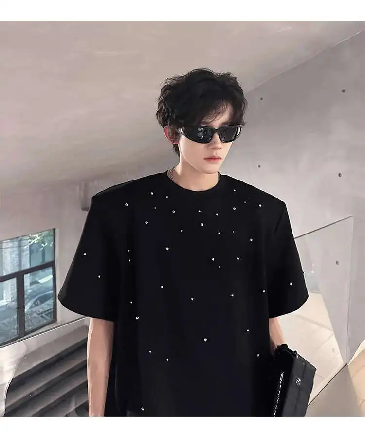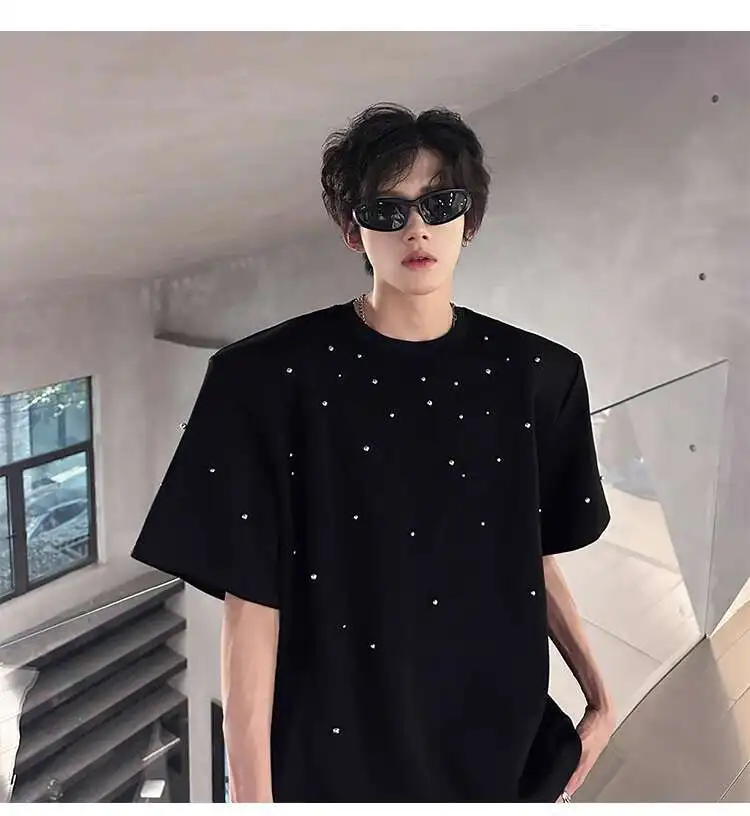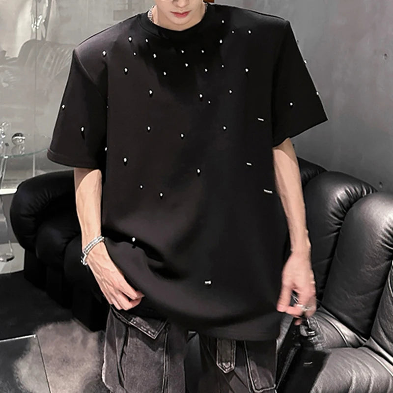 WIAOFELLAS - Shoulder Padded Men's Tees Handmade Pearl Design Simple Solid Color Tops Summer Short Sleeved Loose Male T-shirts