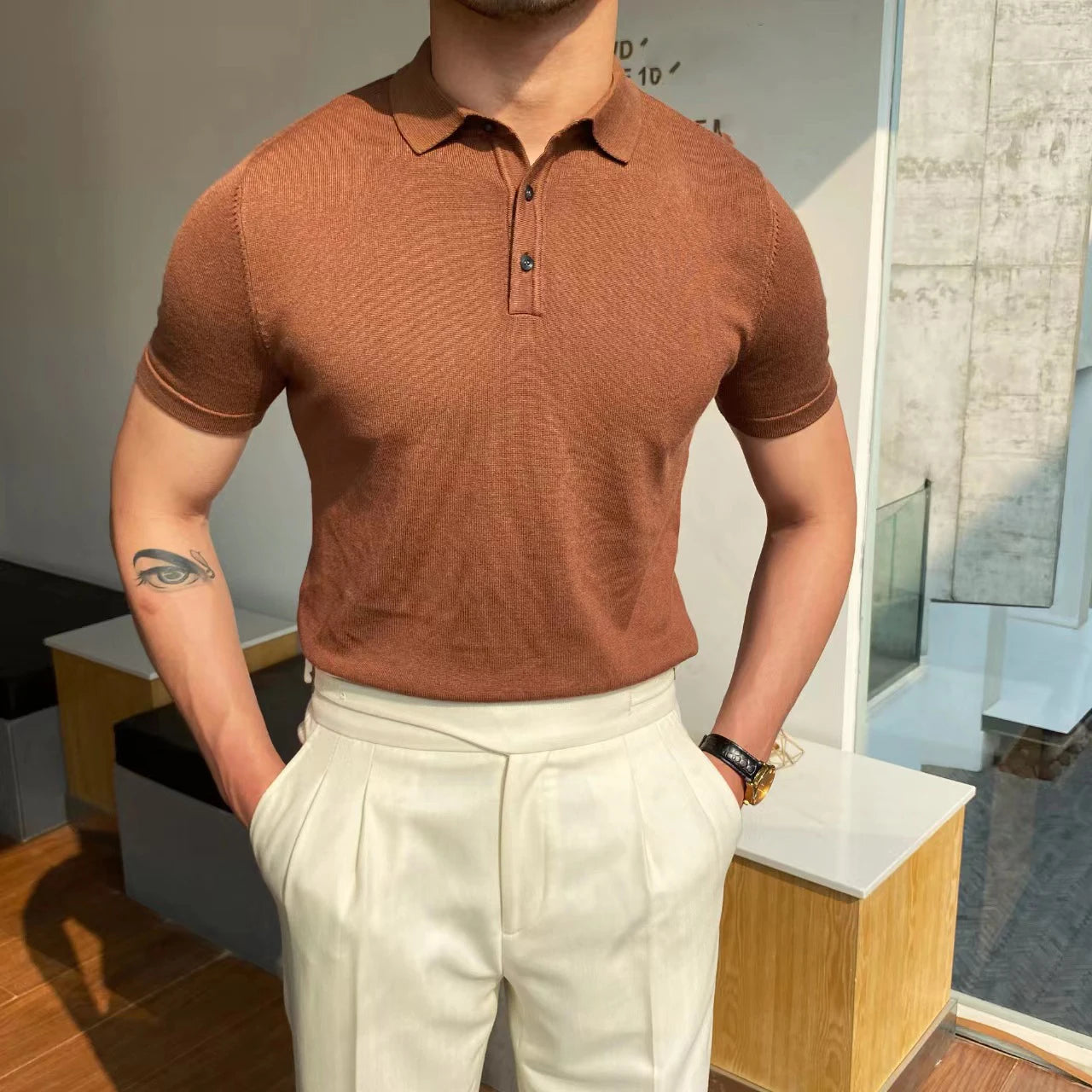WIAOFELLAS - Spring Summer Knit Polo Shirt Men Casual Turn-down Collar Button-up Fashion Striped Solid Slim Tops Ice Silk Fabric T-shirt