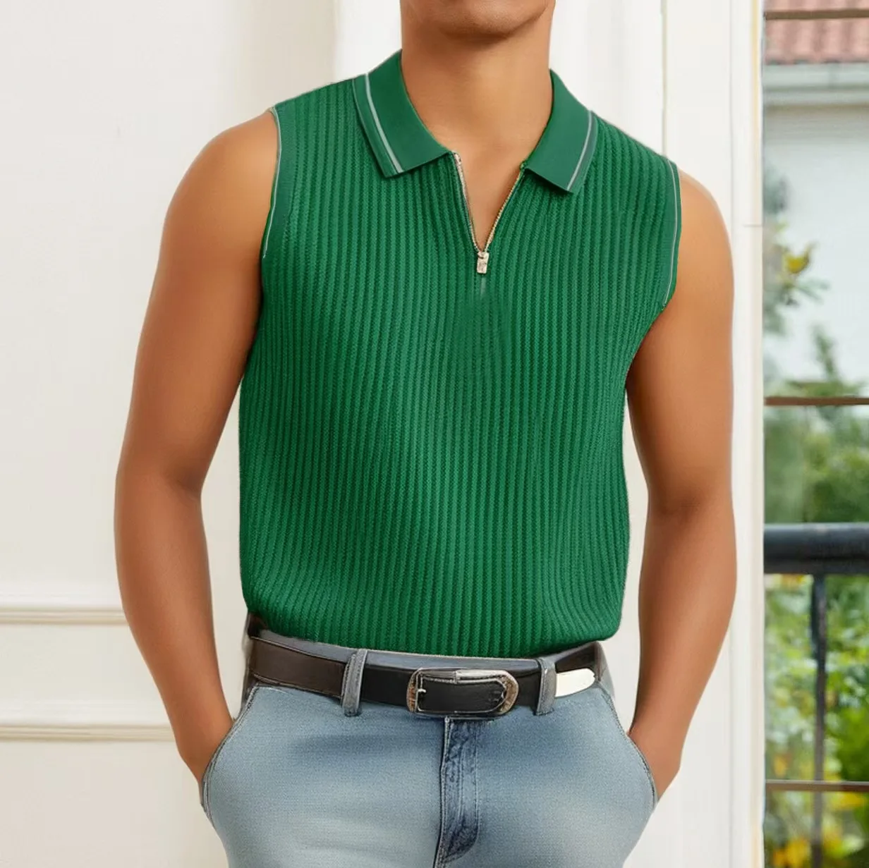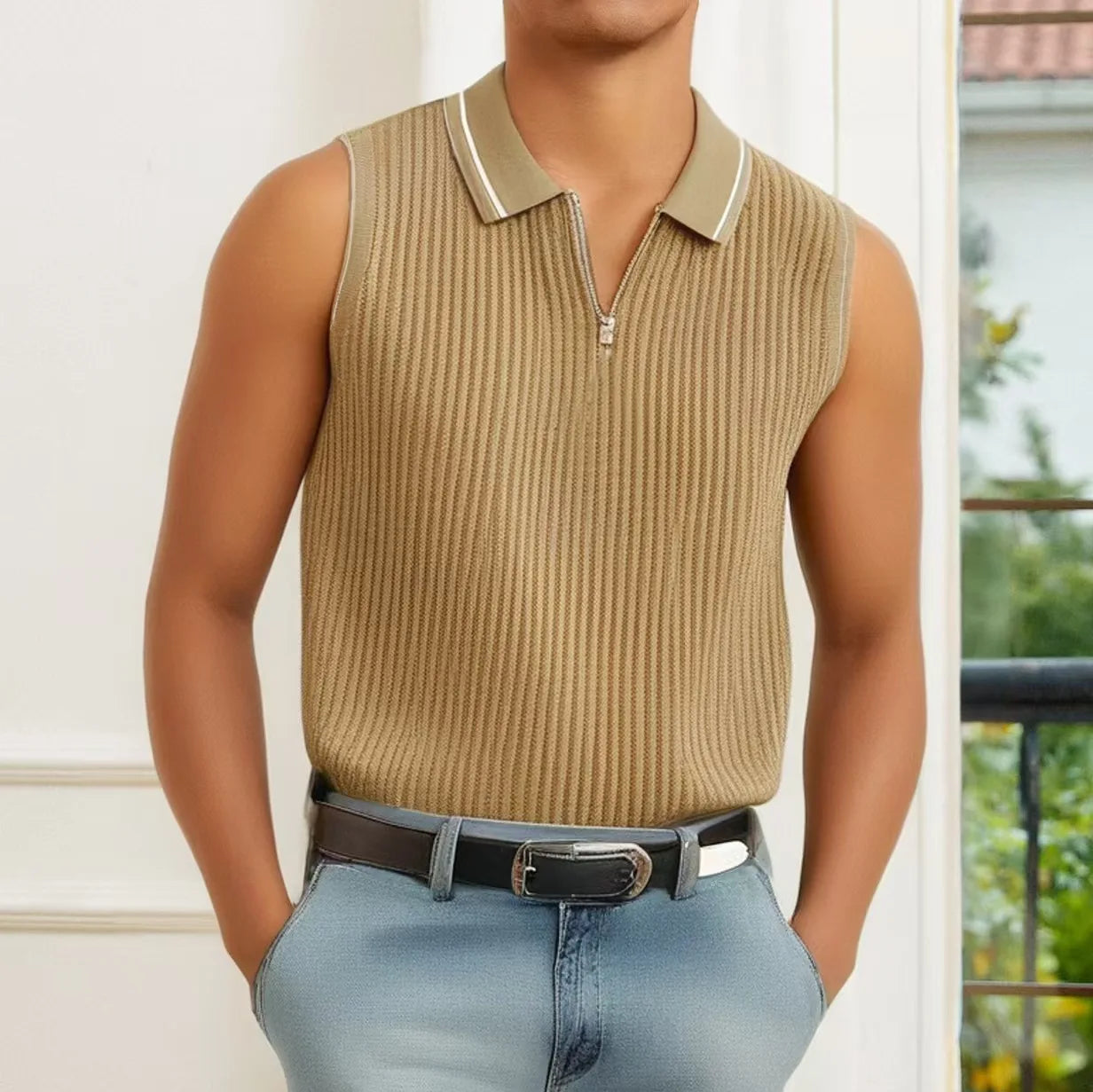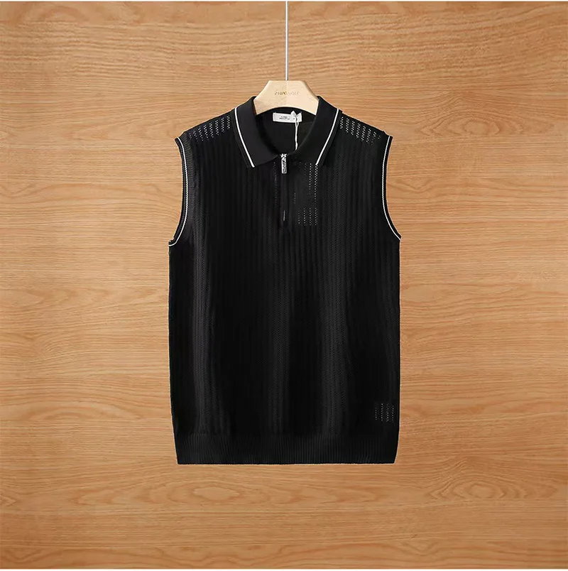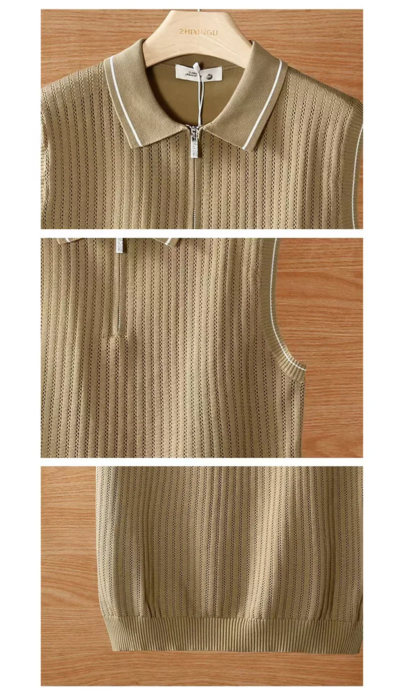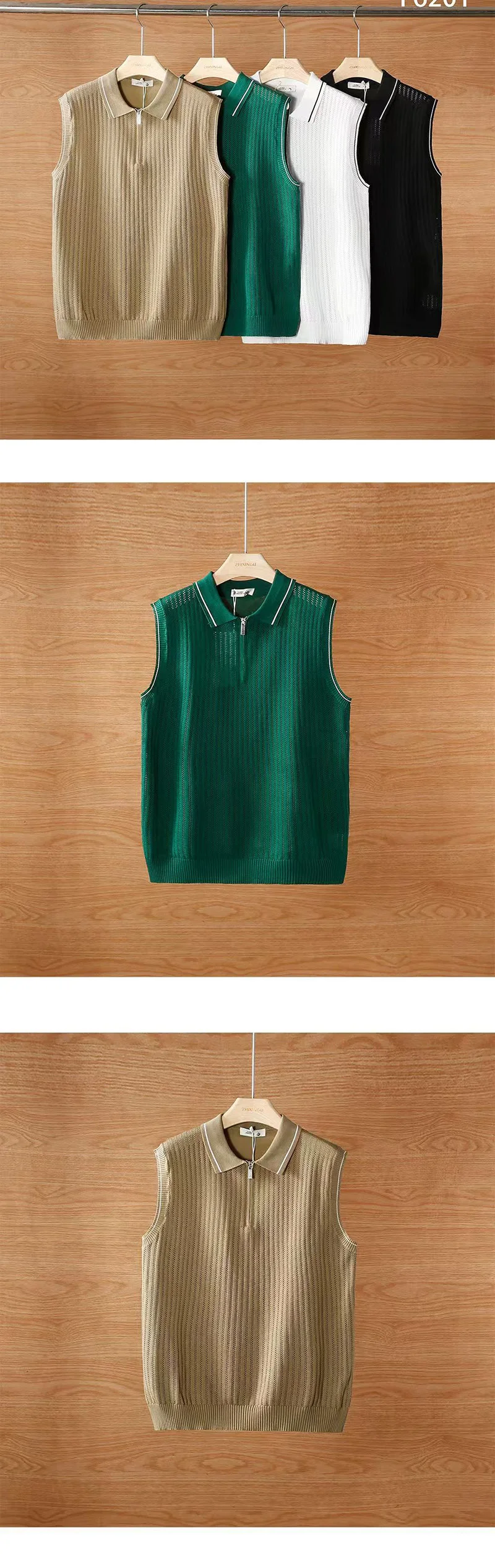 WIAOFELLAS - Spring Summer New Vintage Turn-down Collar Zipper Knit Polo Shirt Menasual Solid Sleeveless Tank Top Polo Tops Mens Streetwear