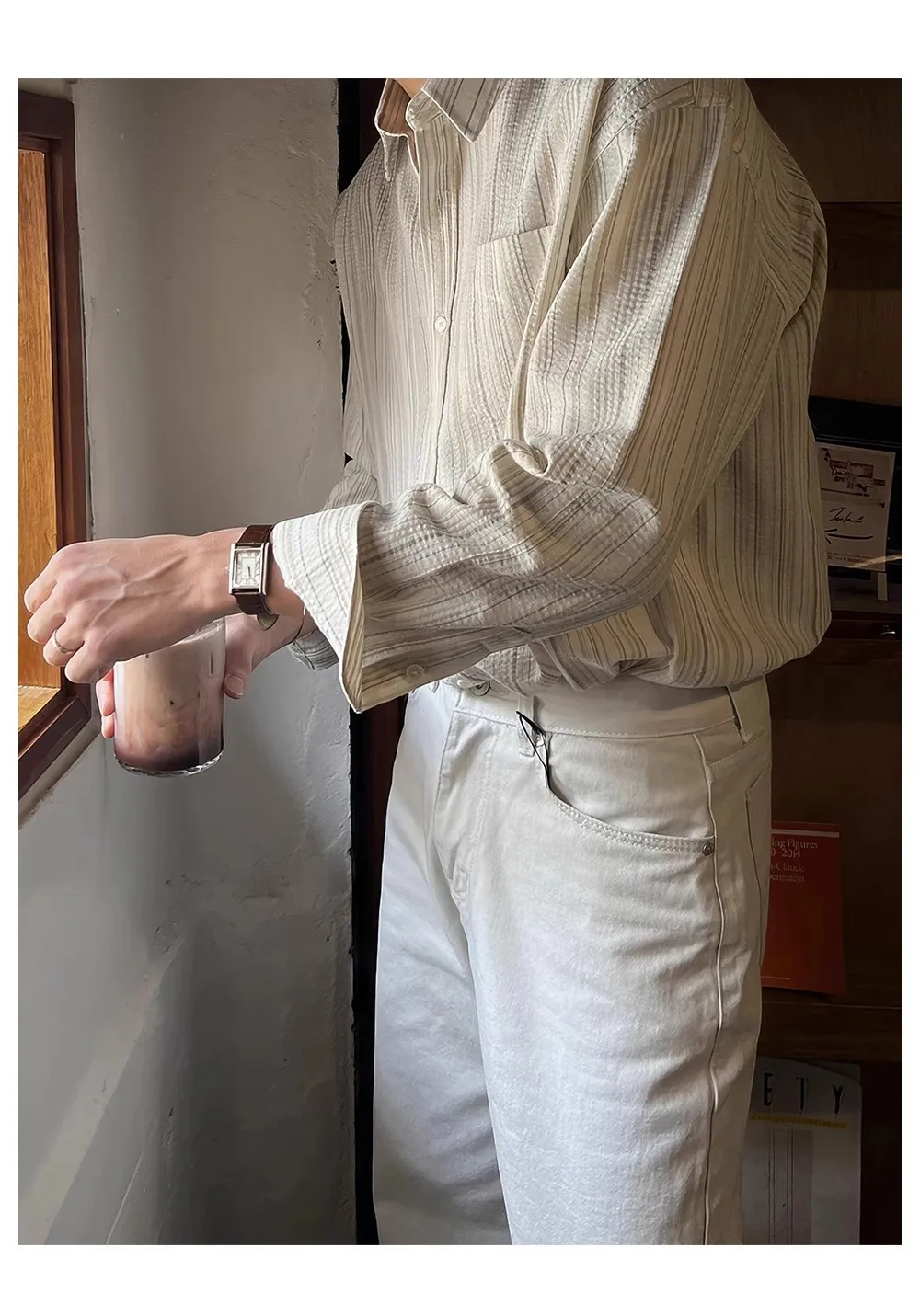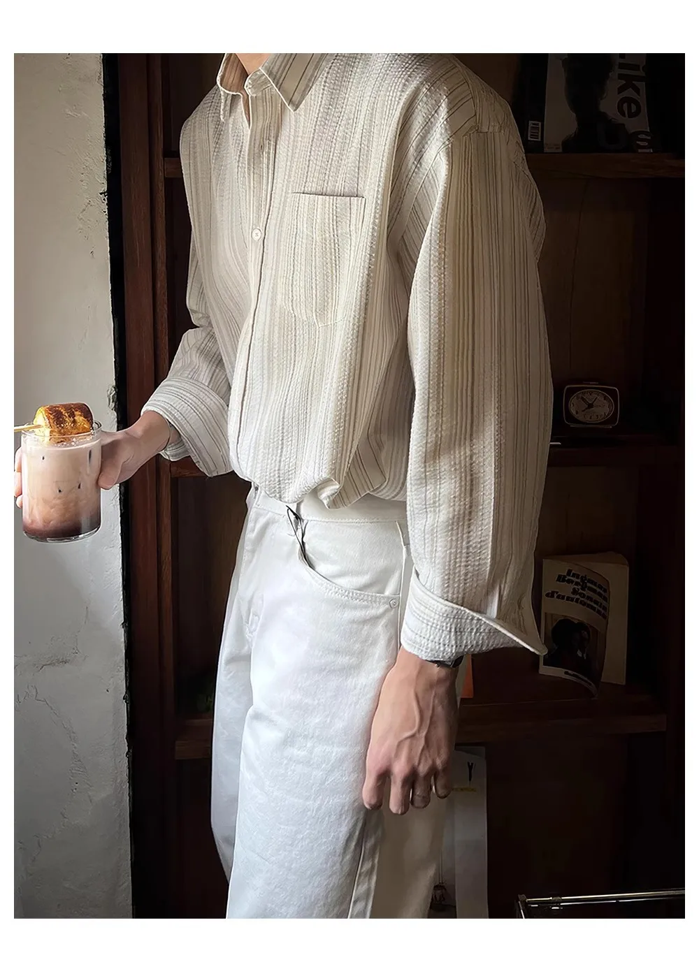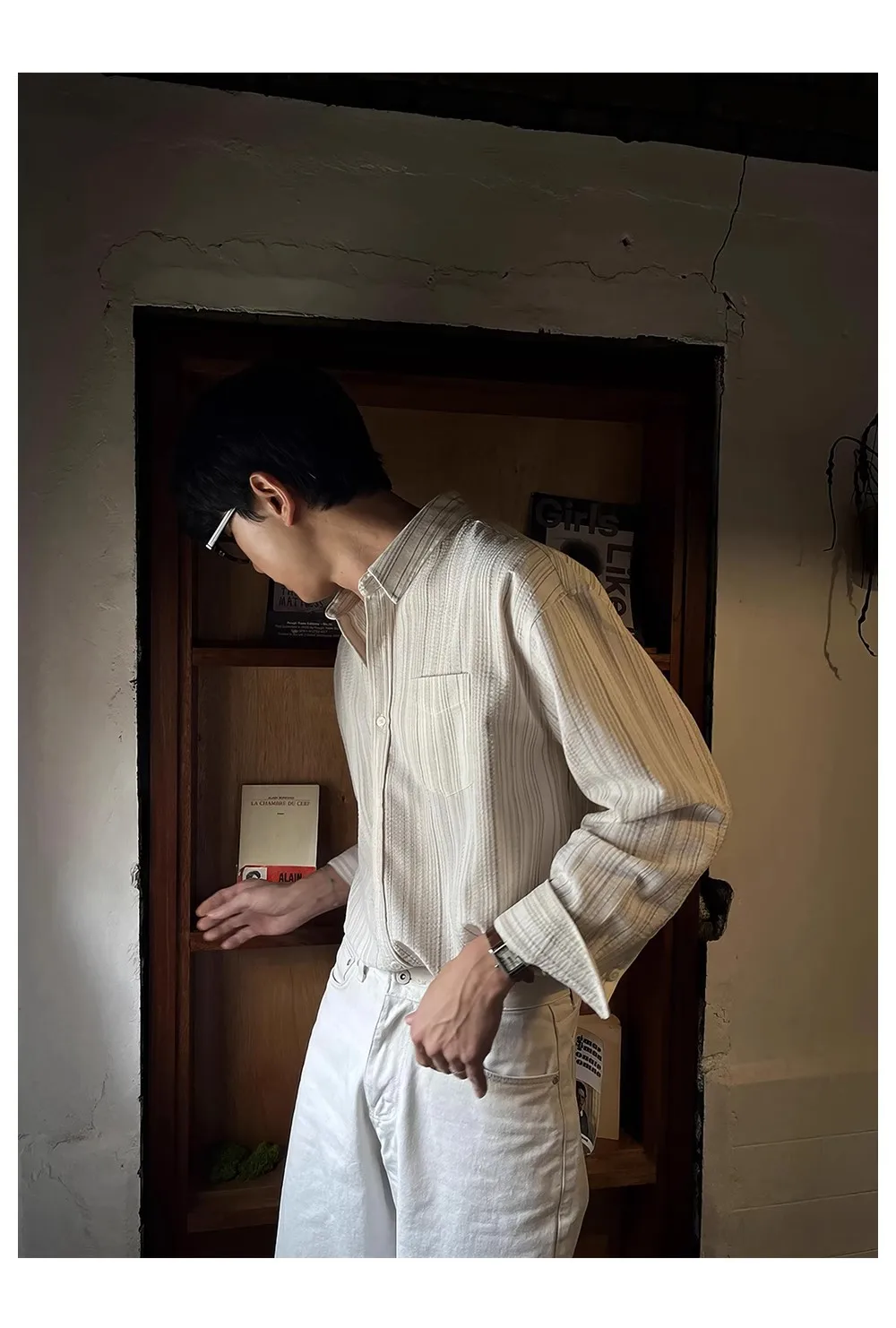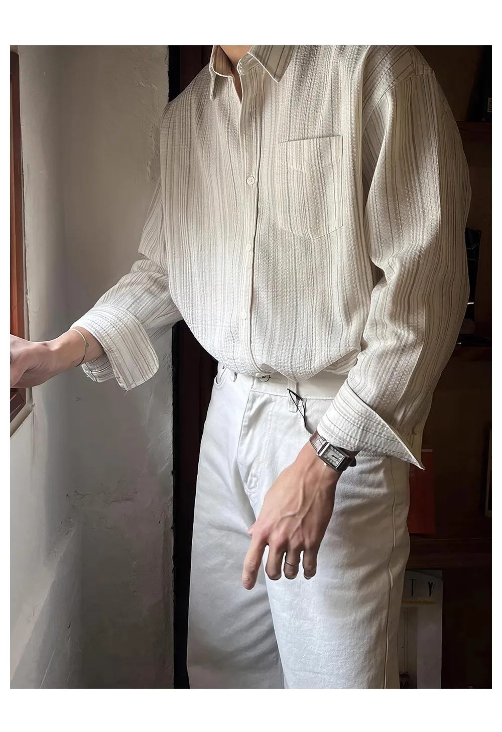 WIAOFELLAS - Stripe Long Sleeve Shirt Men Early Autumn High Quality Texture Casual Wrinkle Free Drape
