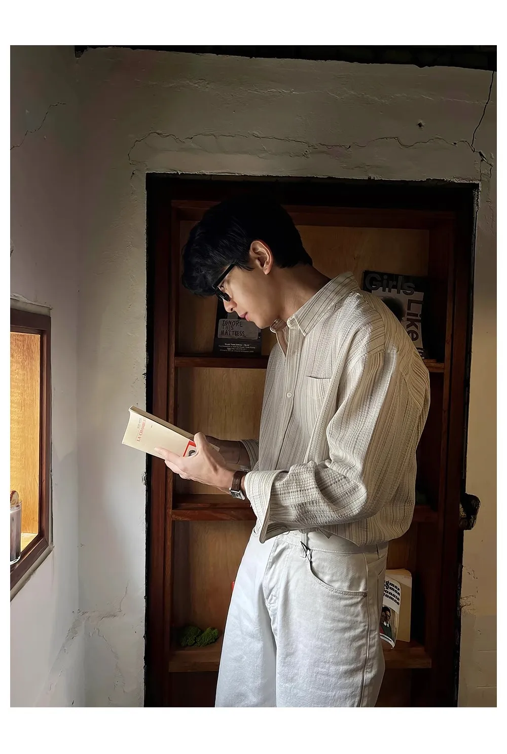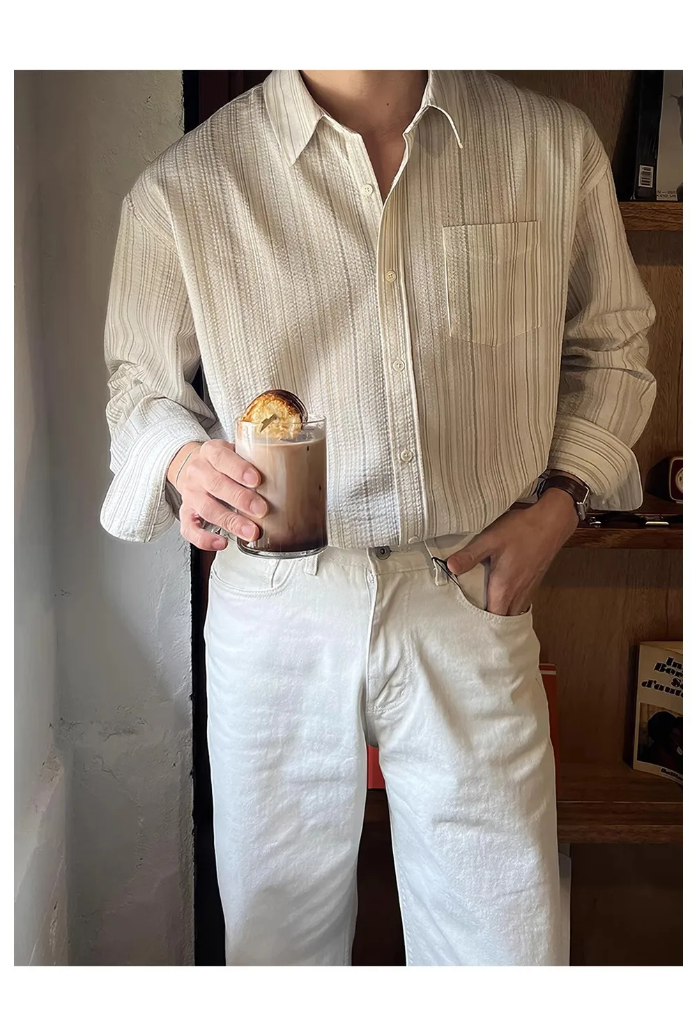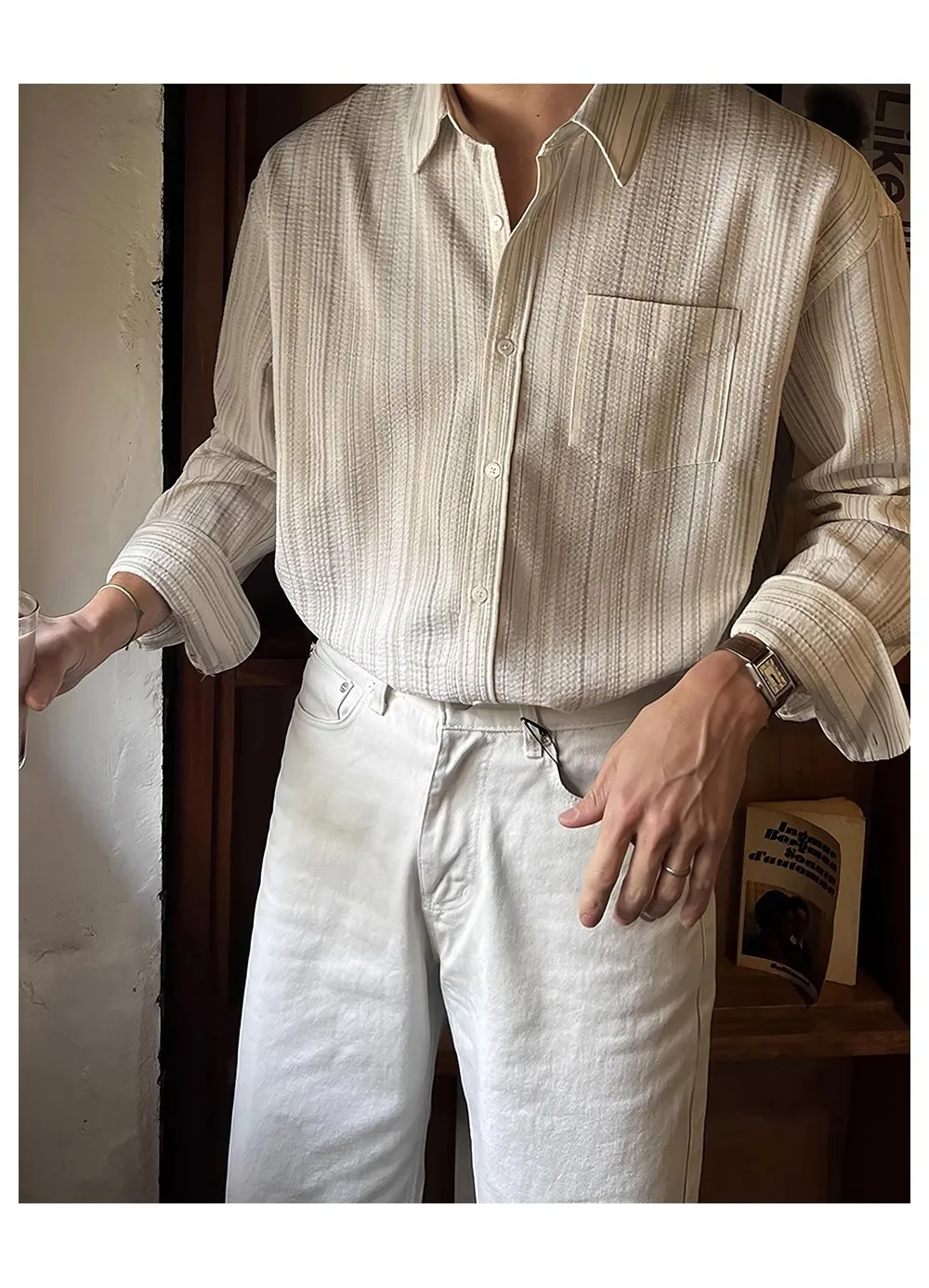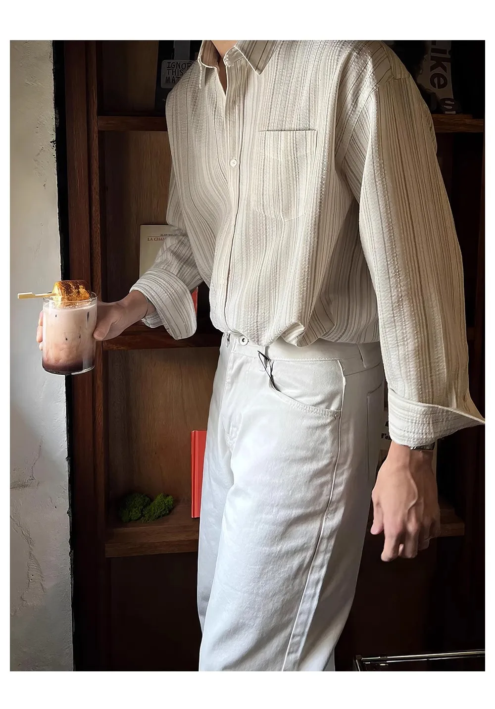 WIAOFELLAS - Stripe Long Sleeve Shirt Men Early Autumn High Quality Texture Casual Wrinkle Free Drape