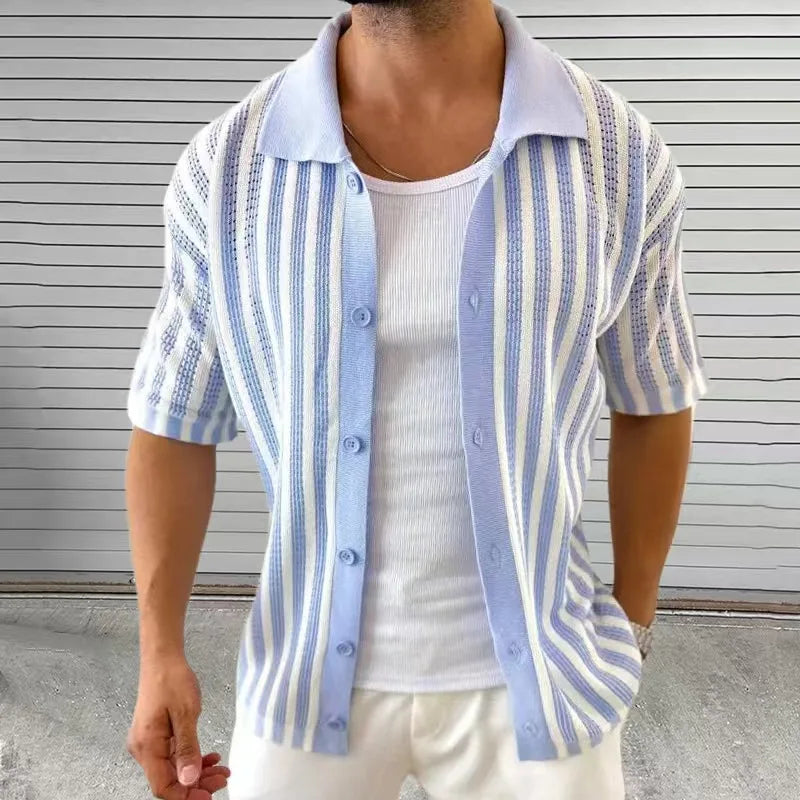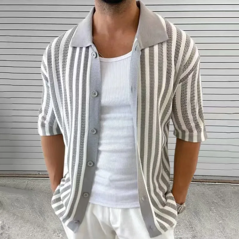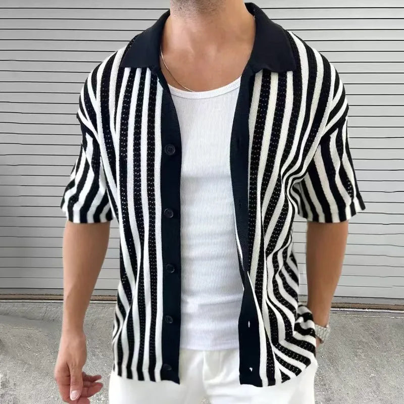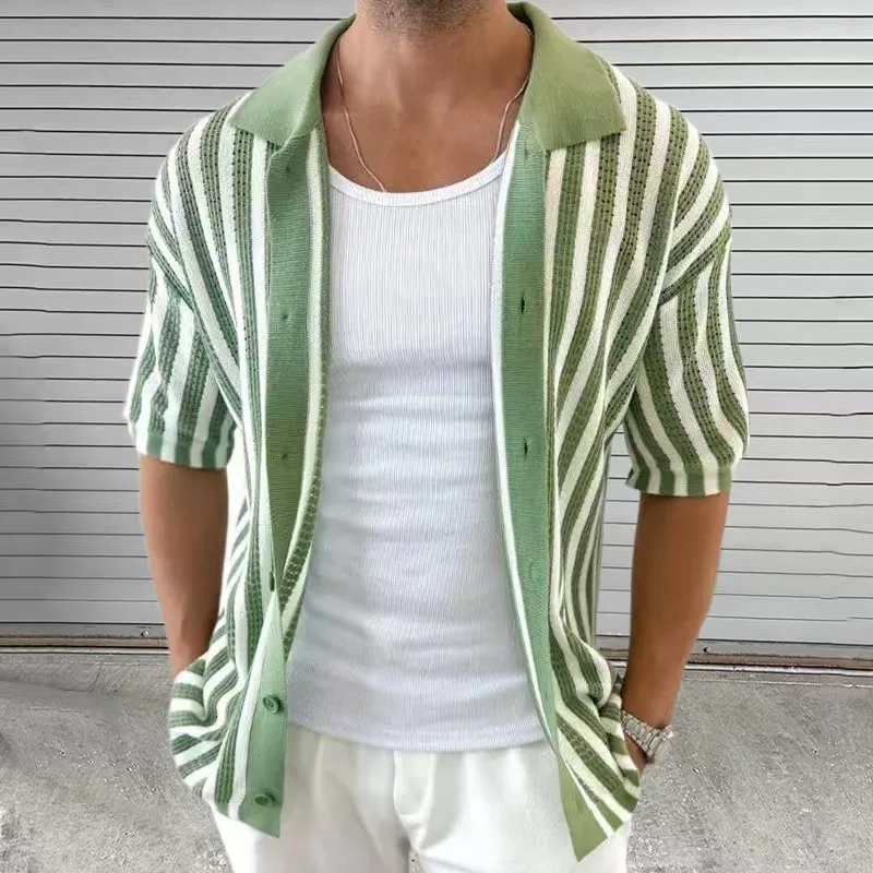 WIAOFELLAS - Summer Elegant Striped Men's Knitted Polo Shirts Short Sleeve Turn-down Collar Button Cardigan Top Men's Casual Knitted Shirt