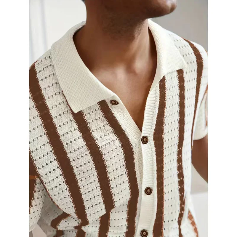 WIAOFELLAS - Summer New Men Knitted Shirt Lapel Casual Tees Shirts Business Social Striped Hollow Out Knit Cardigan Men Clothing Steetwear