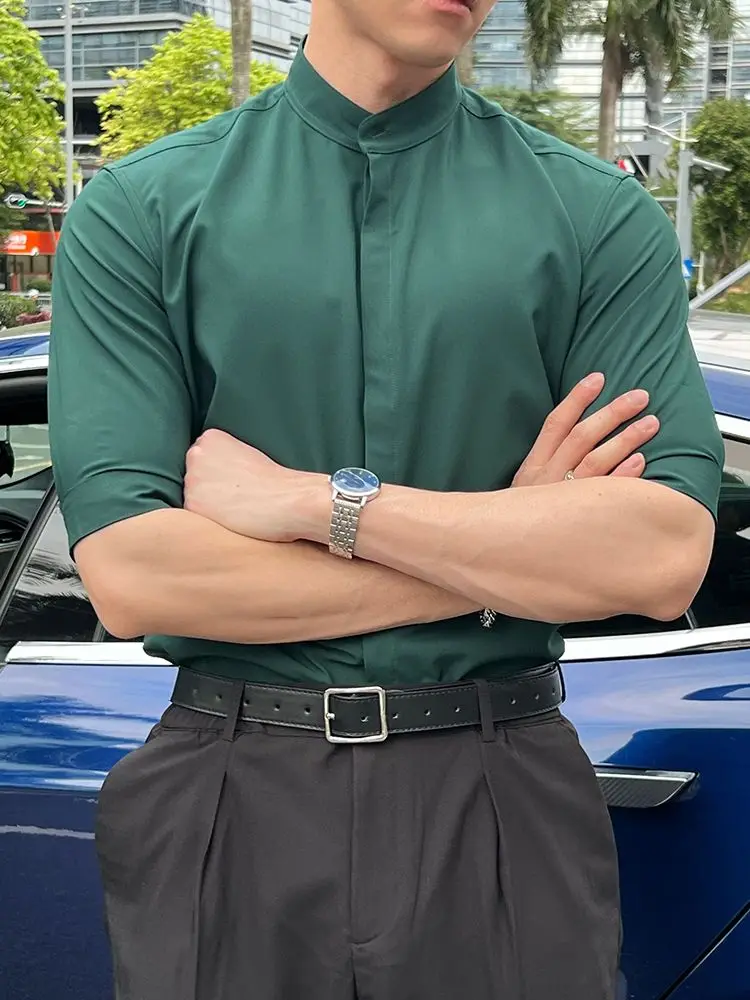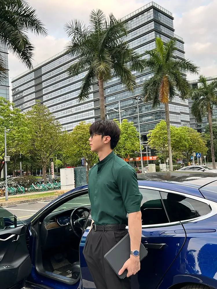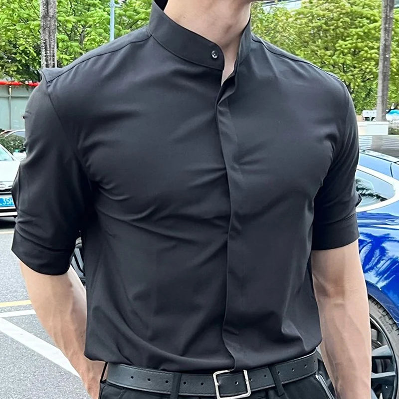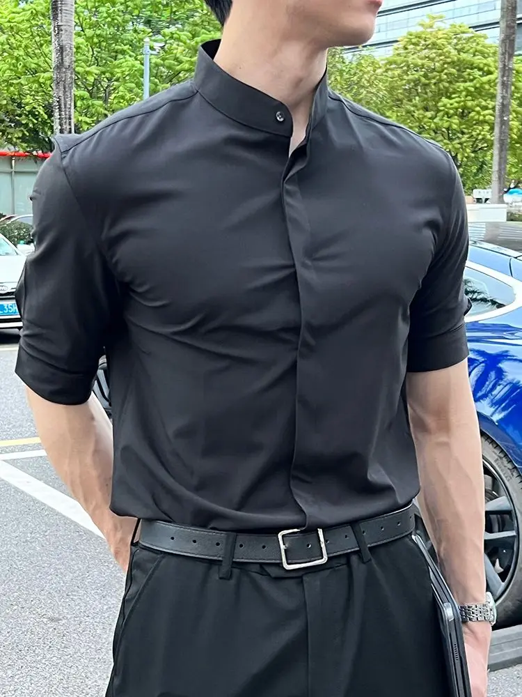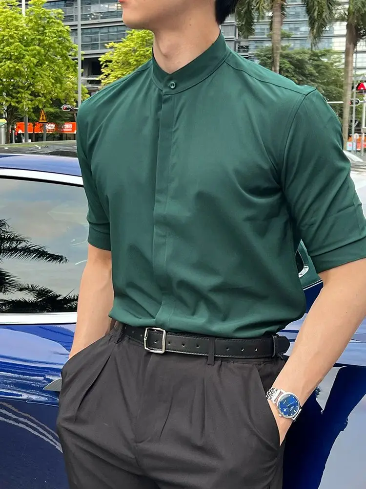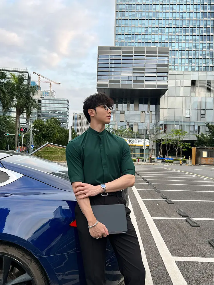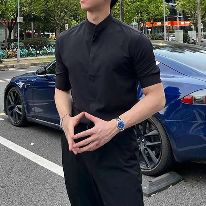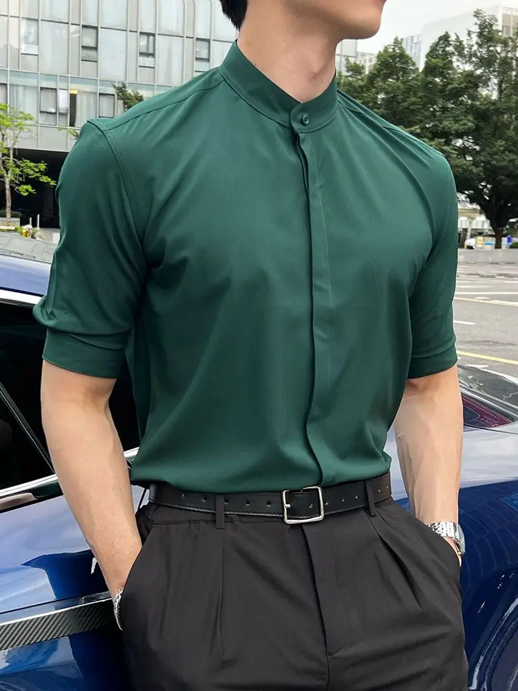 WIAOFELLAS - Summer New Stand Collar Fashion Half Sleeve Shirt Man High Street Casual Slim Button Cardigan Solid Color Office All-match Tops