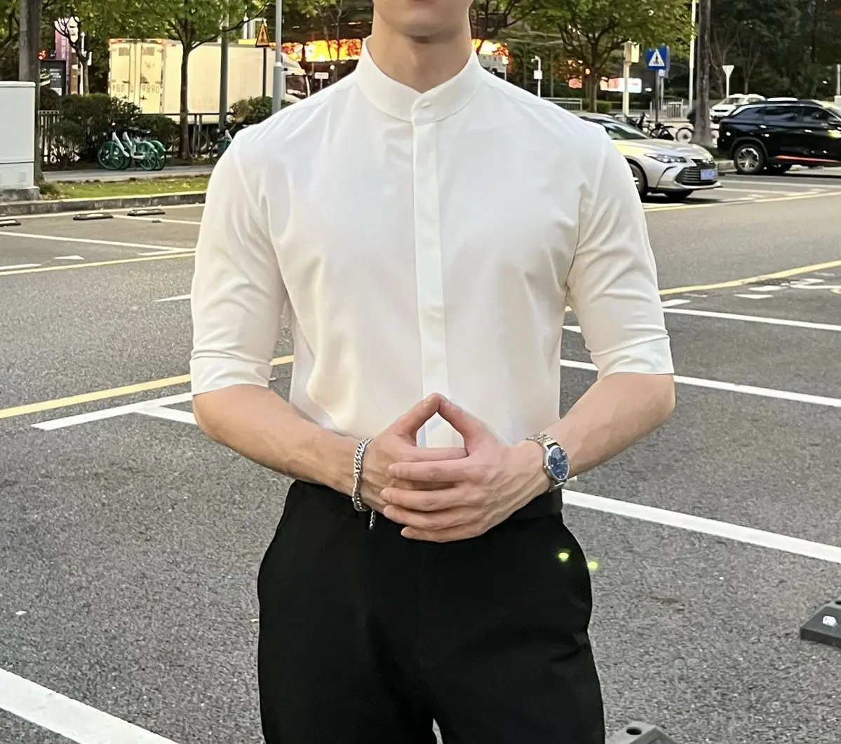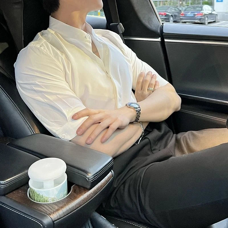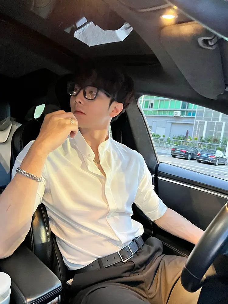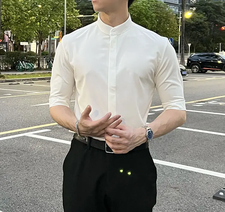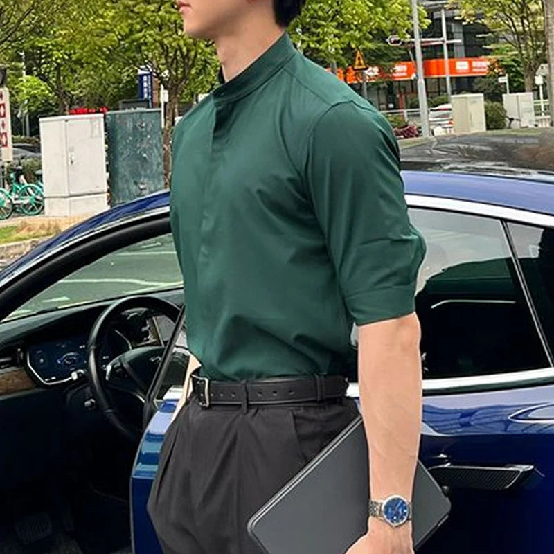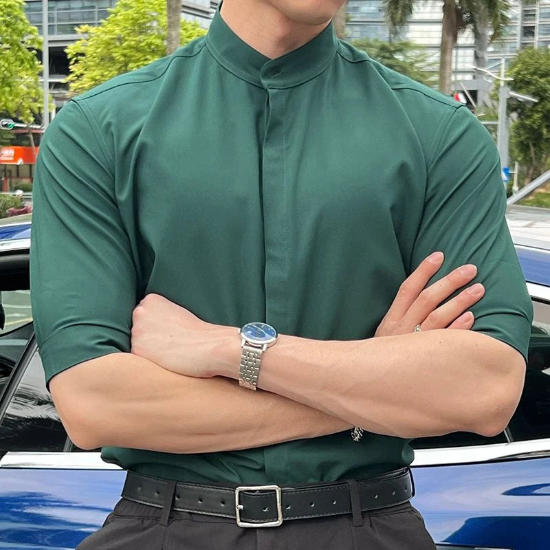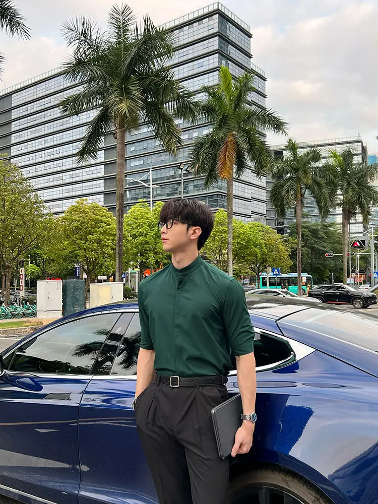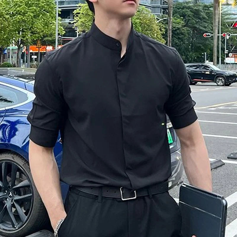 WIAOFELLAS - Summer New Stand Collar Fashion Half Sleeve Shirt Man High Street Casual Slim Button Cardigan Solid Color Office All-match Tops