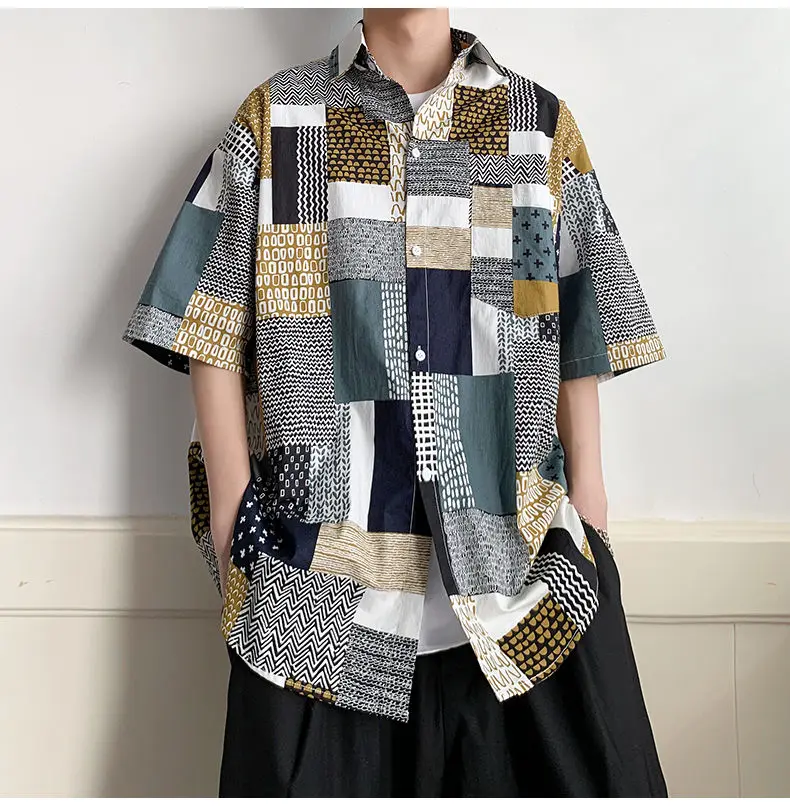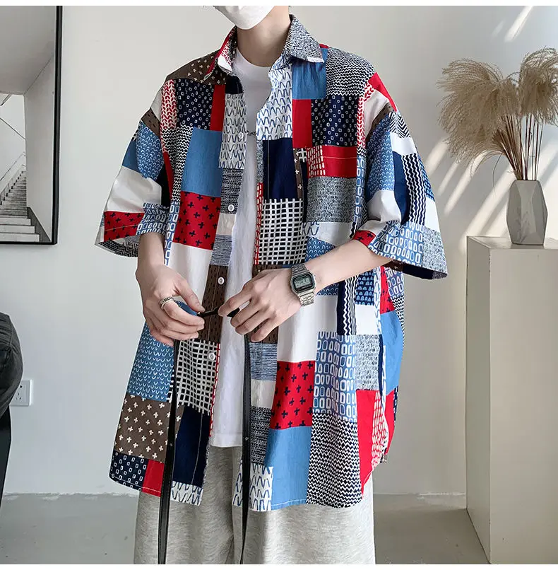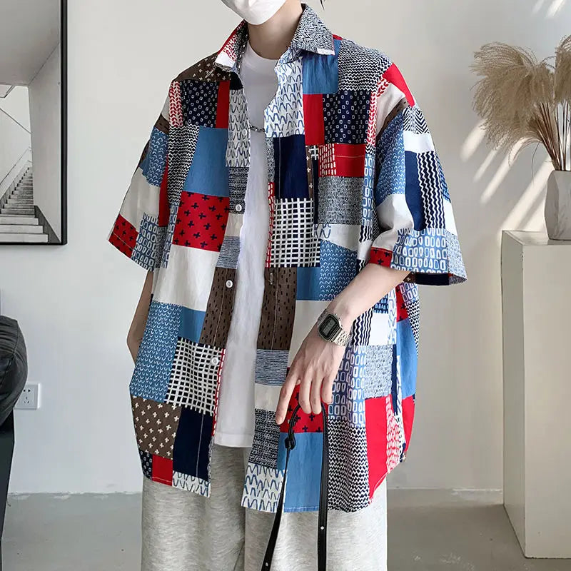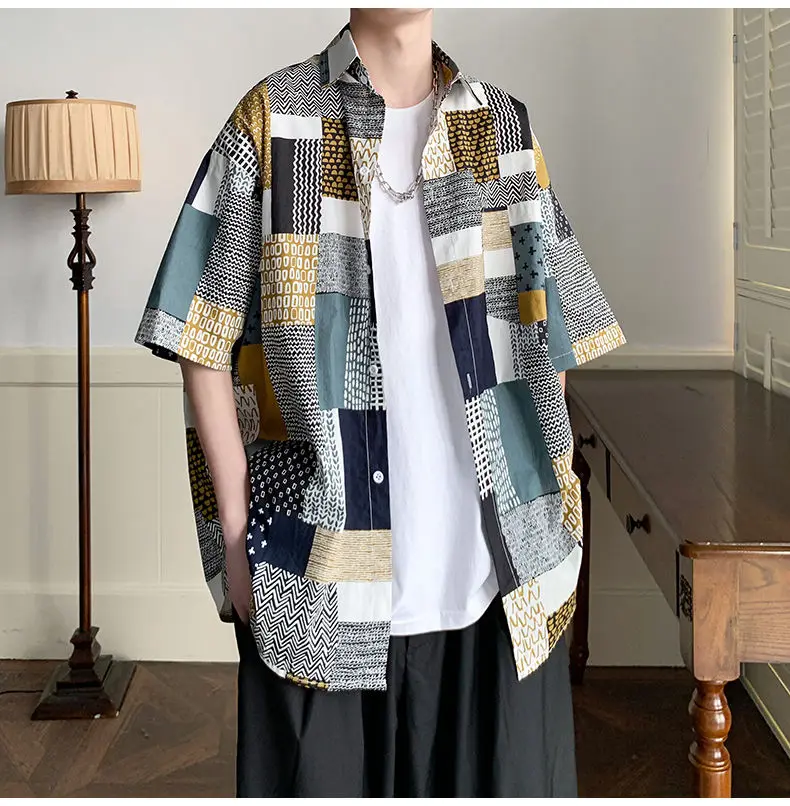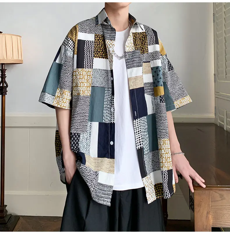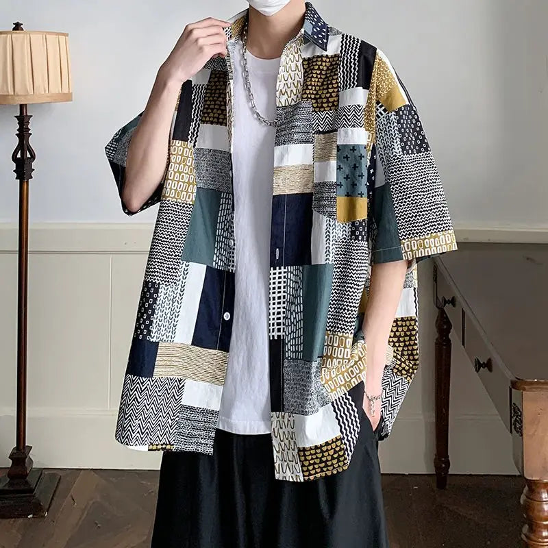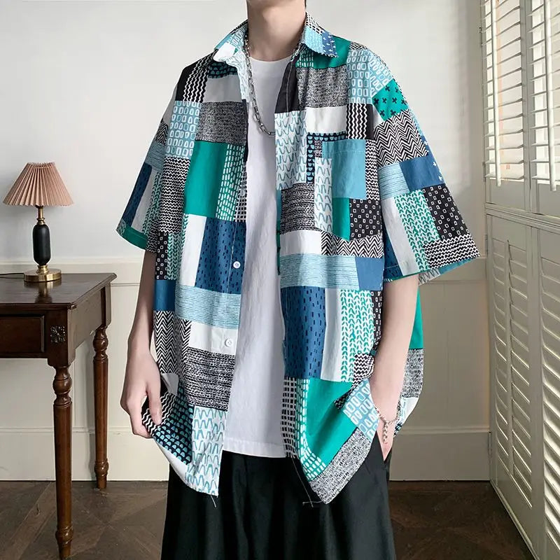 WIAOFELLAS - Summer New Turn-down Collar Fashion Short Sleeve Shirt Man Harajuku Casual Loose Button Cardigan Y2K Printing Pure Cotton Blouse