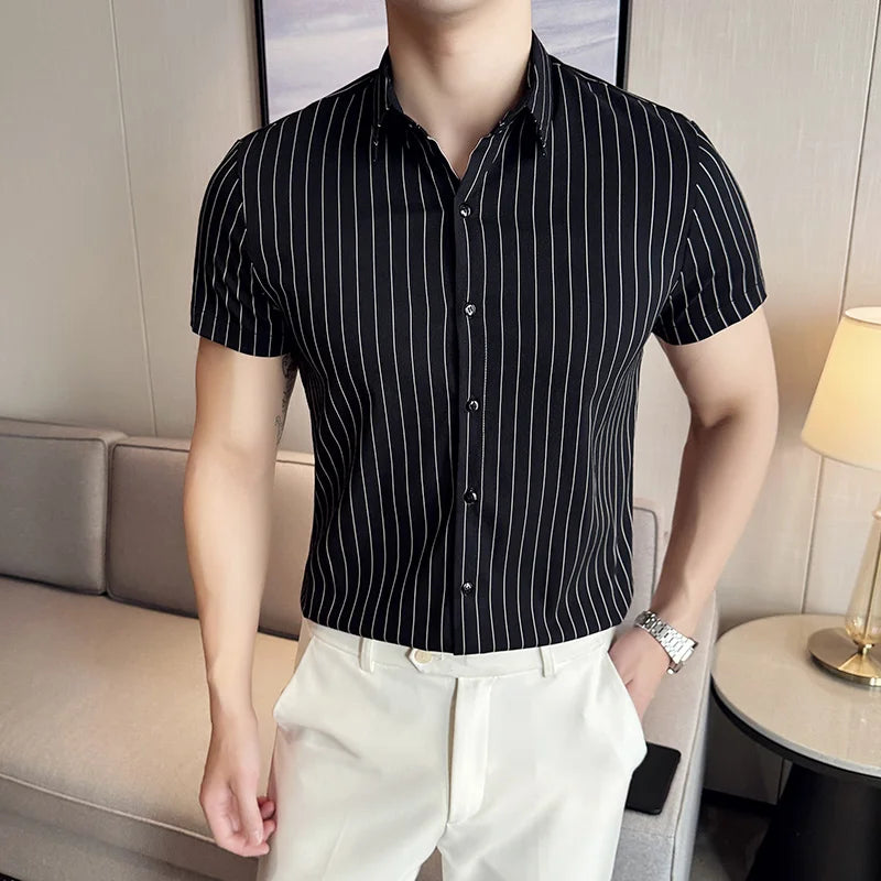 WIAOFELLAS  -  Summer Spring Short Sleeved Silky Shirt Men British Style Striped Printed Slim Mens Shirts Business Handsome Men's Casual Shirt