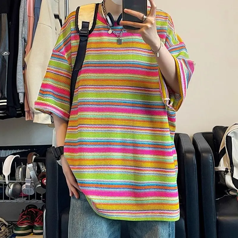 WIAOFELLAS - Summer Striped Print Men O Neck Short Sleeve T Shirt Rainbow Fashion Harajuku Casual Oversized Men Clothing Top Harajuku