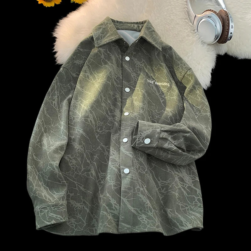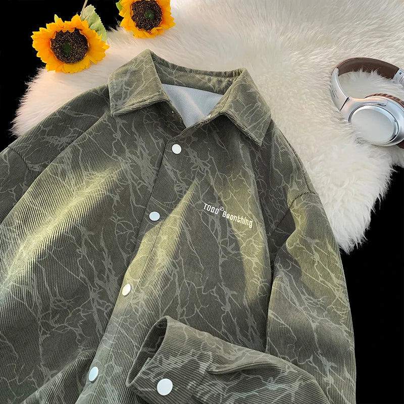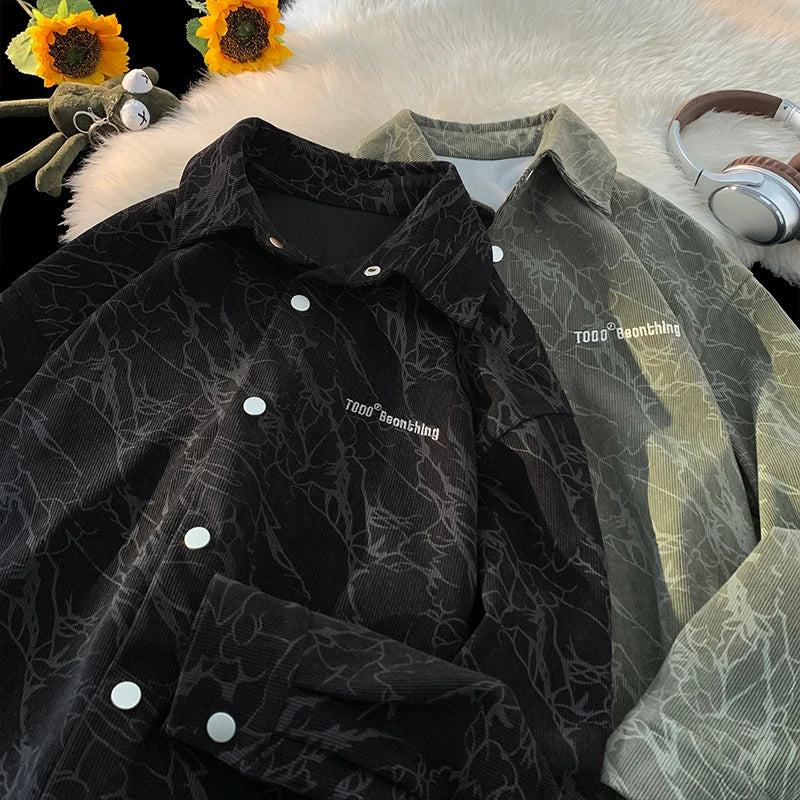 WIAOFELLAS - Trendy Corduroy Long-sleeved Shirt Men's Casual Shirt Embroidery Design Retro Shirt Spring Fashion Printed Buttons Cardigan