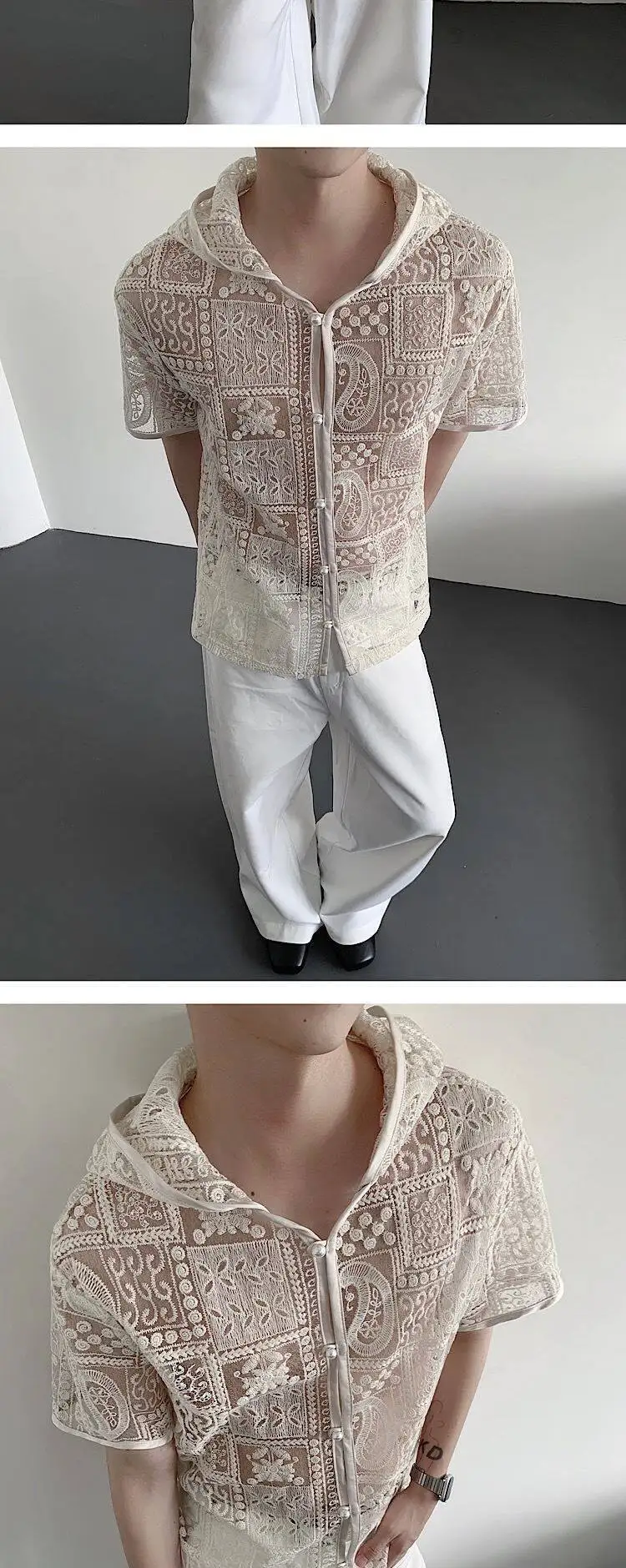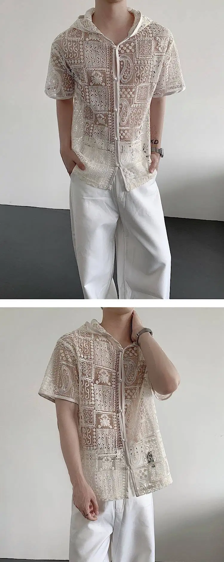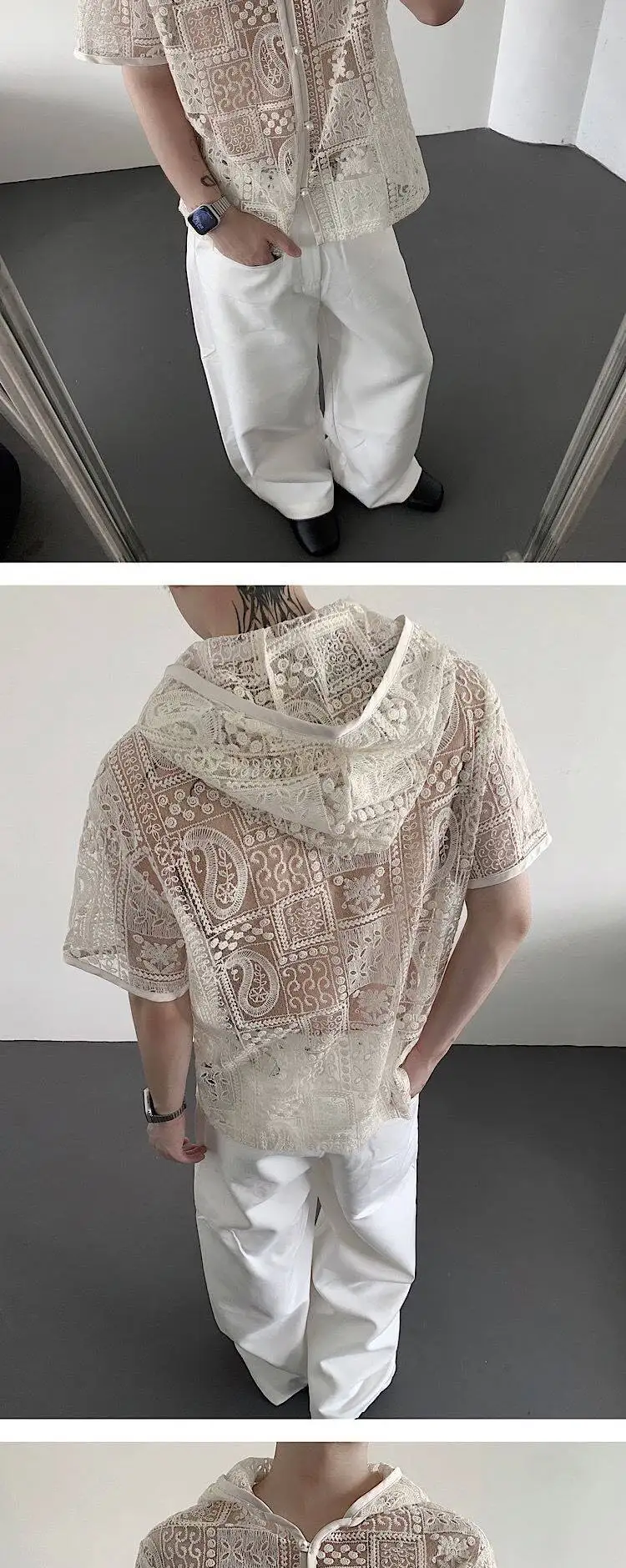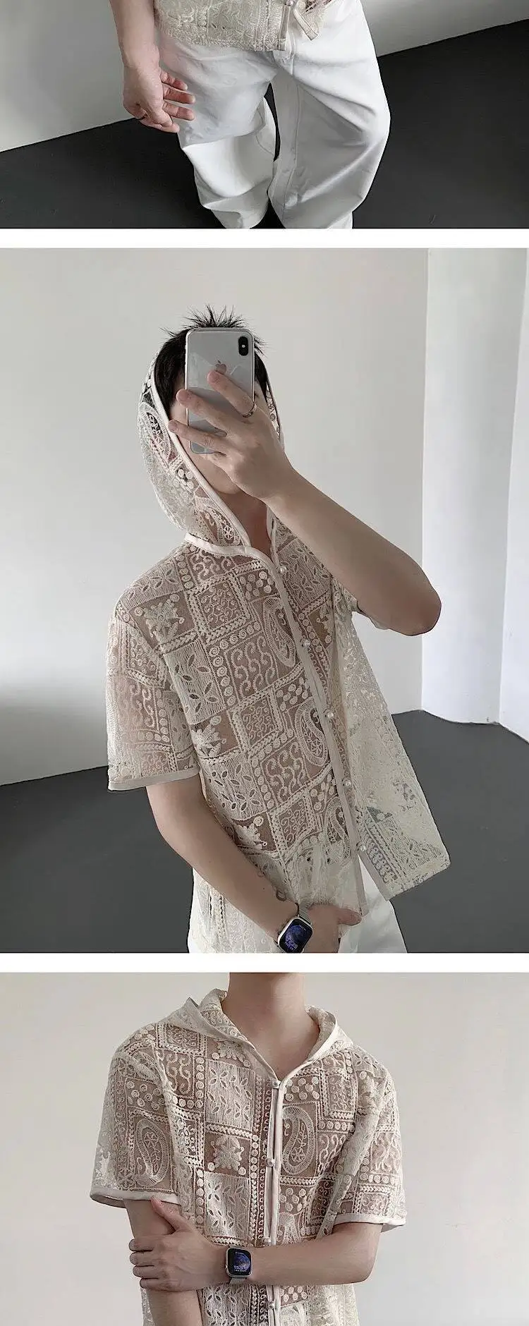 WIAOFELLAS - Trendy Men's Lace Hollow Out Heavy Industy Design Shirts Fashion Short Sleeves Hooded Loose Tops Male Summer