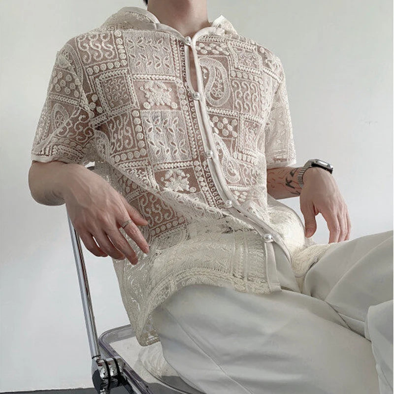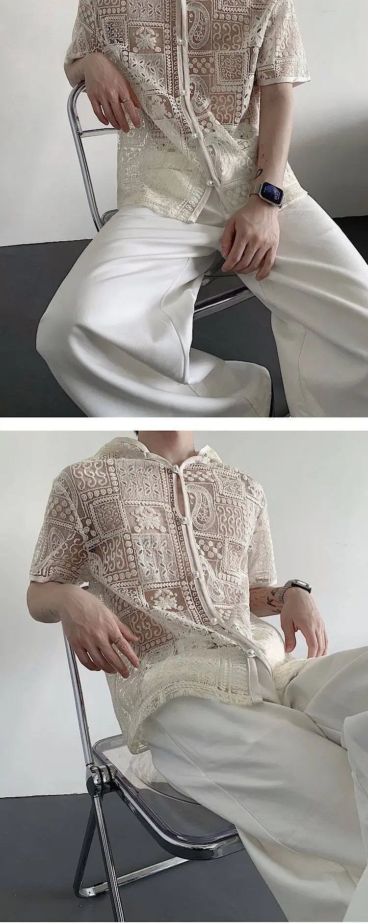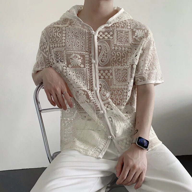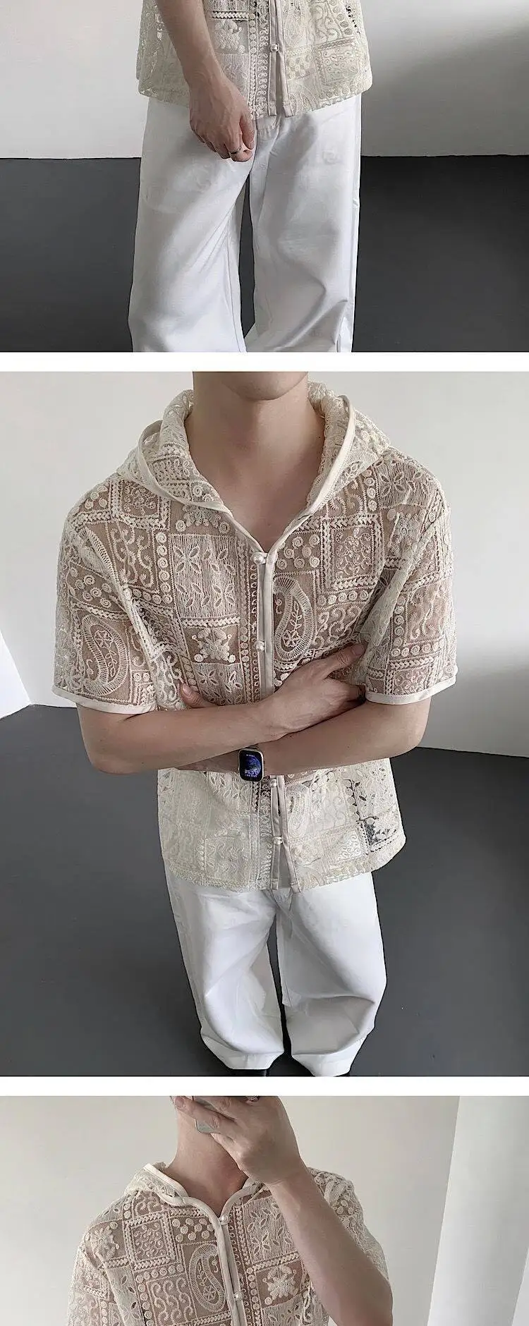 WIAOFELLAS - Trendy Men's Lace Hollow Out Heavy Industy Design Shirts Fashion Short Sleeves Hooded Loose Tops Male Summer