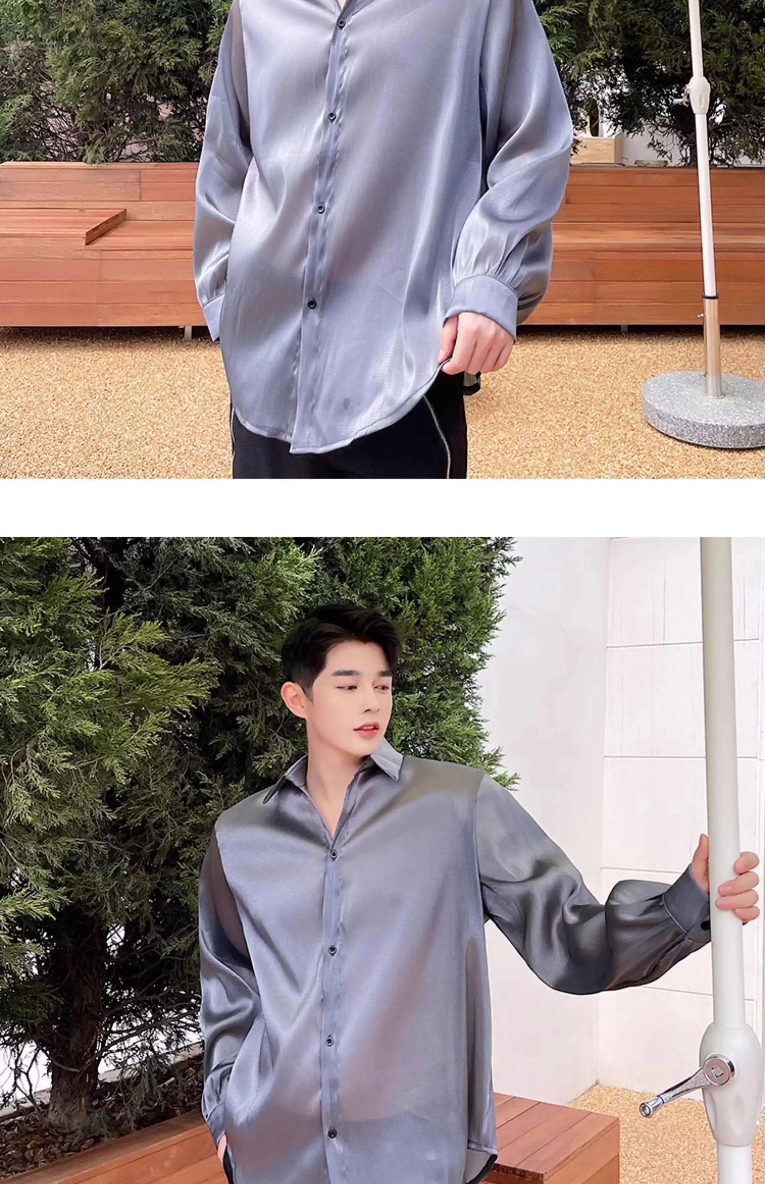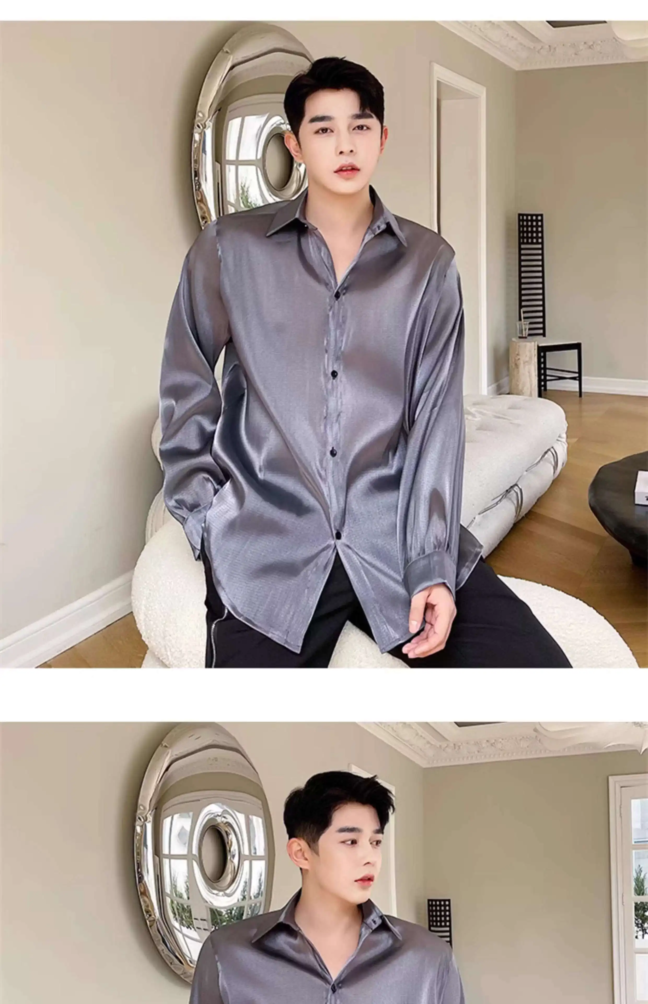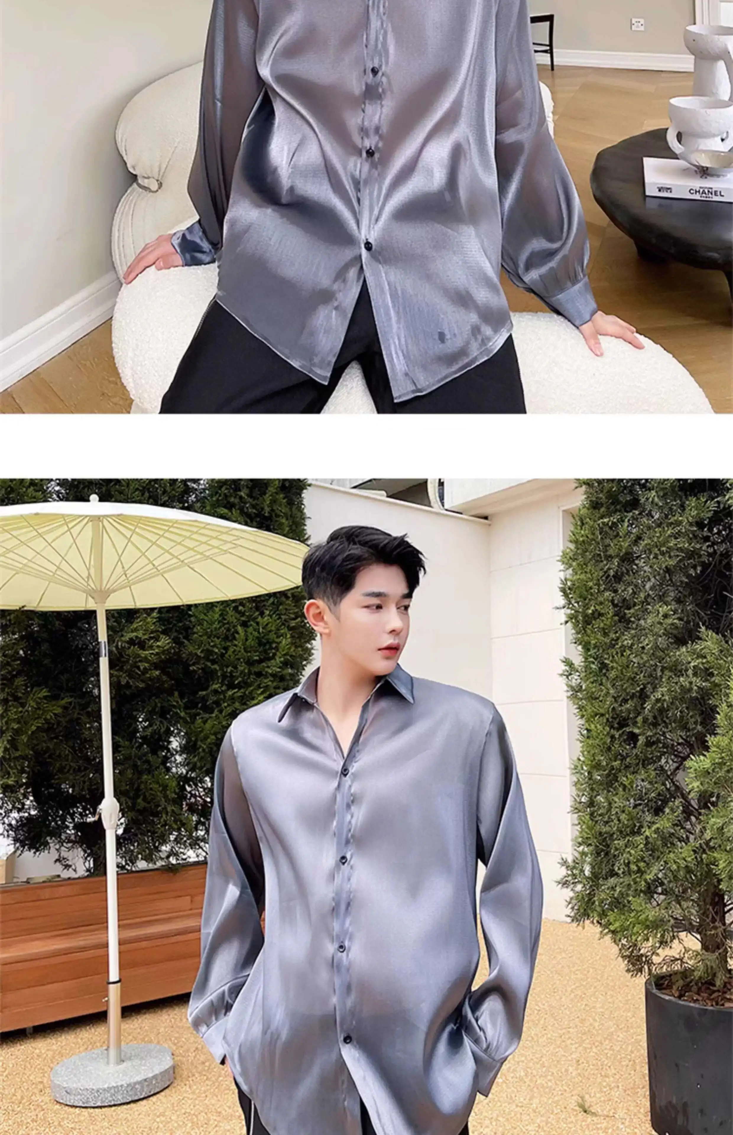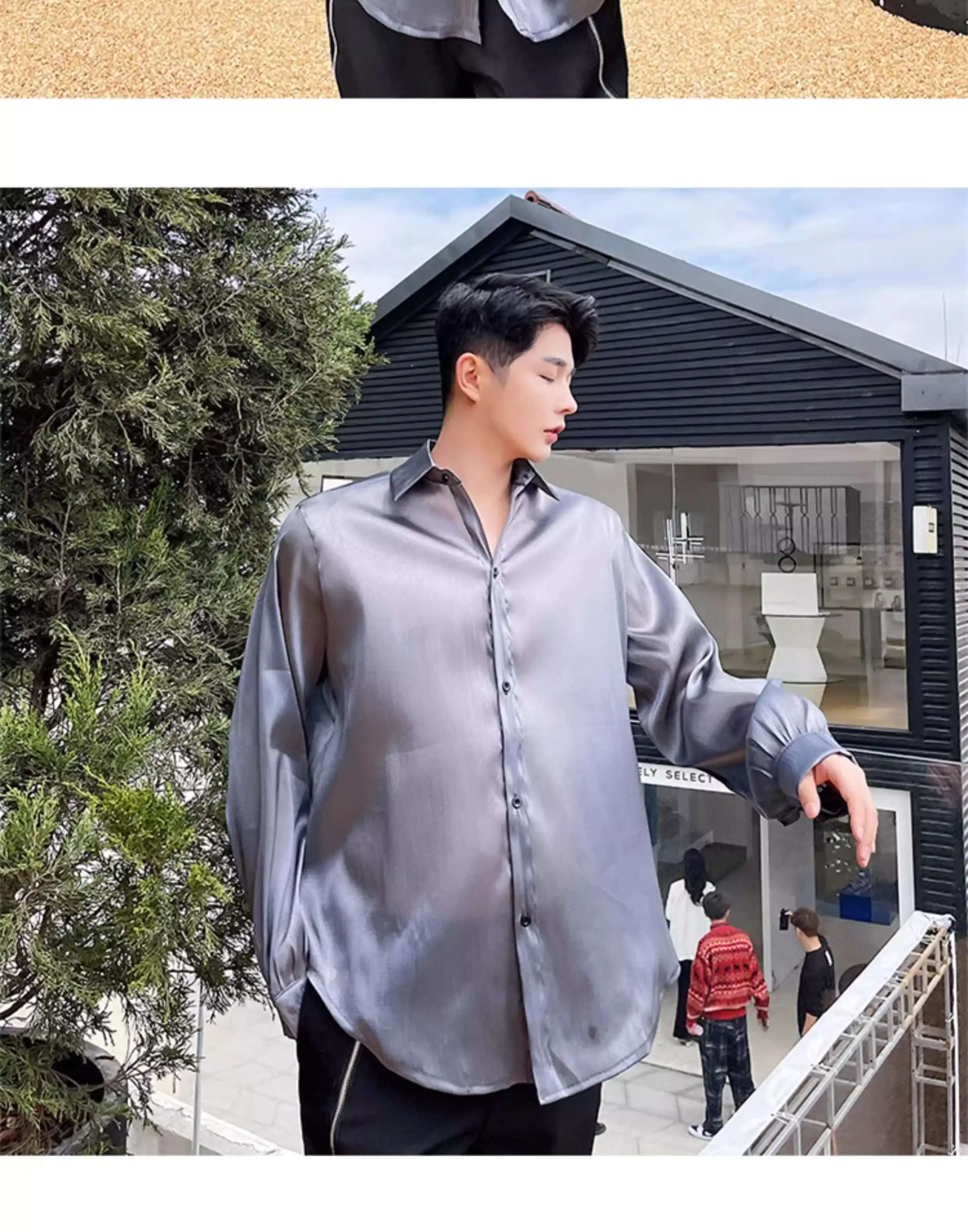WIAOFELLAS - Trendy New Summer Men's Solid Color Turn Down Collar Loose Shirts Fashion Single-breasted Long Sleeves Blouses Male