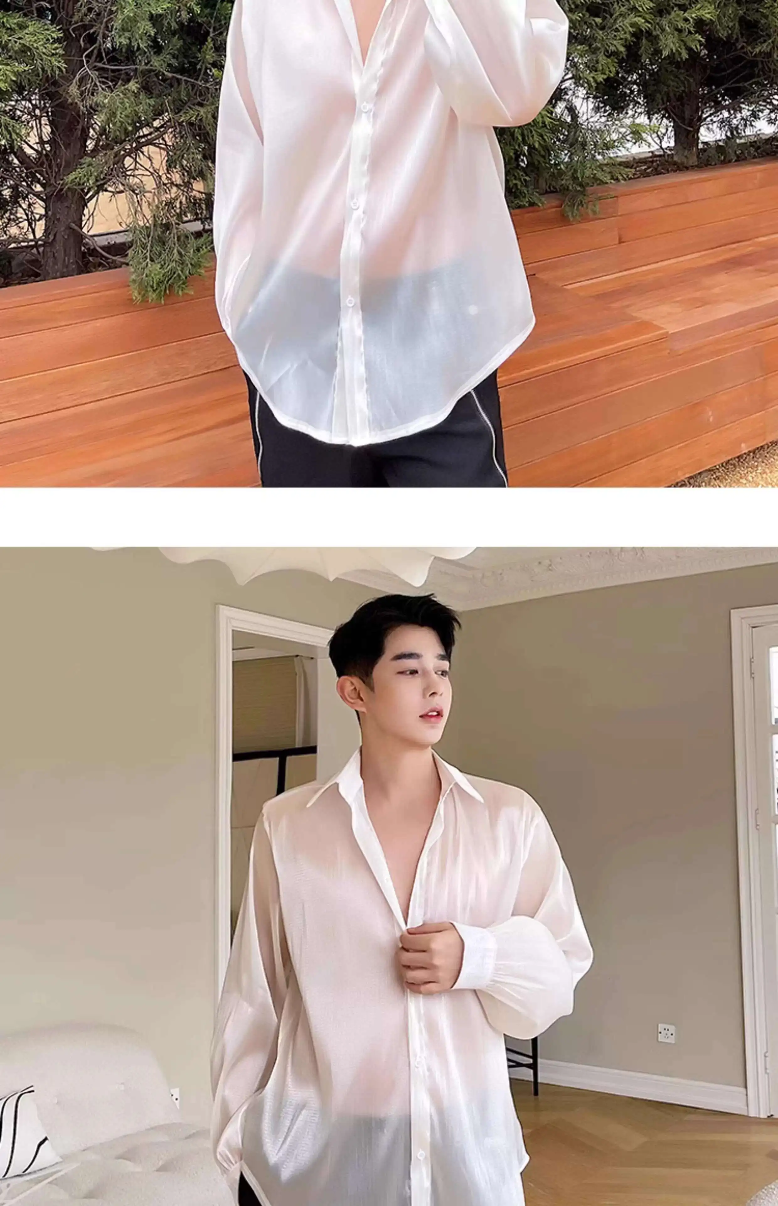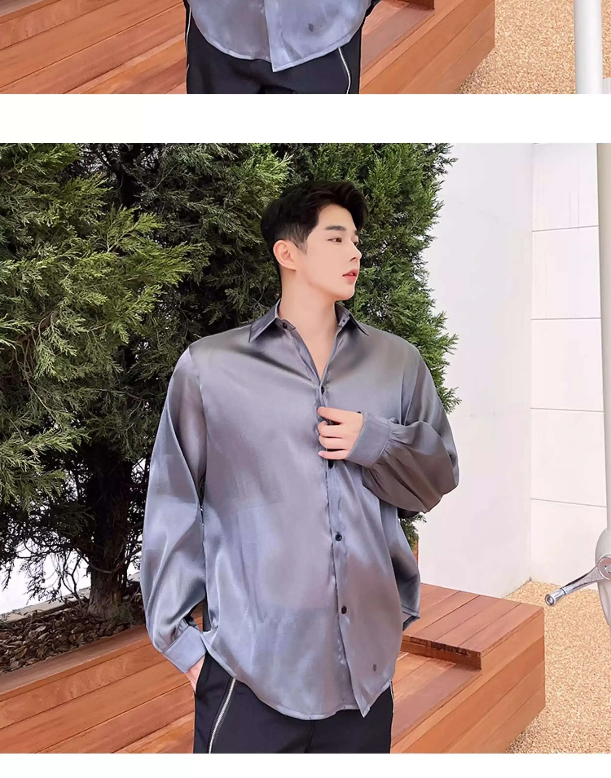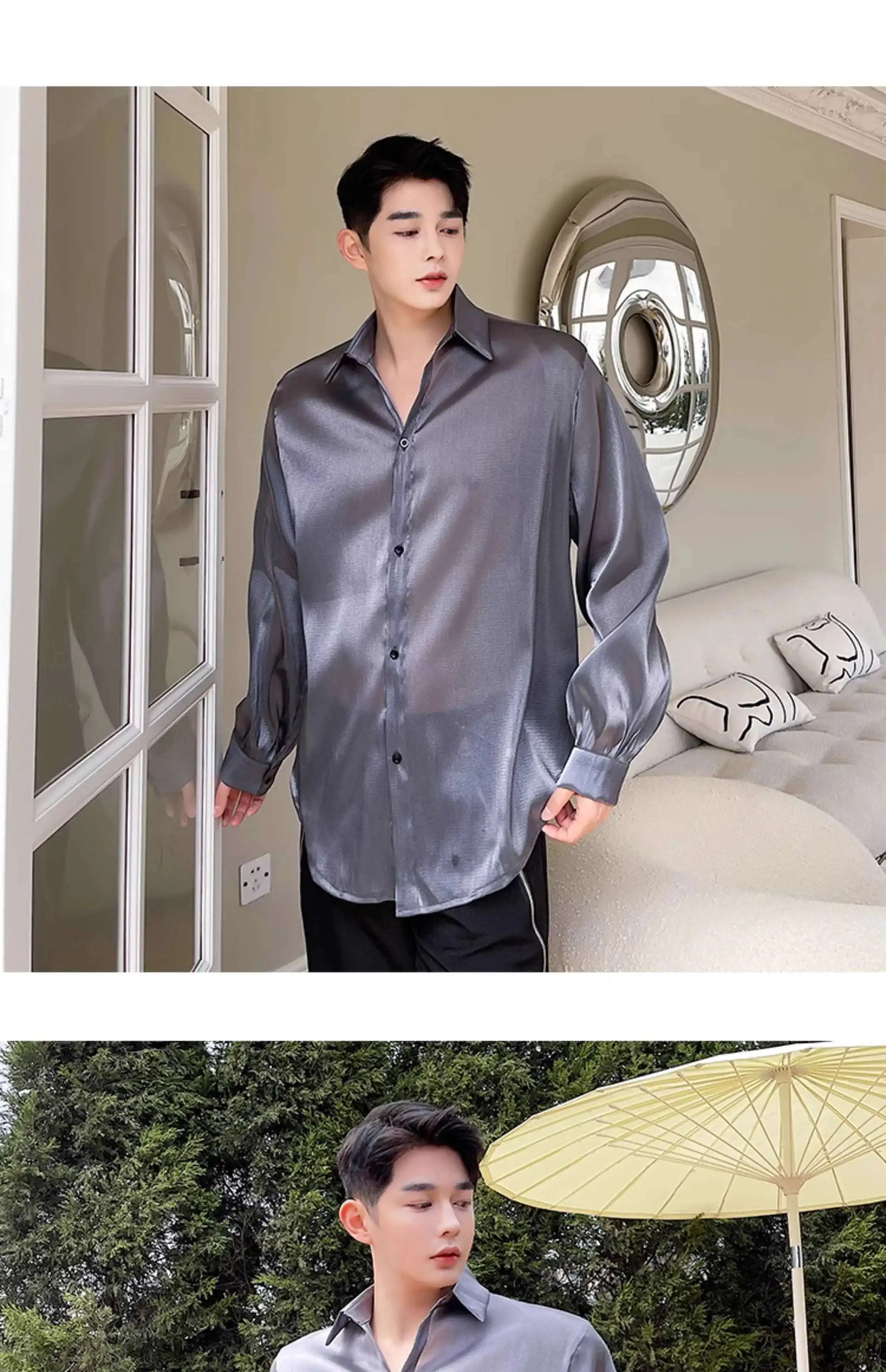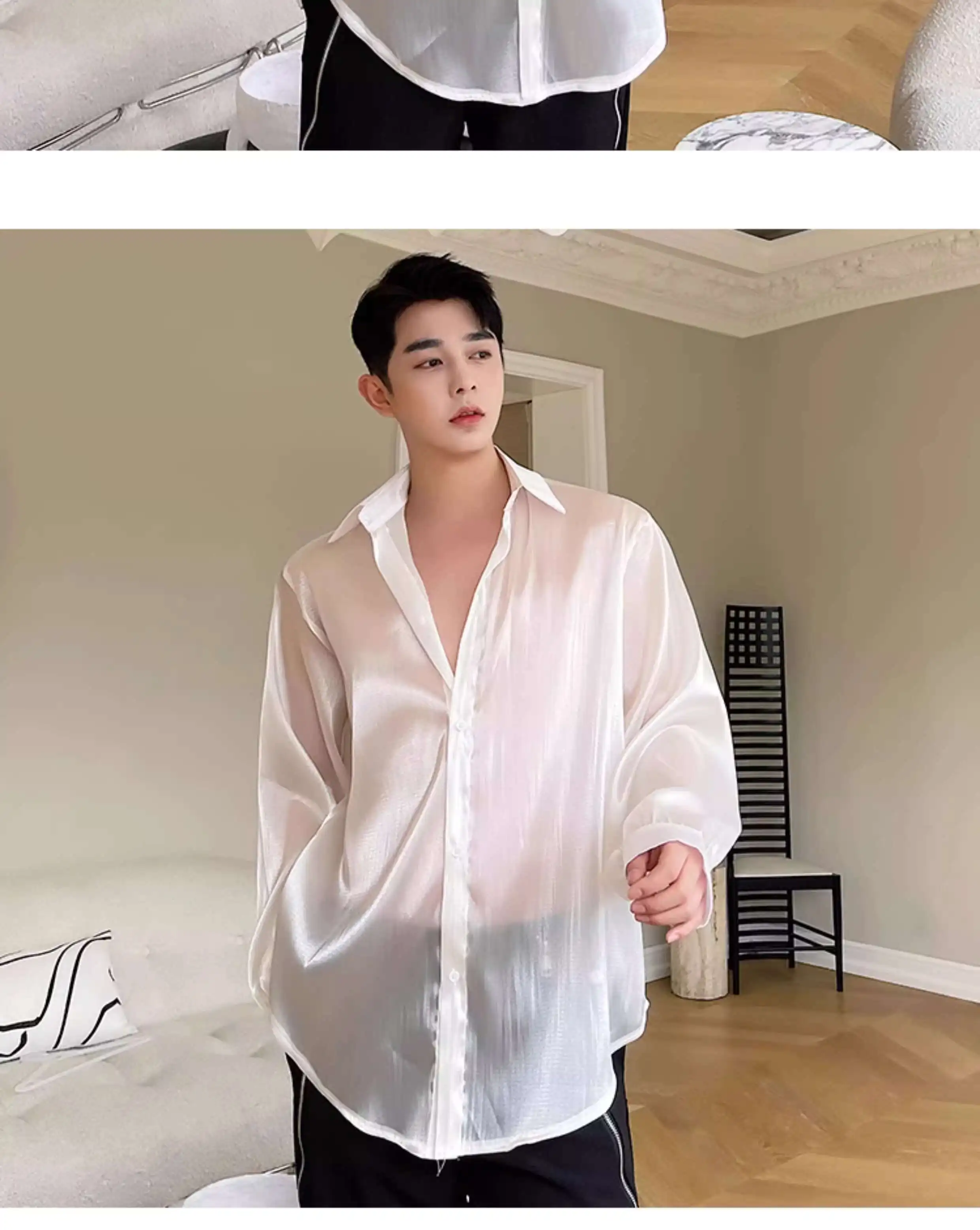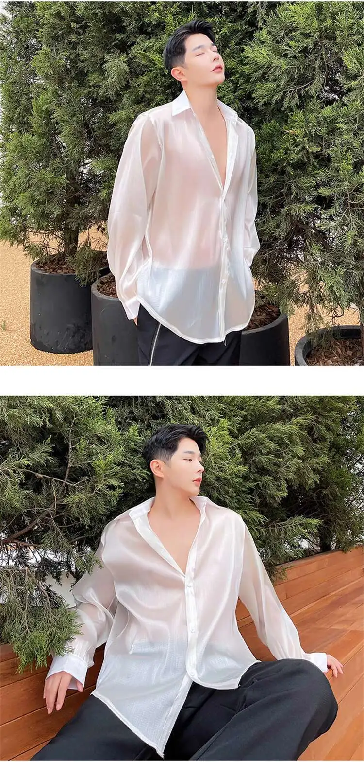 WIAOFELLAS - Trendy New Summer Men's Solid Color Turn Down Collar Loose Shirts Fashion Single-breasted Long Sleeves Blouses Male