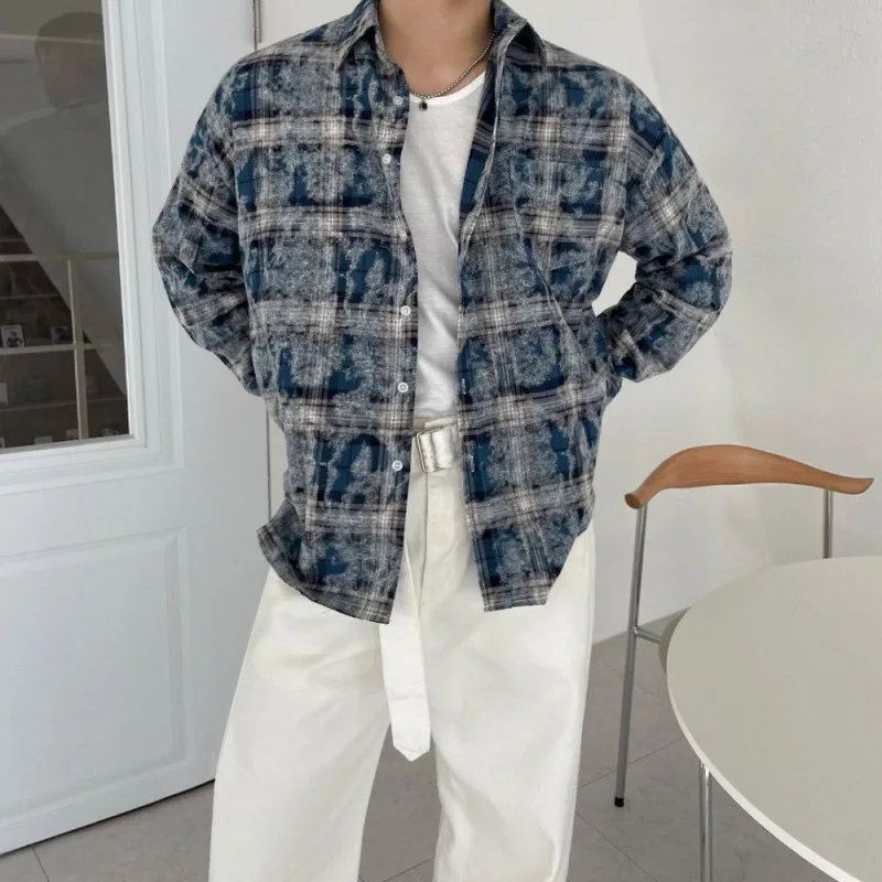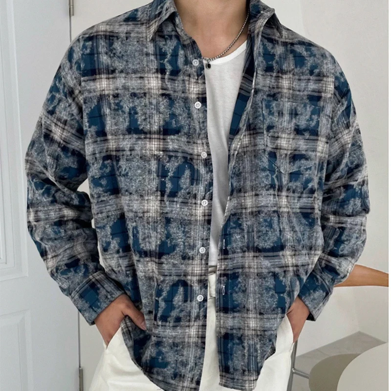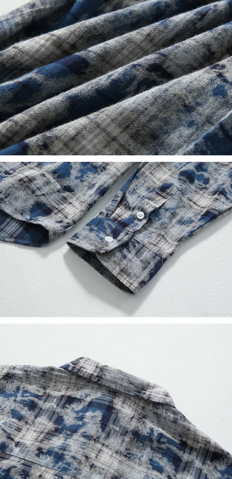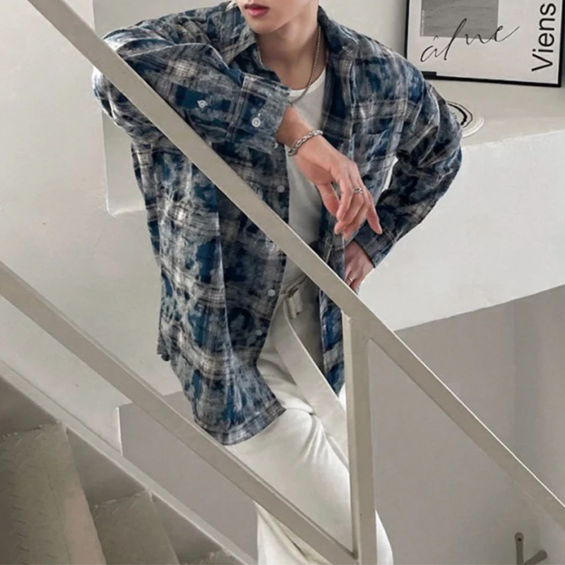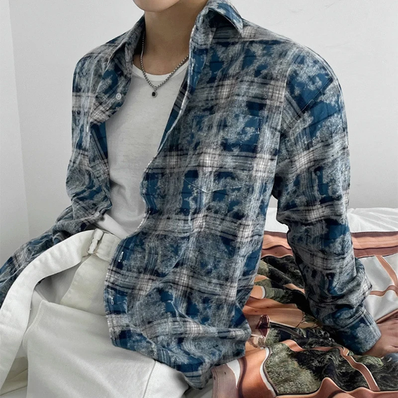 Wiaofellas - Trendy Tie-Dye Turn Down Collar Autumn Shirts Men Clothing Patch Plaid Loose Cardigan Winter Fashion Long Sleeve Button T Shirt