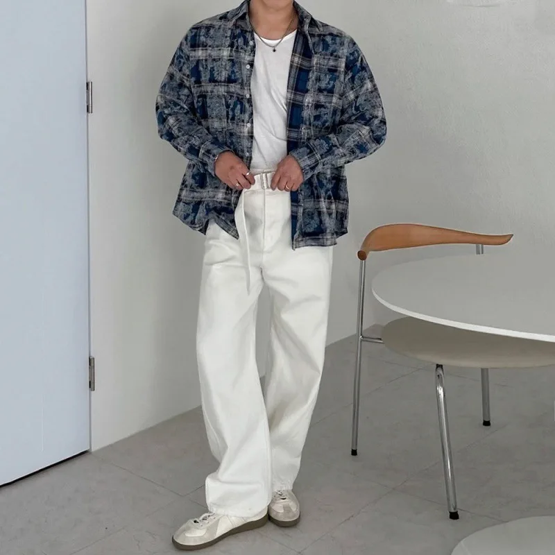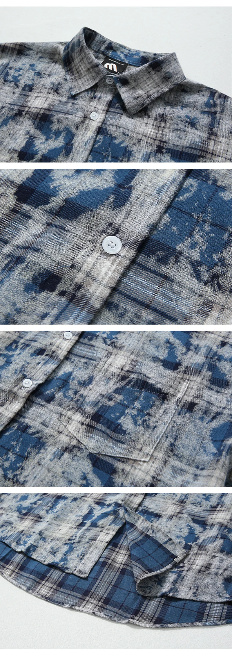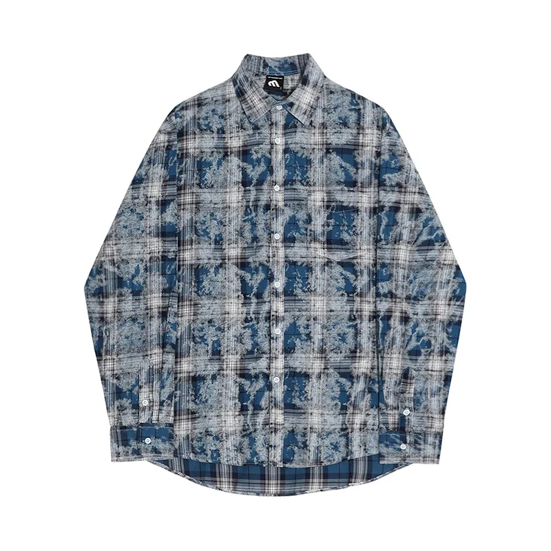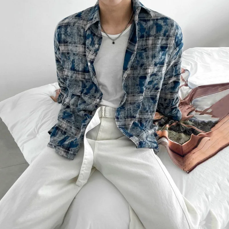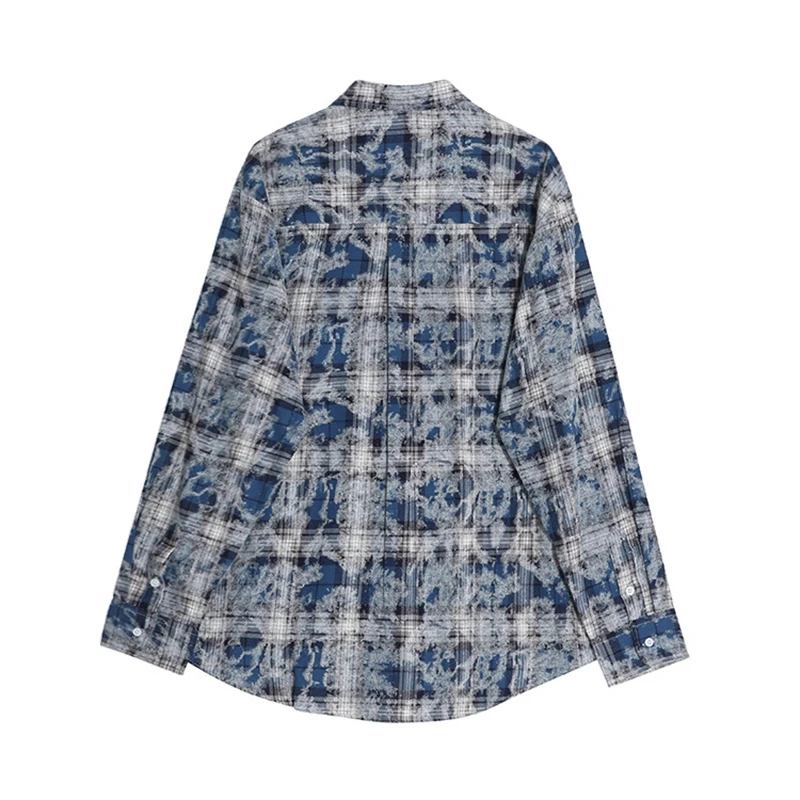 Wiaofellas - Trendy Tie-Dye Turn Down Collar Autumn Shirts Men Clothing Patch Plaid Loose Cardigan Winter Fashion Long Sleeve Button T Shirt