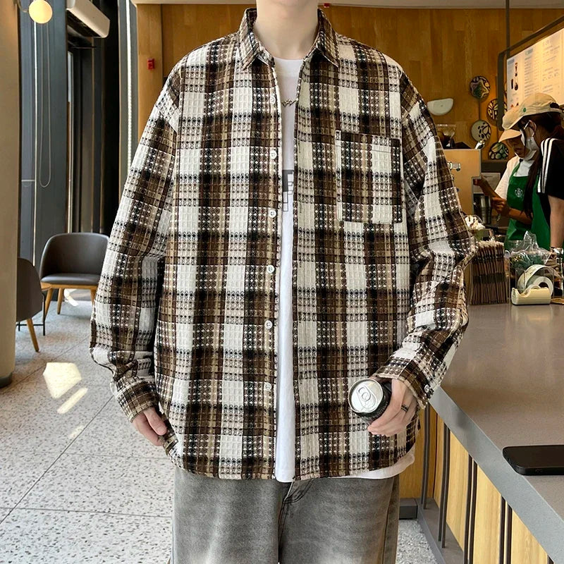 WIAOFELLAS - Vintage Long-sleeved Men Woolen Shirt Autumn Spring Hip Hop Baggy Cargo Plaid Men's Shirts High Quality Casual Mens Clothing 5XL