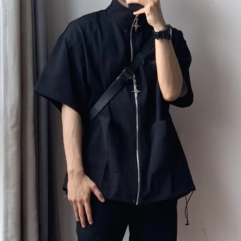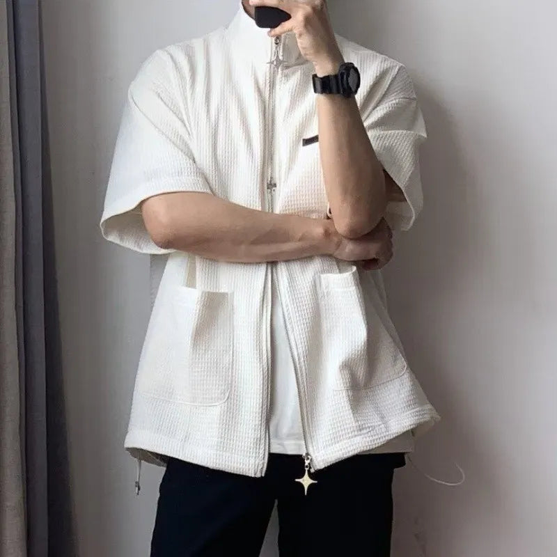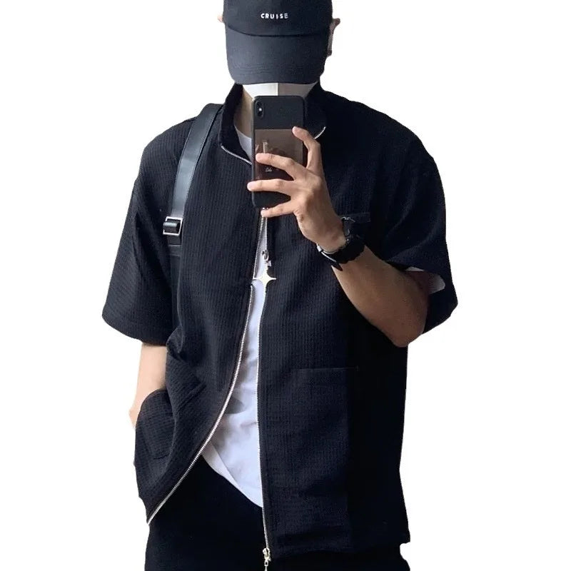 WIAOFELLAS - Vintage Stand Collar Zip-up Cardigan Mens Shirt Casual Breathable Loose Half Sleeve Tops Summer Men Fashion Pocket Design Shirt