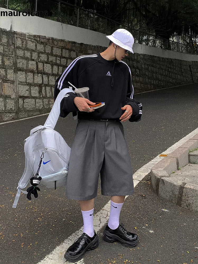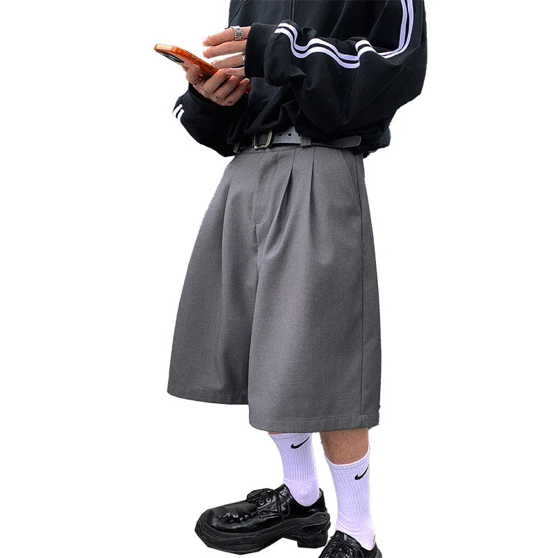 WIAOFELLAS - Spring Summer Loose Casual Soft Grey Pleated Shorts for Men with High Waist Short Straight Pants Korean Clothes