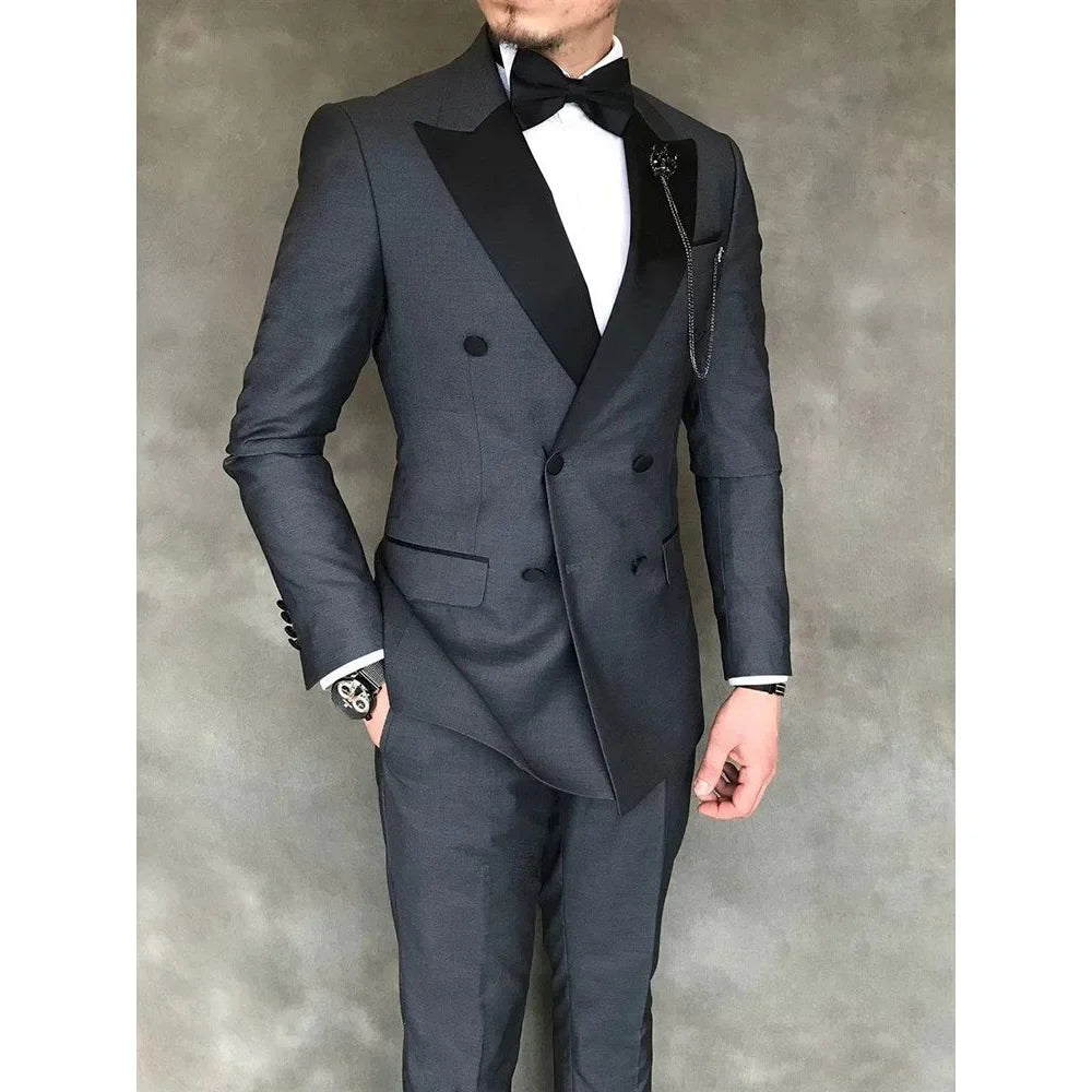 Wiaofellas - Double Breasted Suits For Men Slim Fit Dark Grey Wedding Party Blazer Formal Casual costume homme Peaked Lapel Terno Masculino