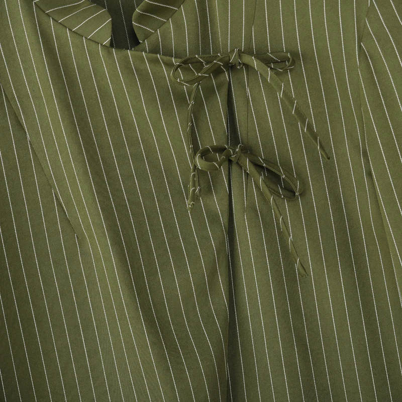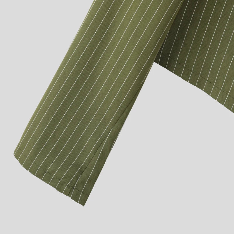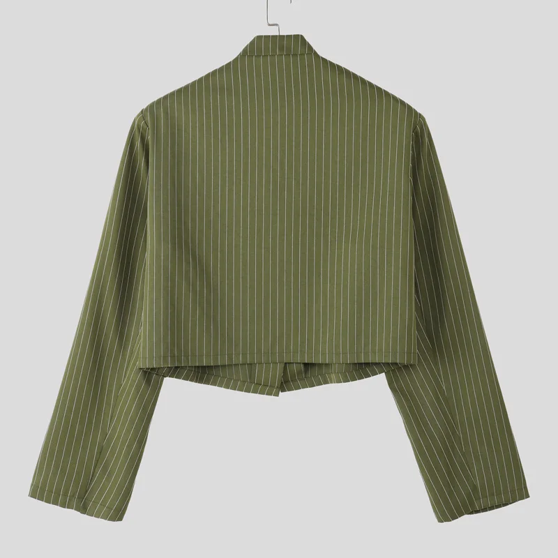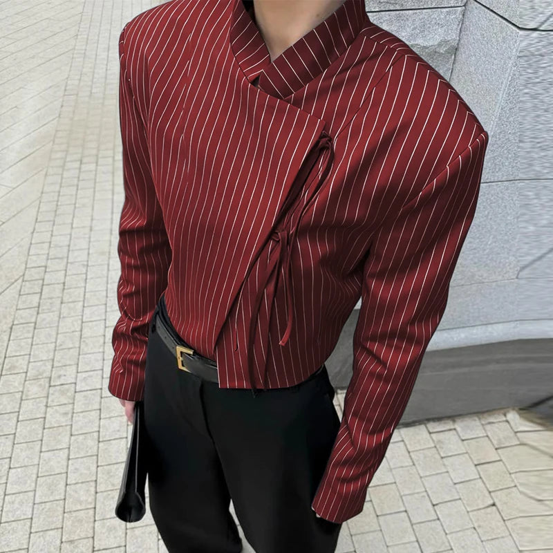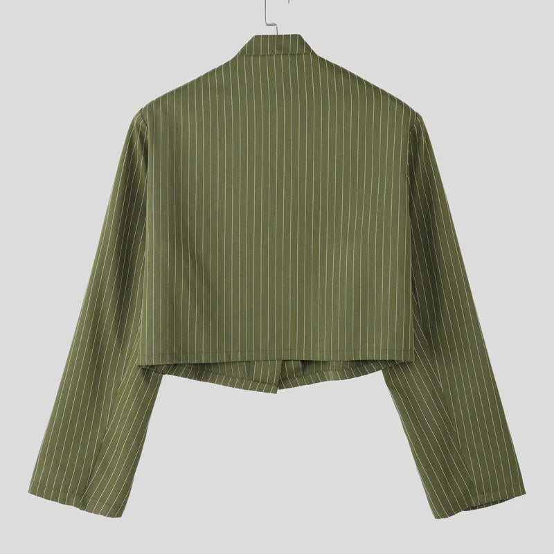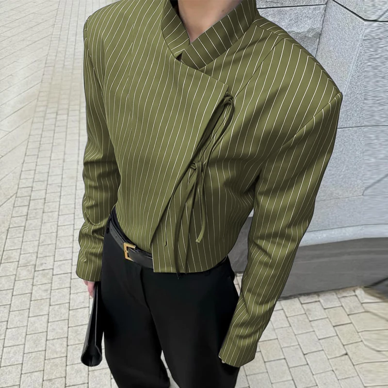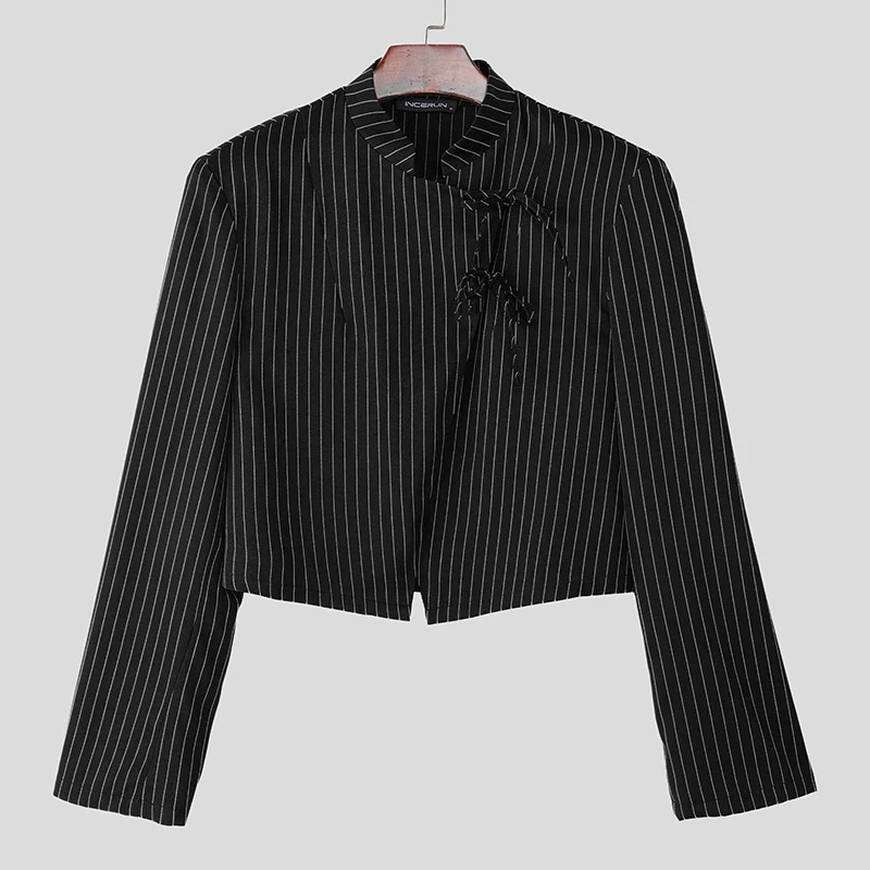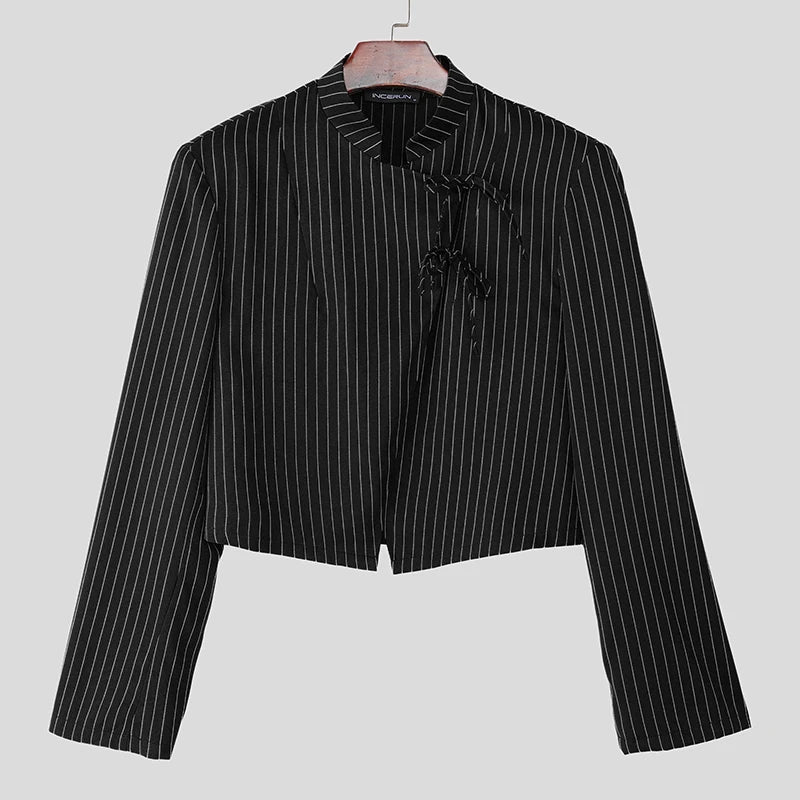 WIAOFELLAS - Men Striped Blazer Stand Collar Long Sleeve Lace Up Casual Thin Crop Coats Men Streetwear Fashion Male Suit S-3XL