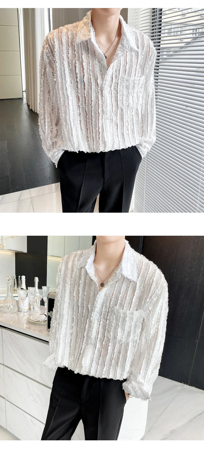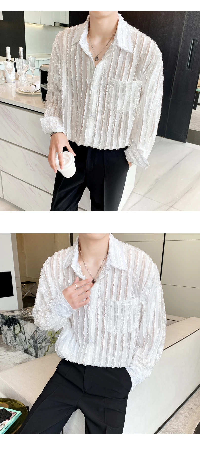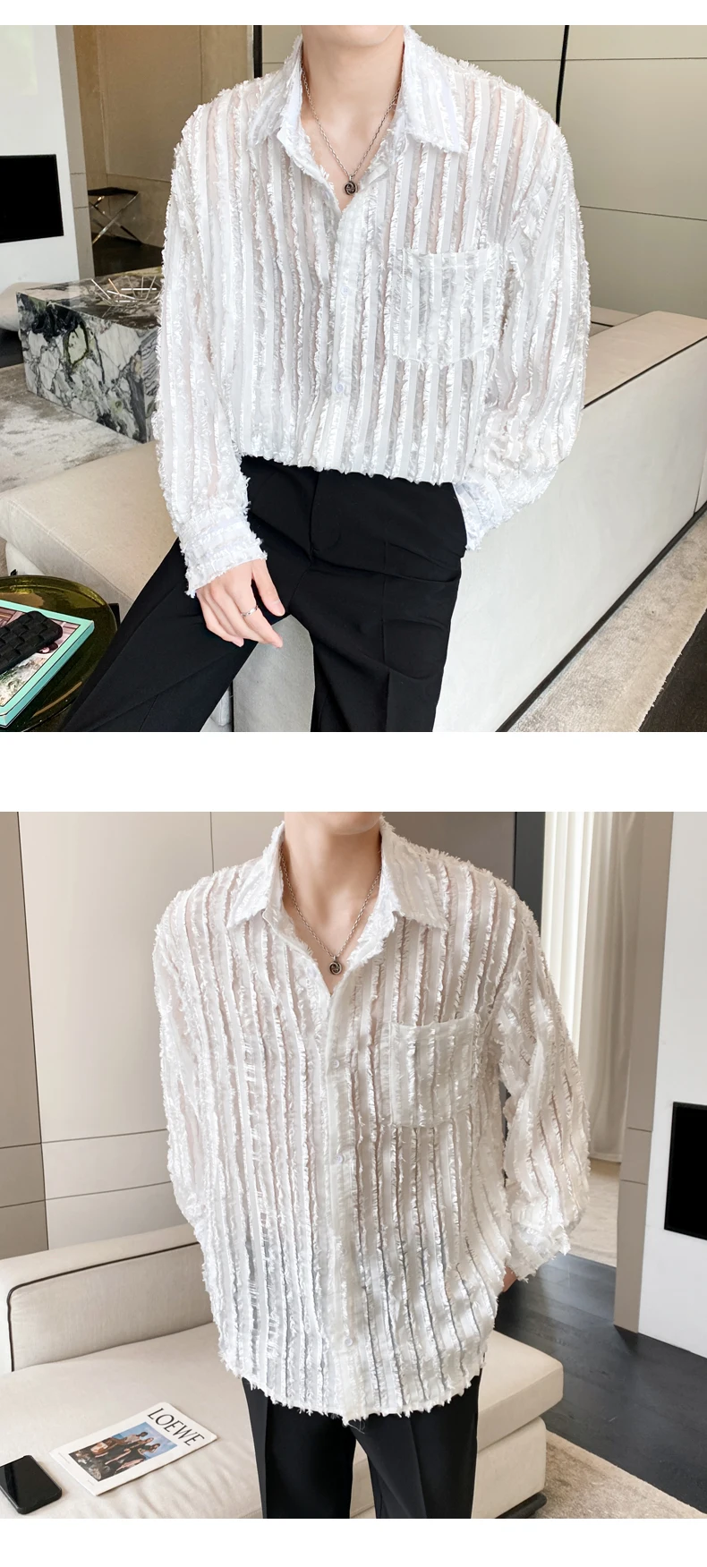 Wiaofellas Summer White Long-sleeved Shirt Men Fashion Social Mens Dress Shirt Korean Loose Casual Stripe Shirts Mens Hollow-out Shirt