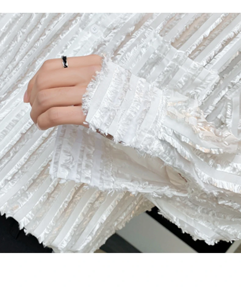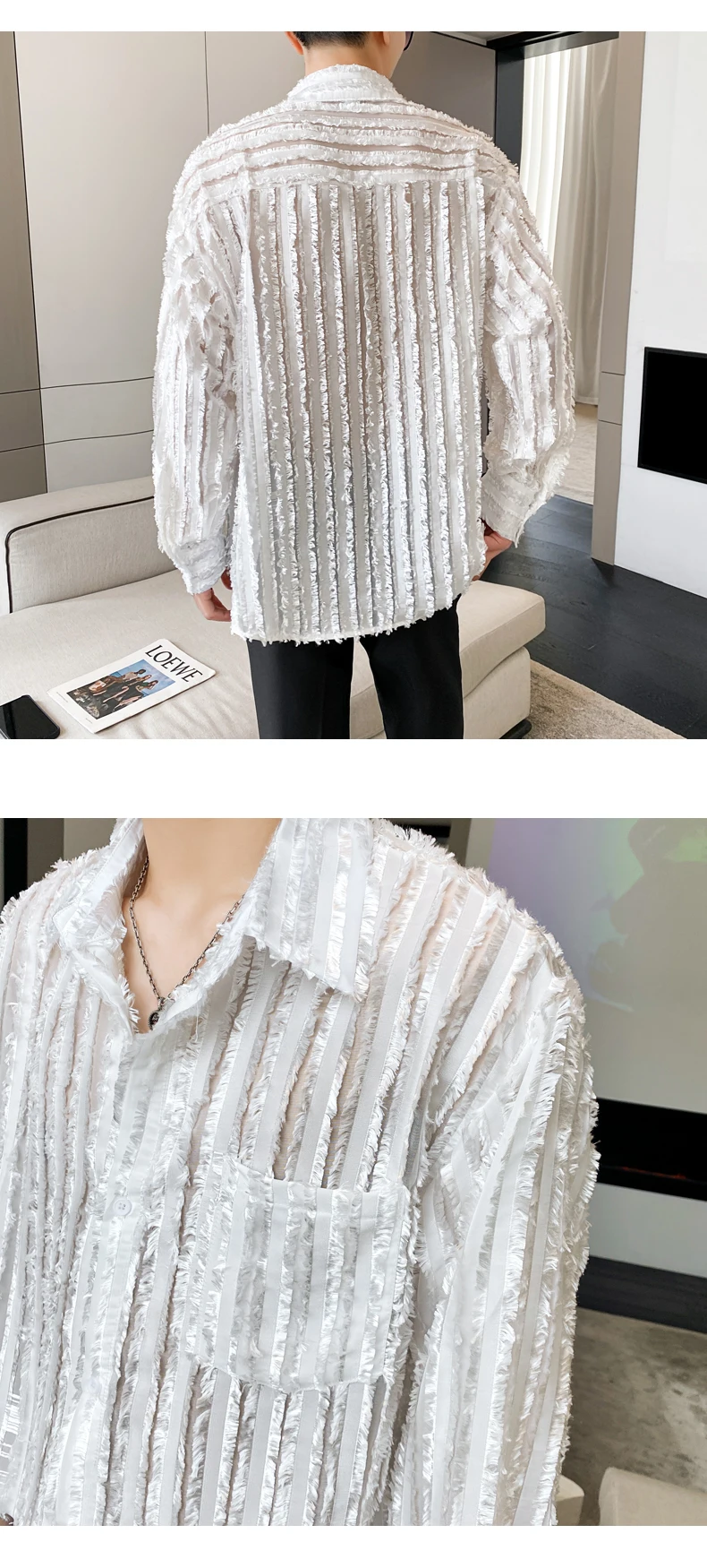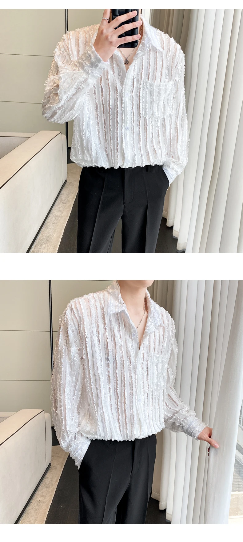 Wiaofellas Summer White Long-sleeved Shirt Men Fashion Social Mens Dress Shirt Korean Loose Casual Stripe Shirts Mens Hollow-out Shirt