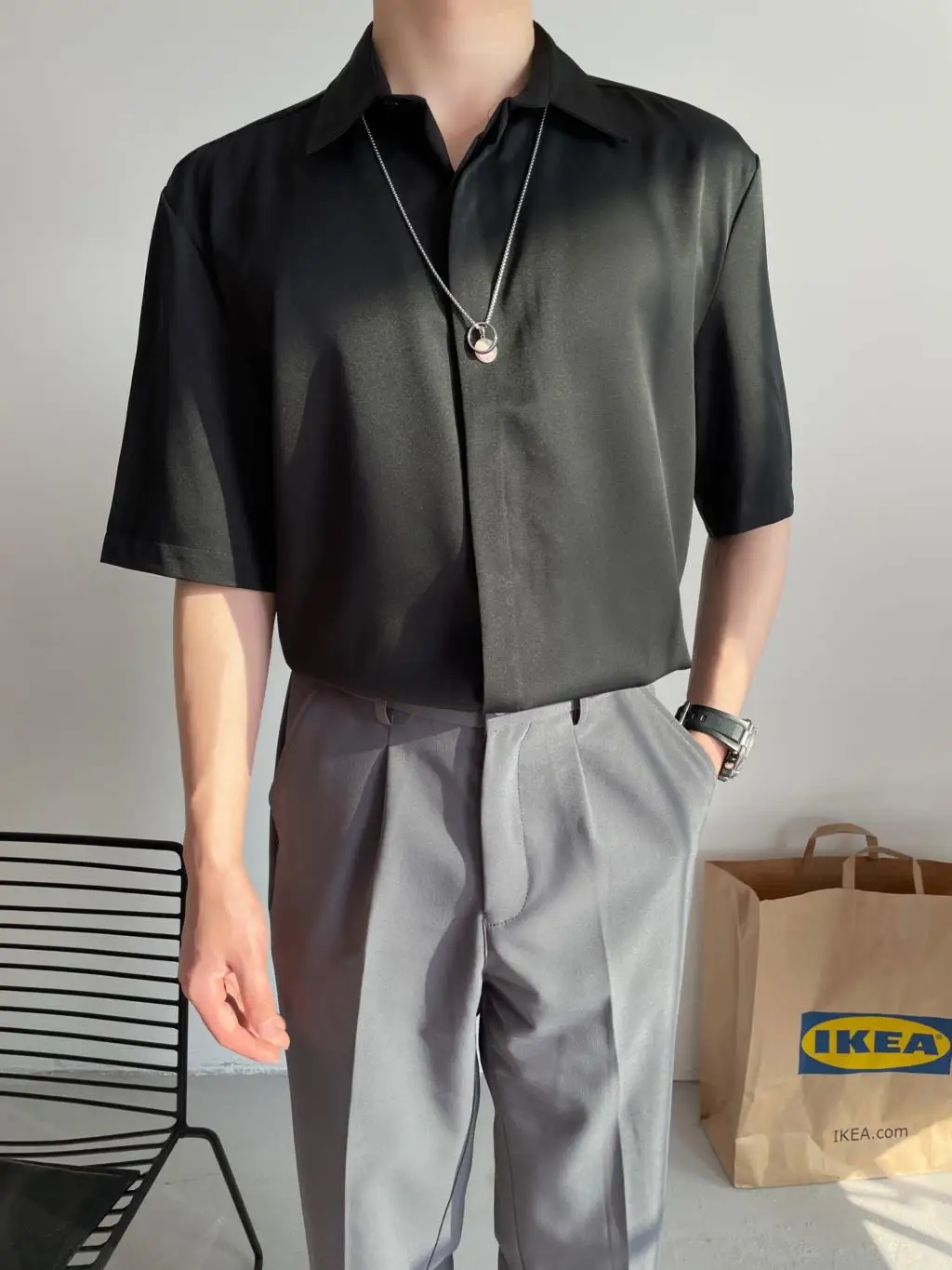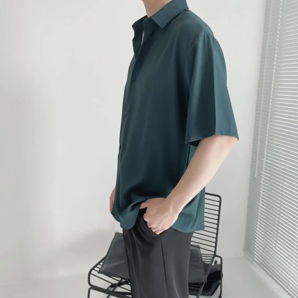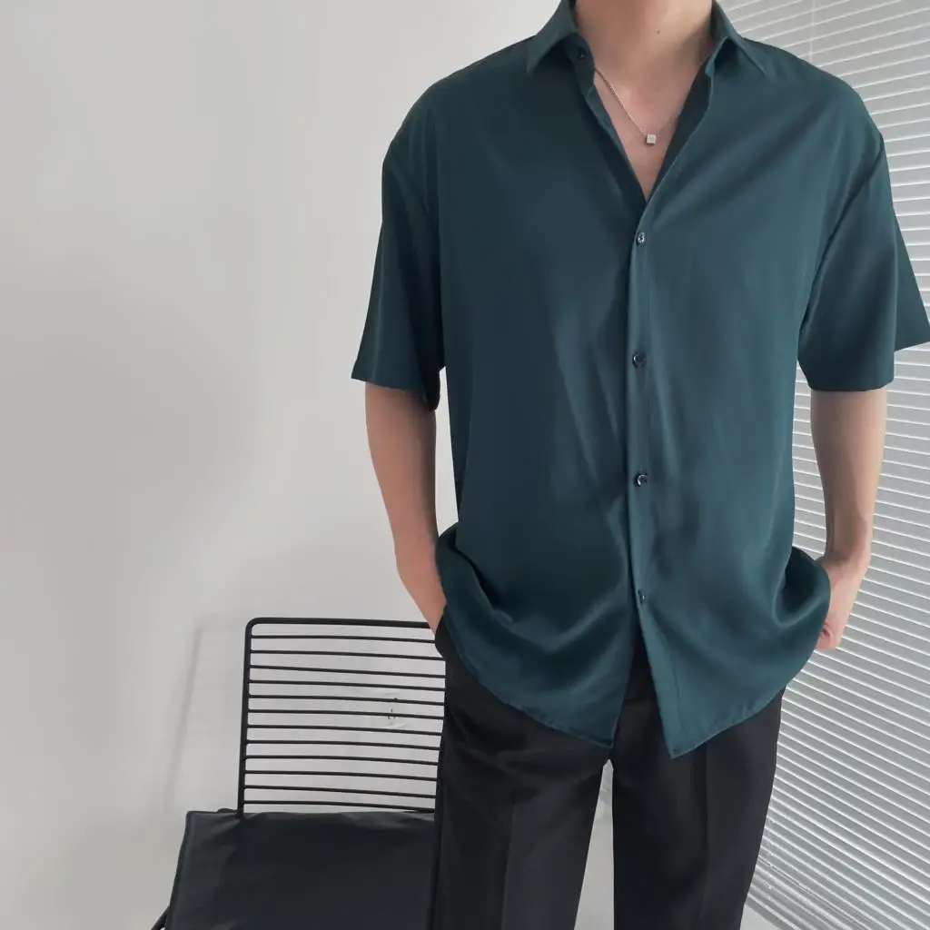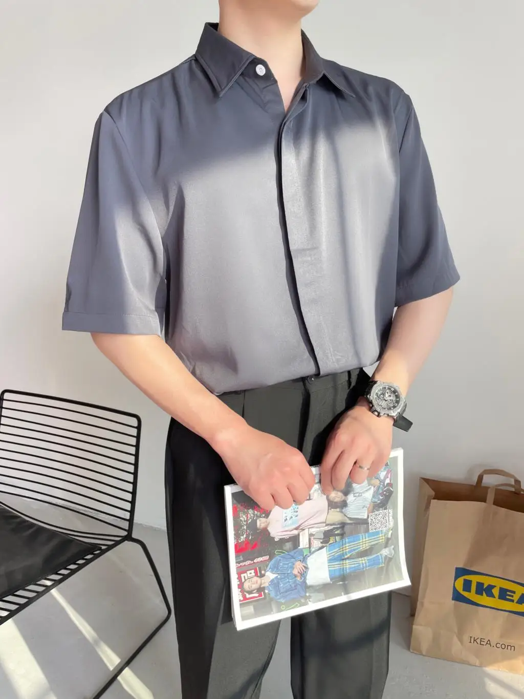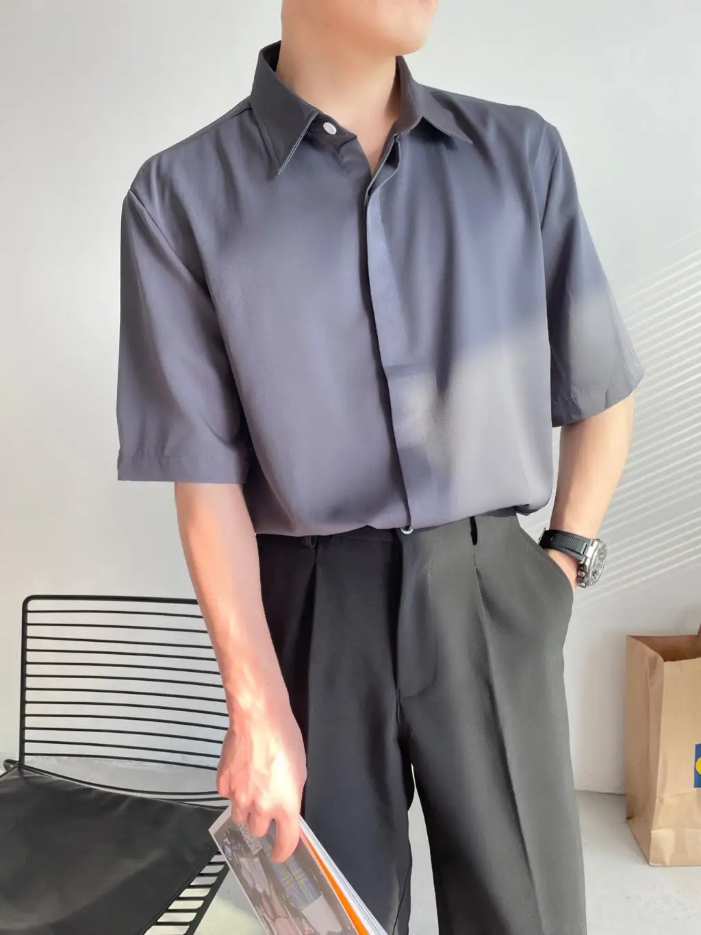 Wiaofellas - Luxury Ice Silk White Solid Shirts Men's Oversize Casual Short Sleeve Cardigan Fashion Spring Summer Blouses Unisex Gray Tops