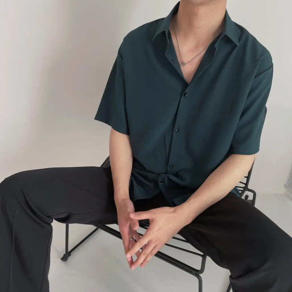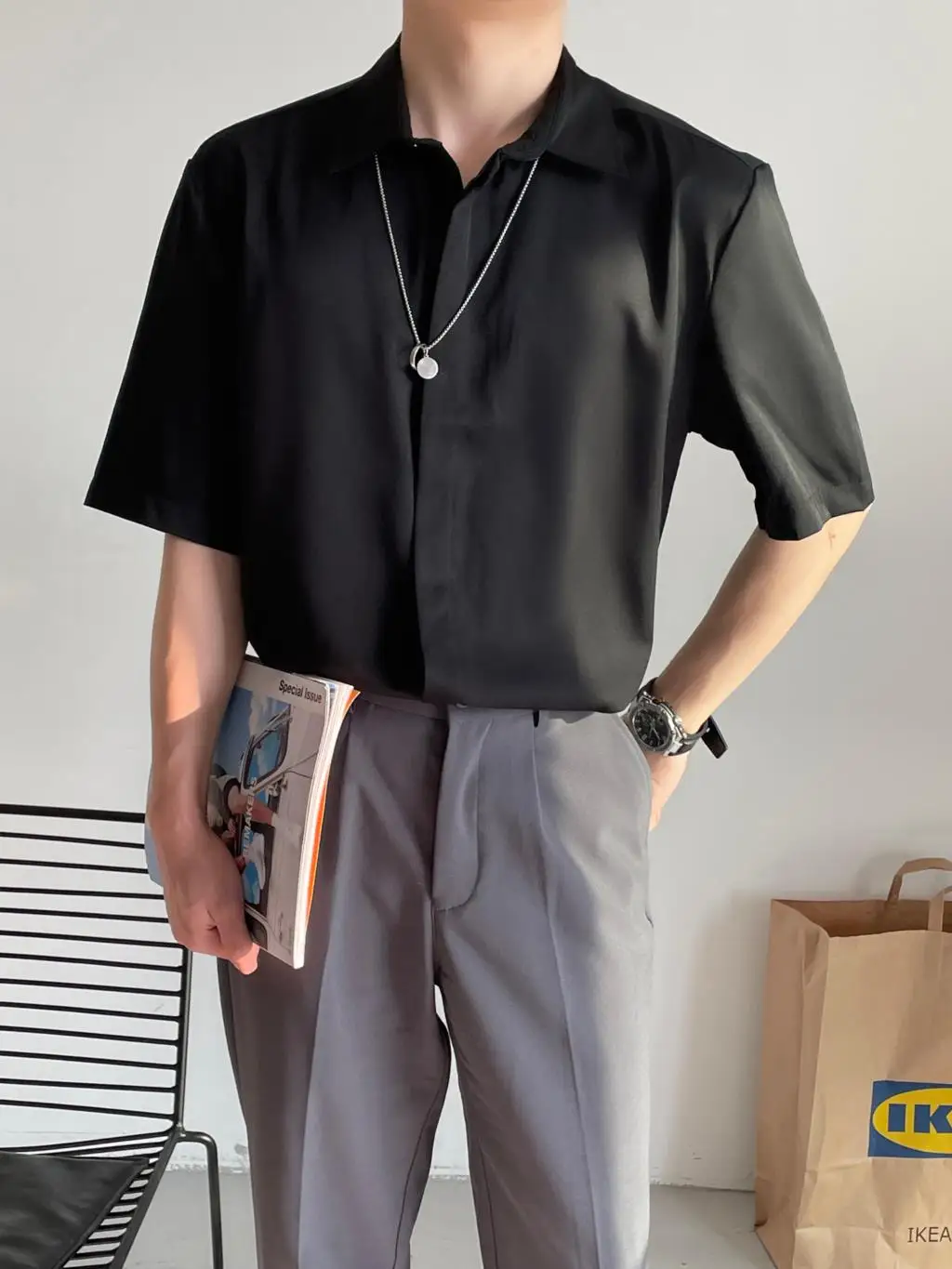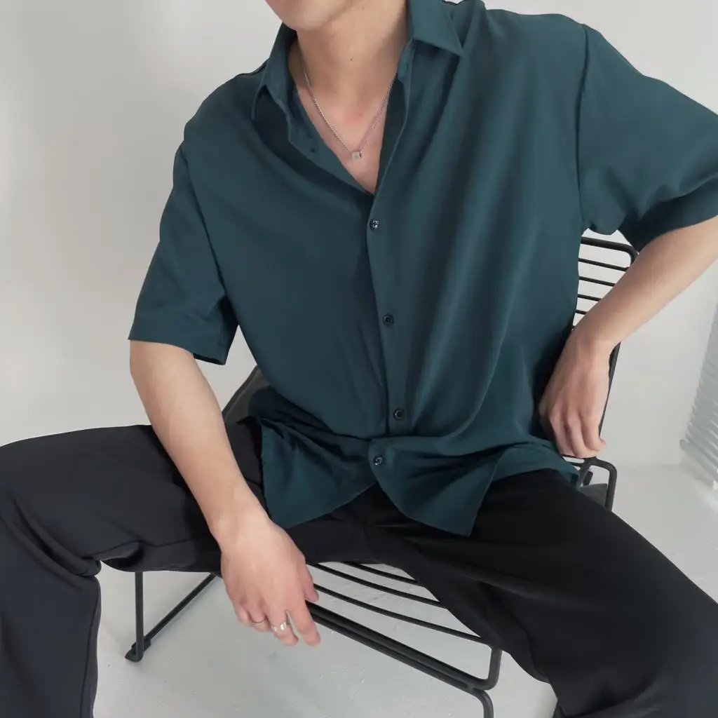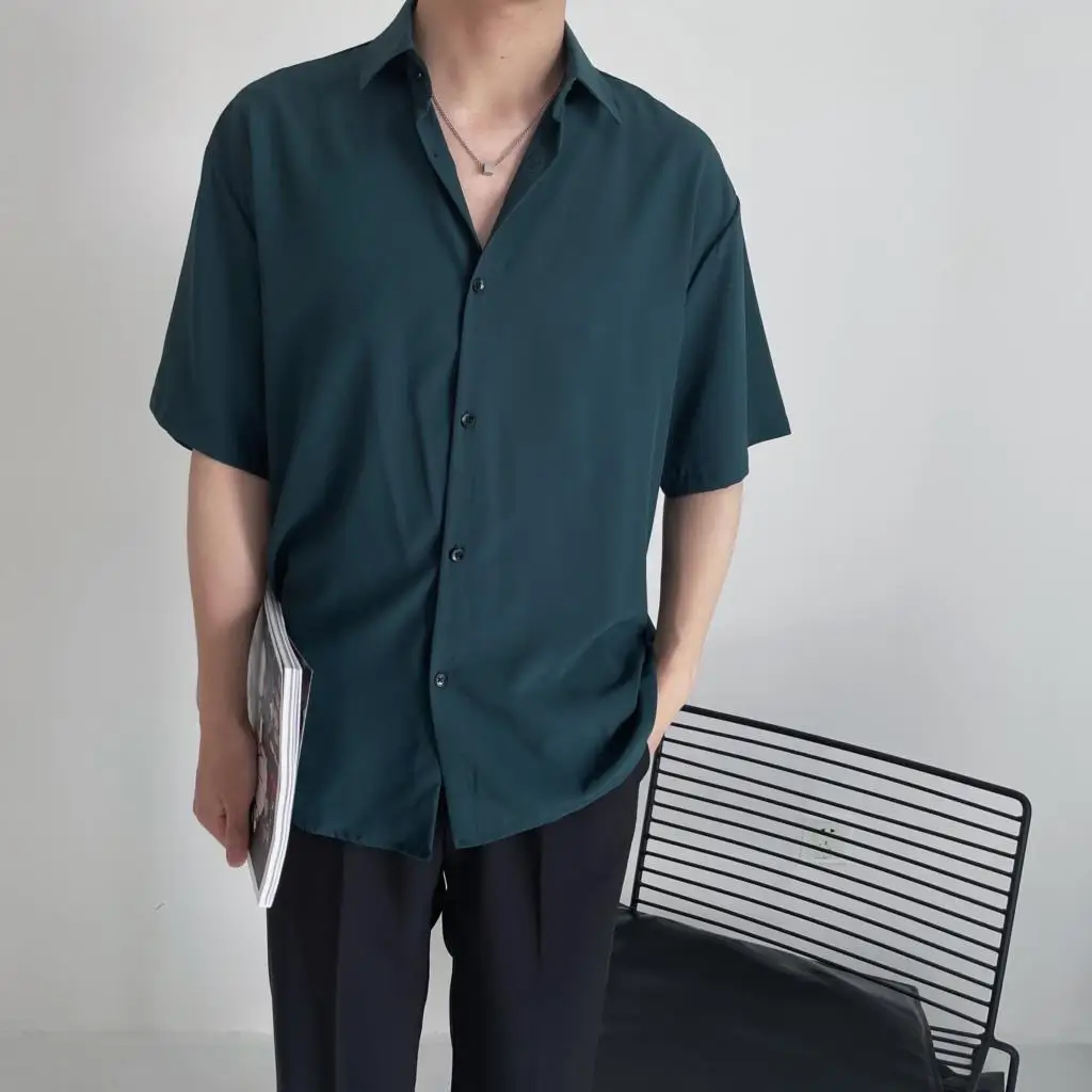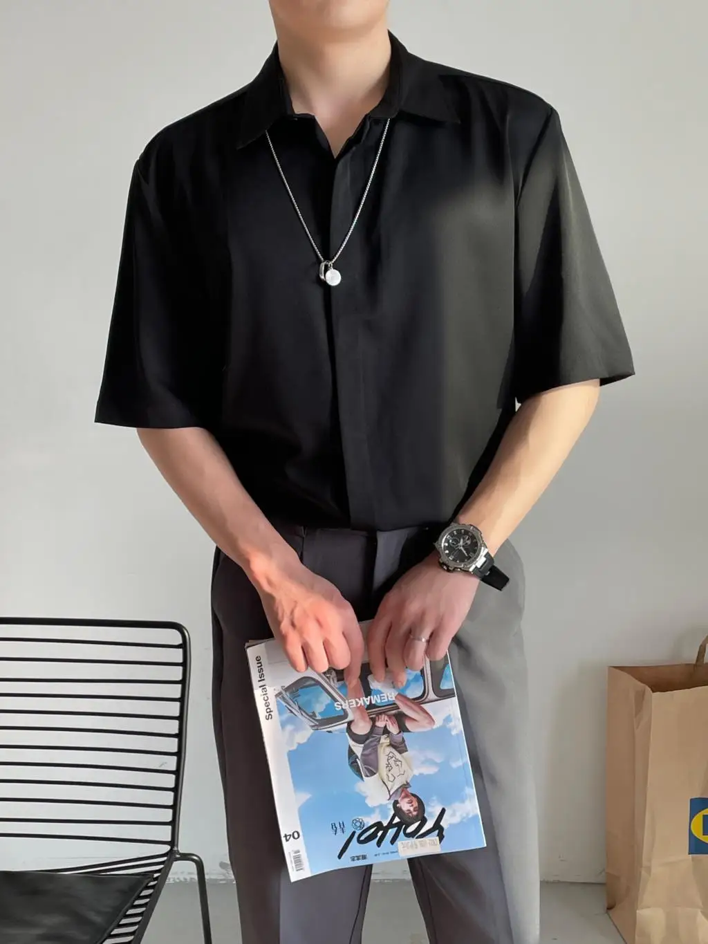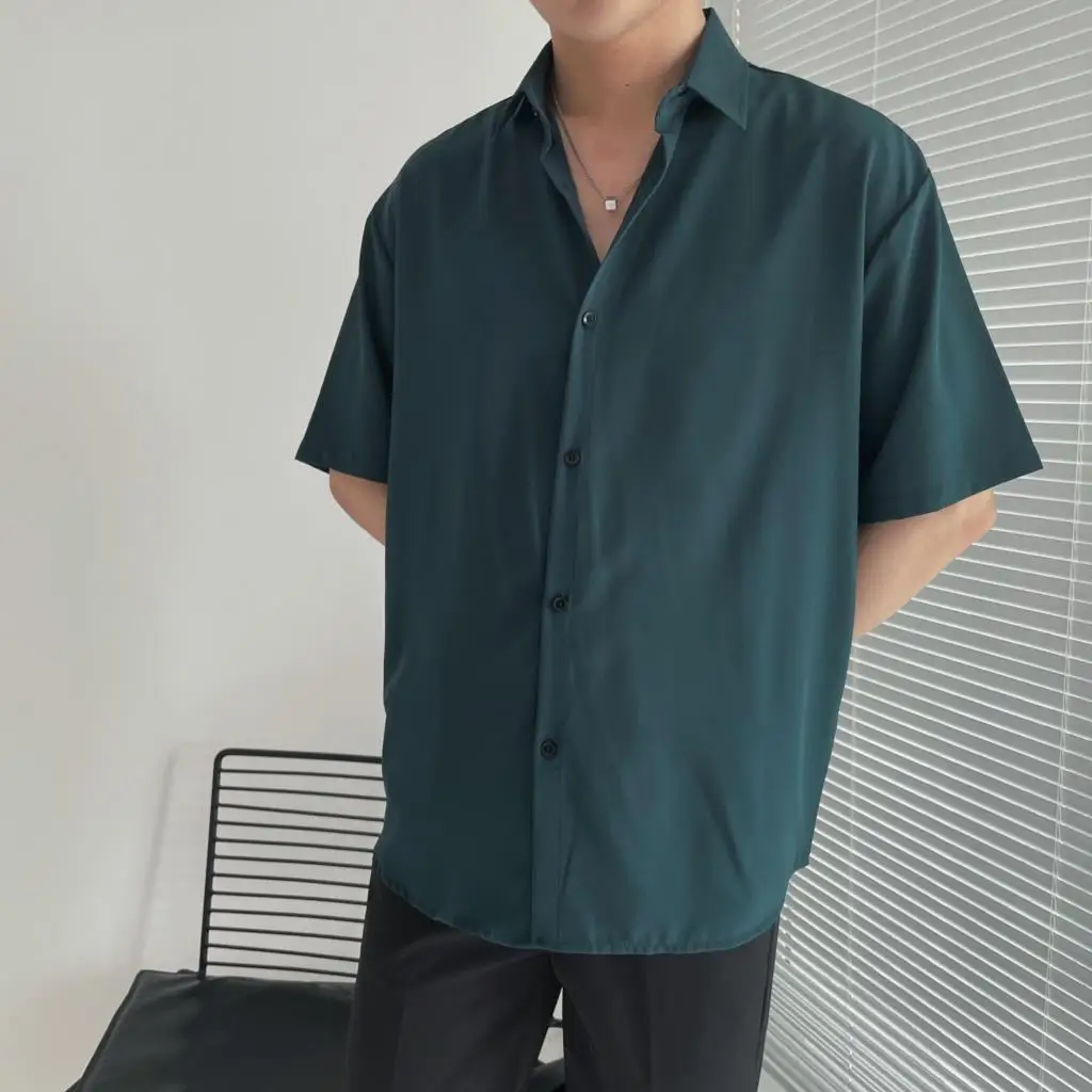 Wiaofellas - Luxury Ice Silk White Solid Shirts Men's Oversize Casual Short Sleeve Cardigan Fashion Spring Summer Blouses Unisex Gray Tops