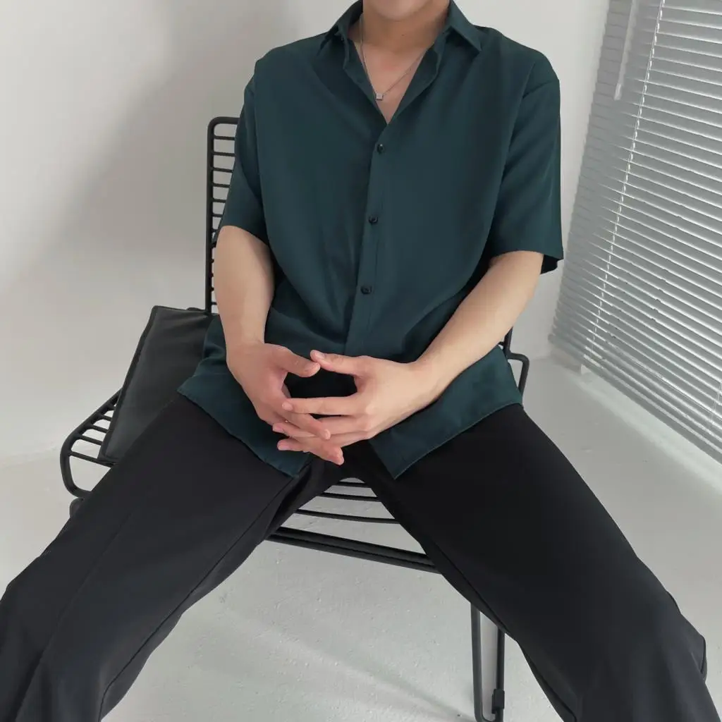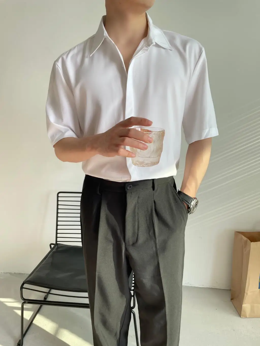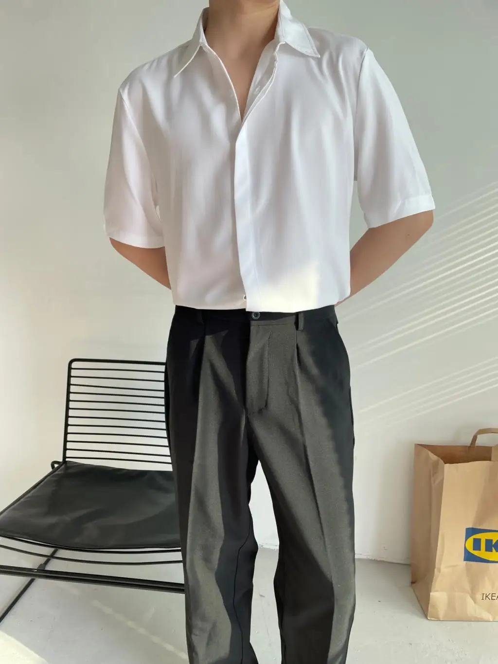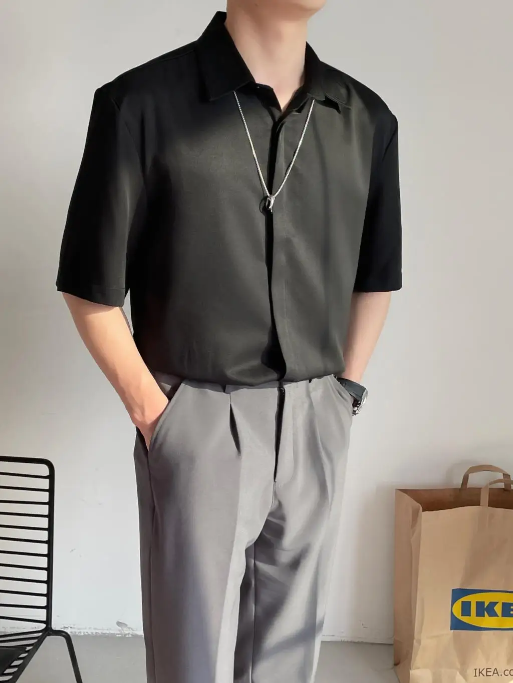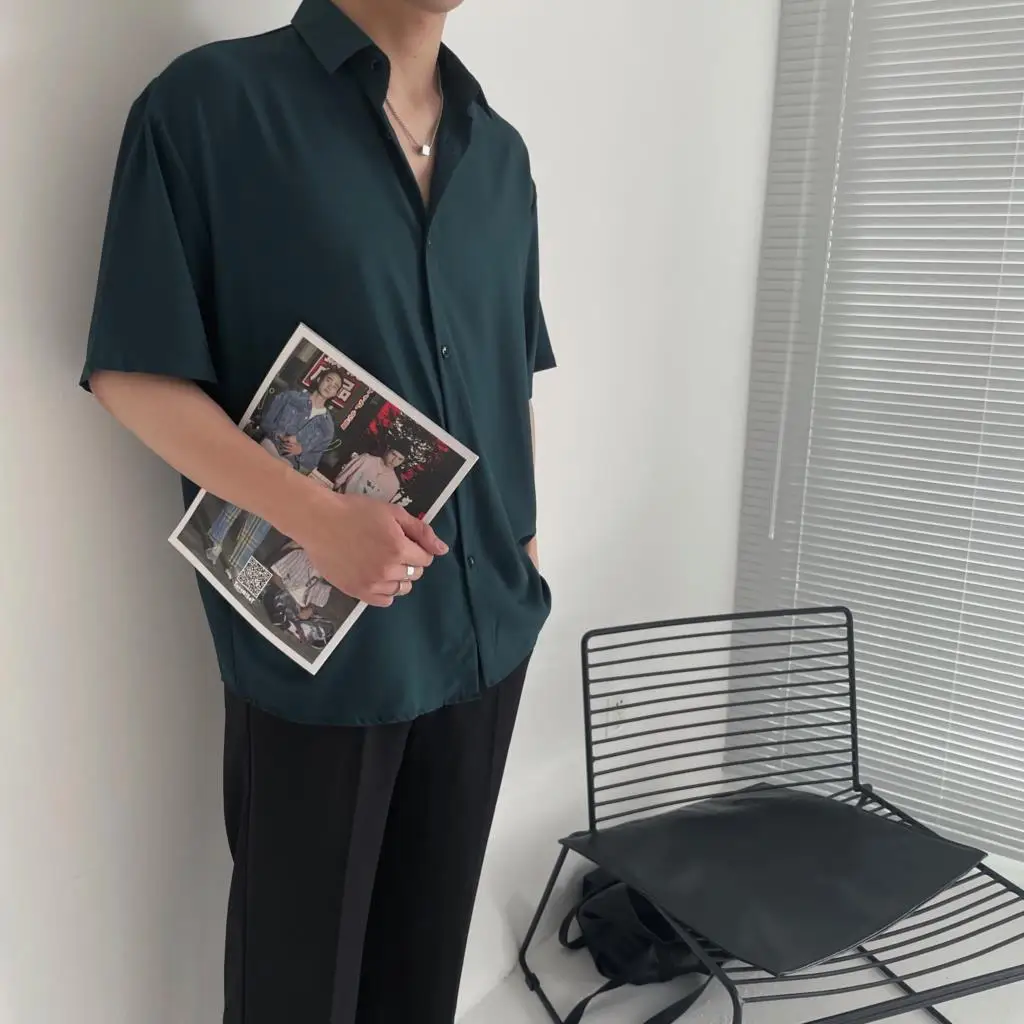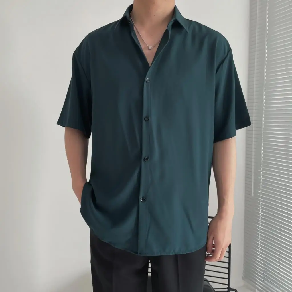 Wiaofellas - Luxury Ice Silk White Solid Shirts Men's Oversize Casual Short Sleeve Cardigan Fashion Spring Summer Blouses Unisex Gray Tops