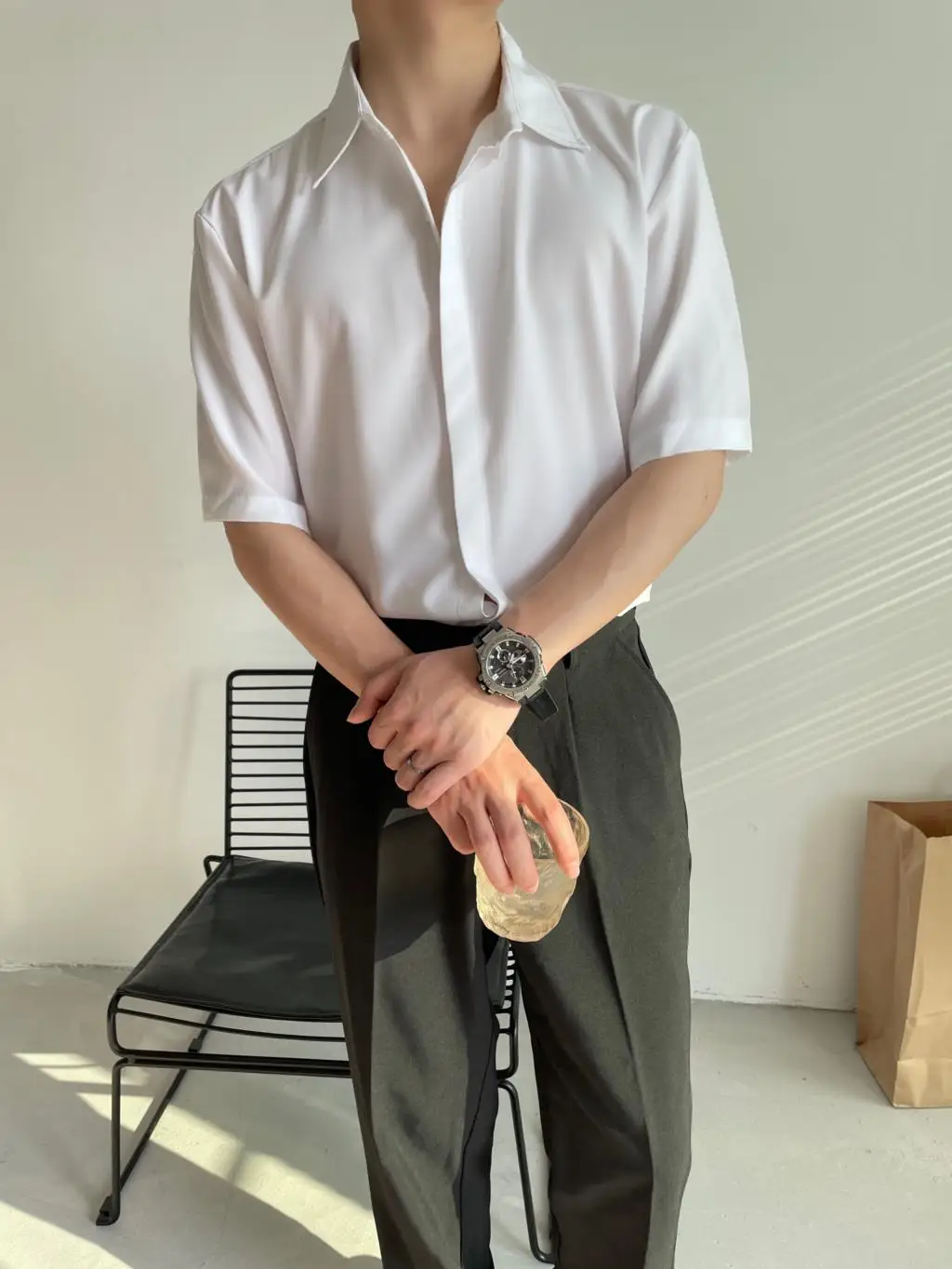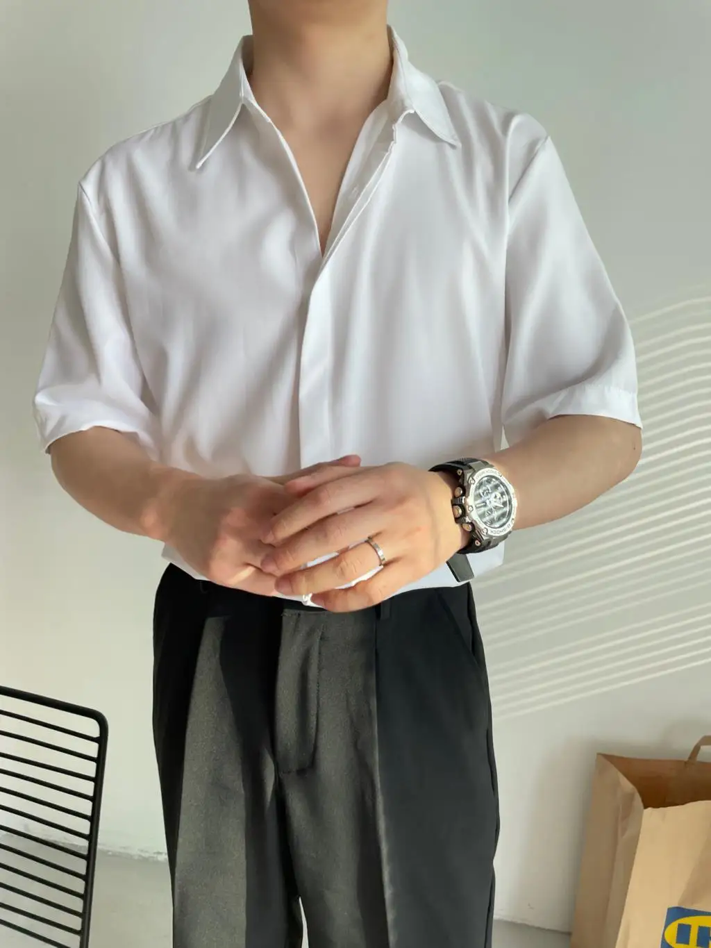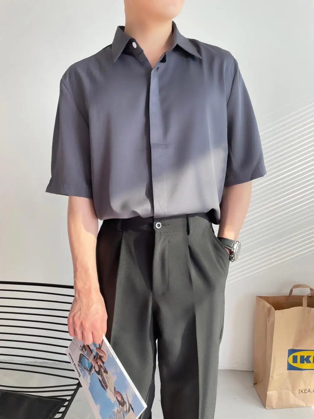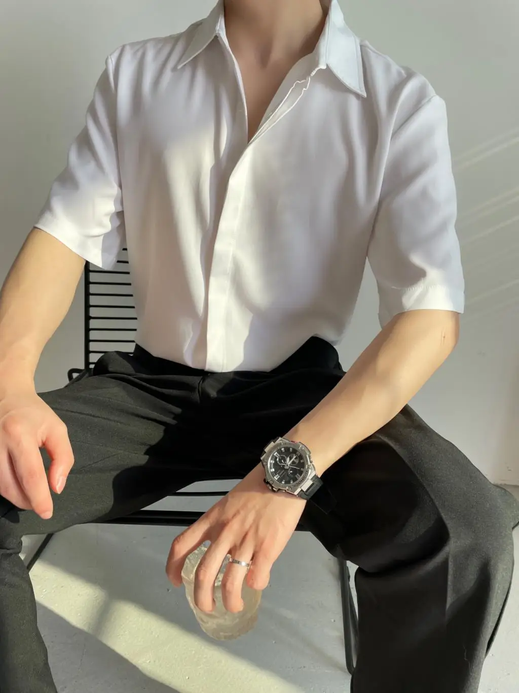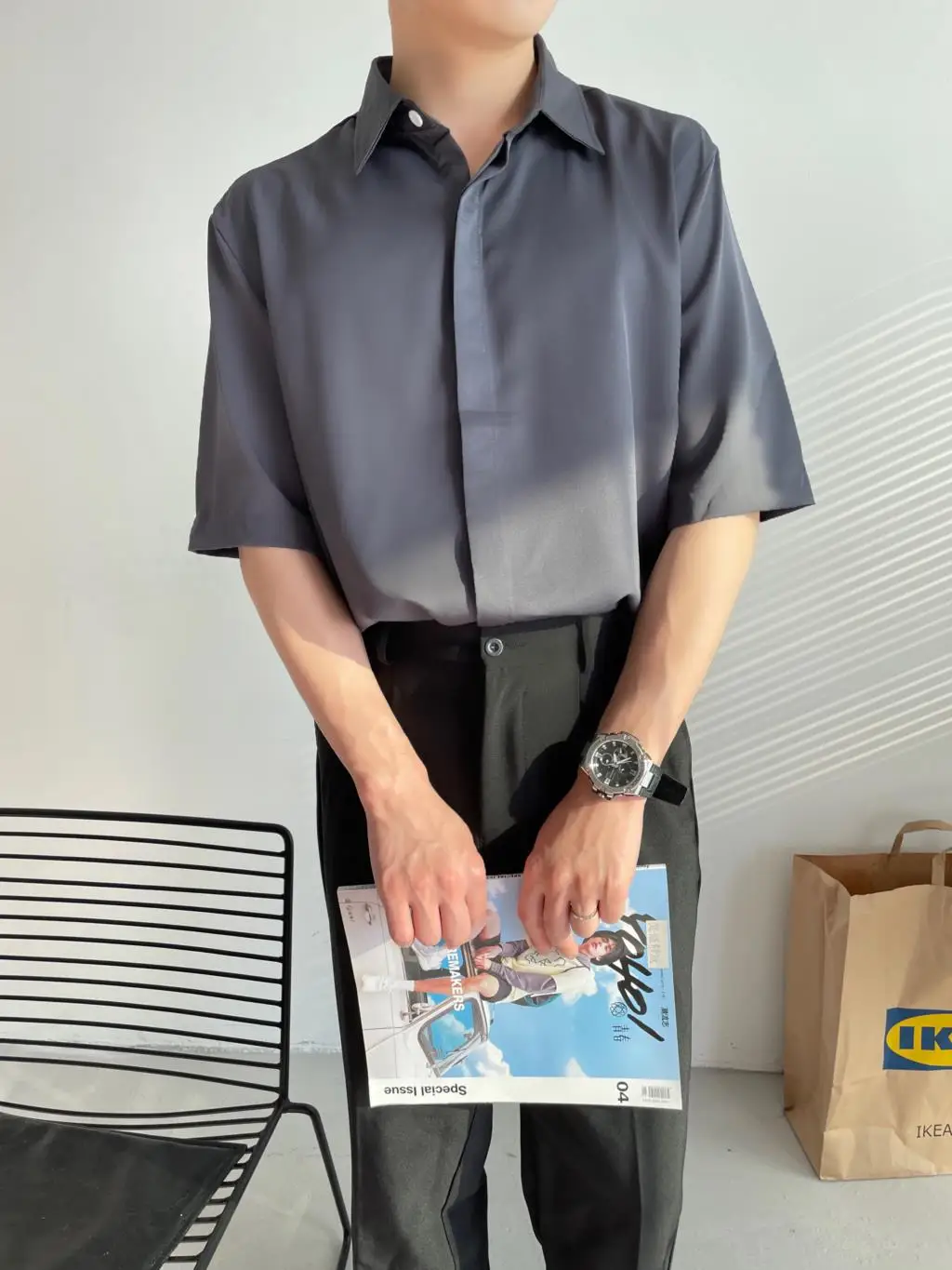 Wiaofellas - Luxury Ice Silk White Solid Shirts Men's Oversize Casual Short Sleeve Cardigan Fashion Spring Summer Blouses Unisex Gray Tops