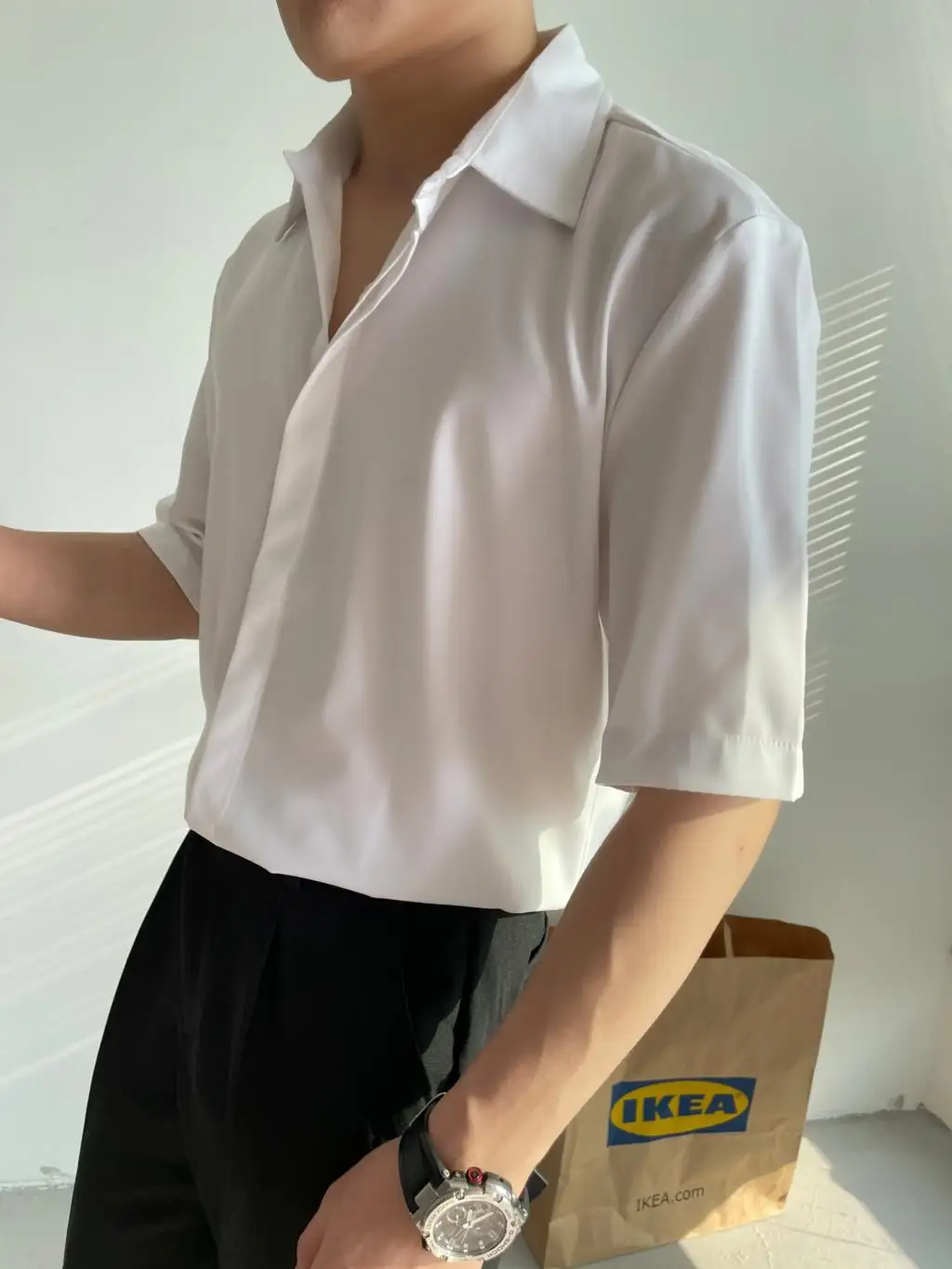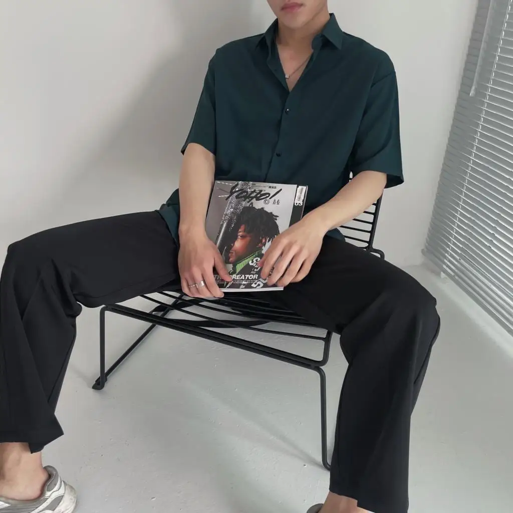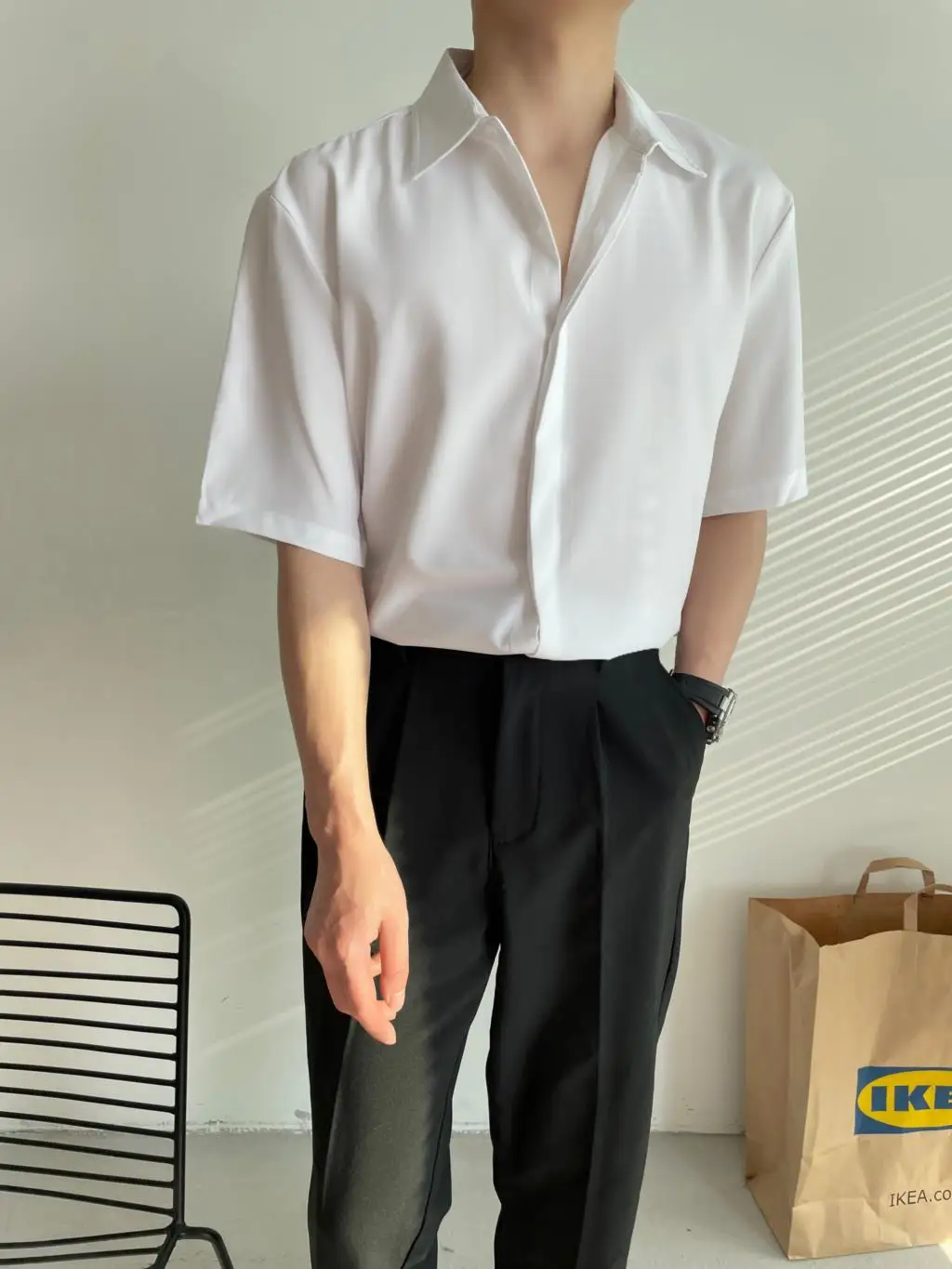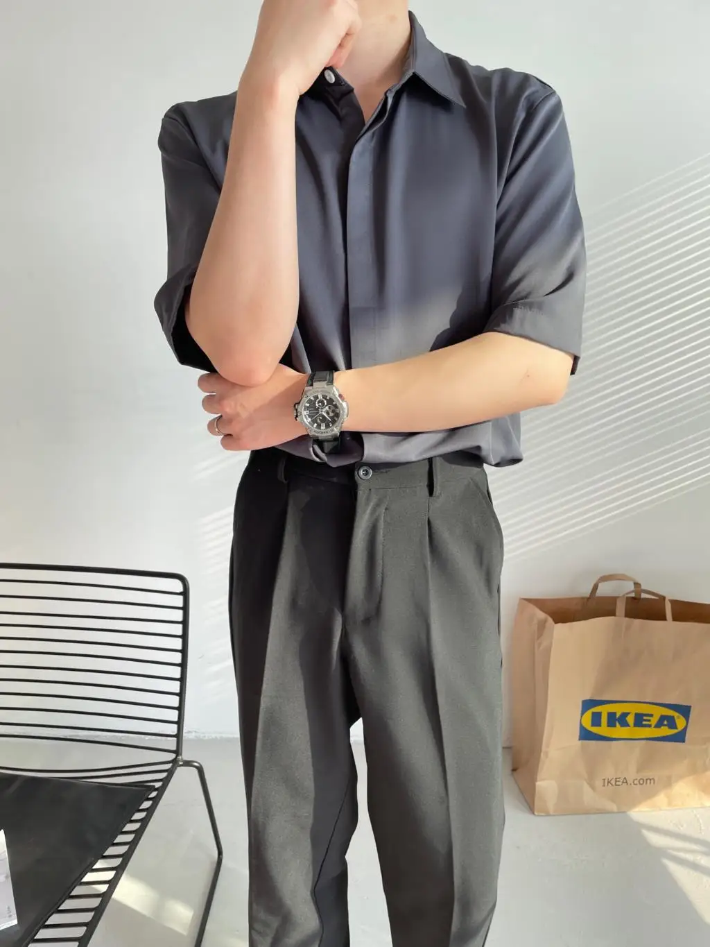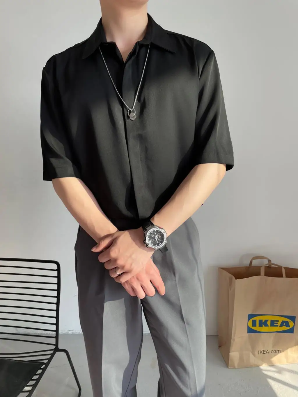 Wiaofellas - Luxury Ice Silk White Solid Shirts Men's Oversize Casual Short Sleeve Cardigan Fashion Spring Summer Blouses Unisex Gray Tops