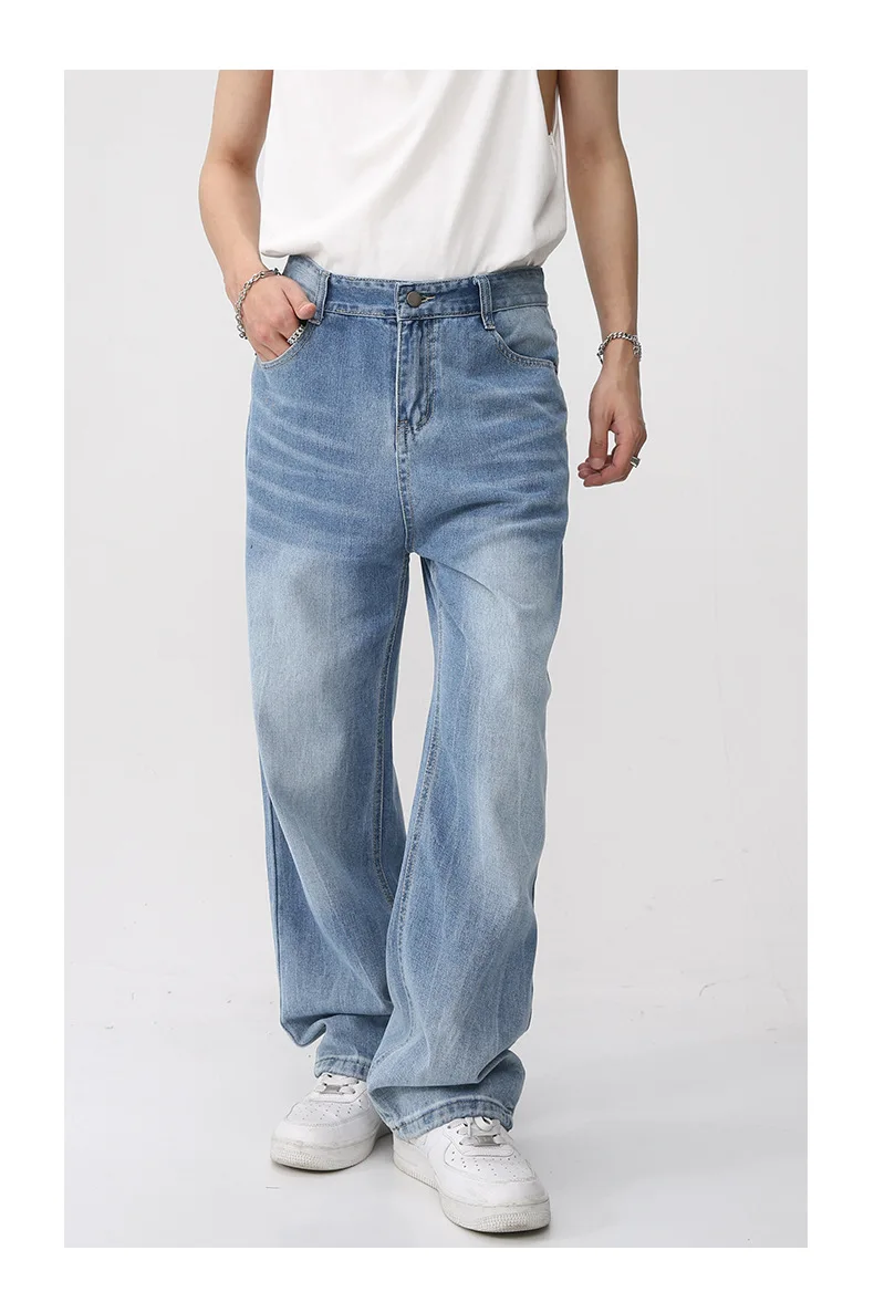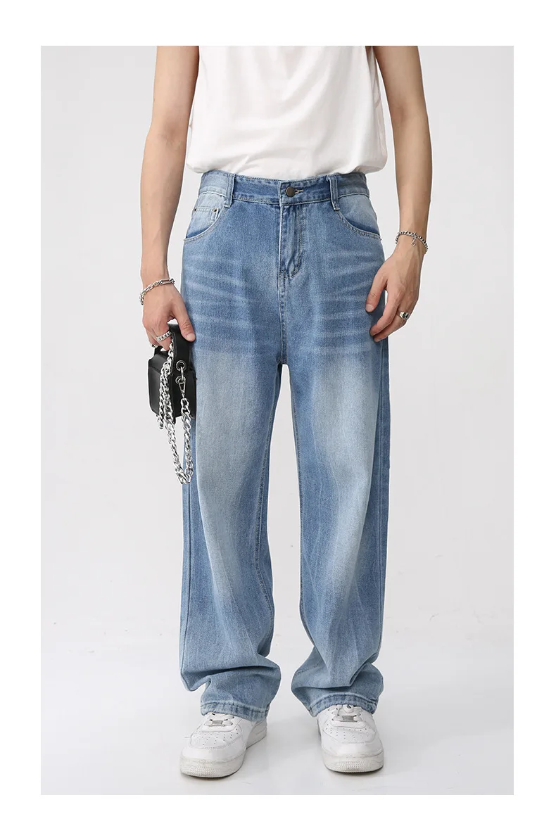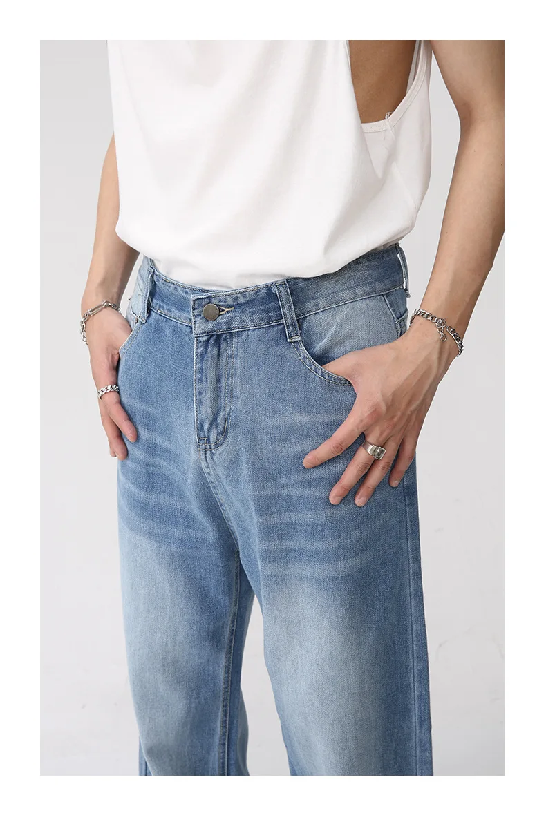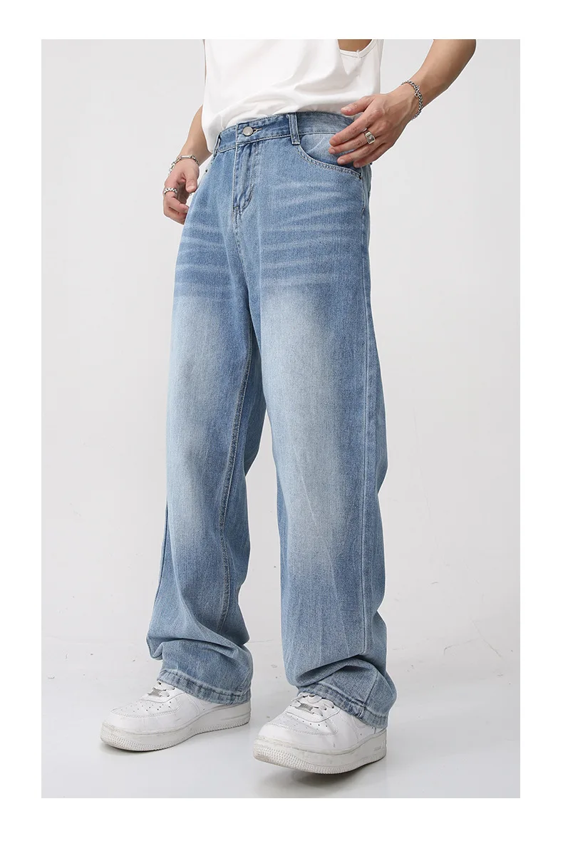 Wiaofellas Gradual Whitening Light Blue Jeans For Men Women All Seasons Unisex Slightly Loose Moustache Effect Denim Pants
