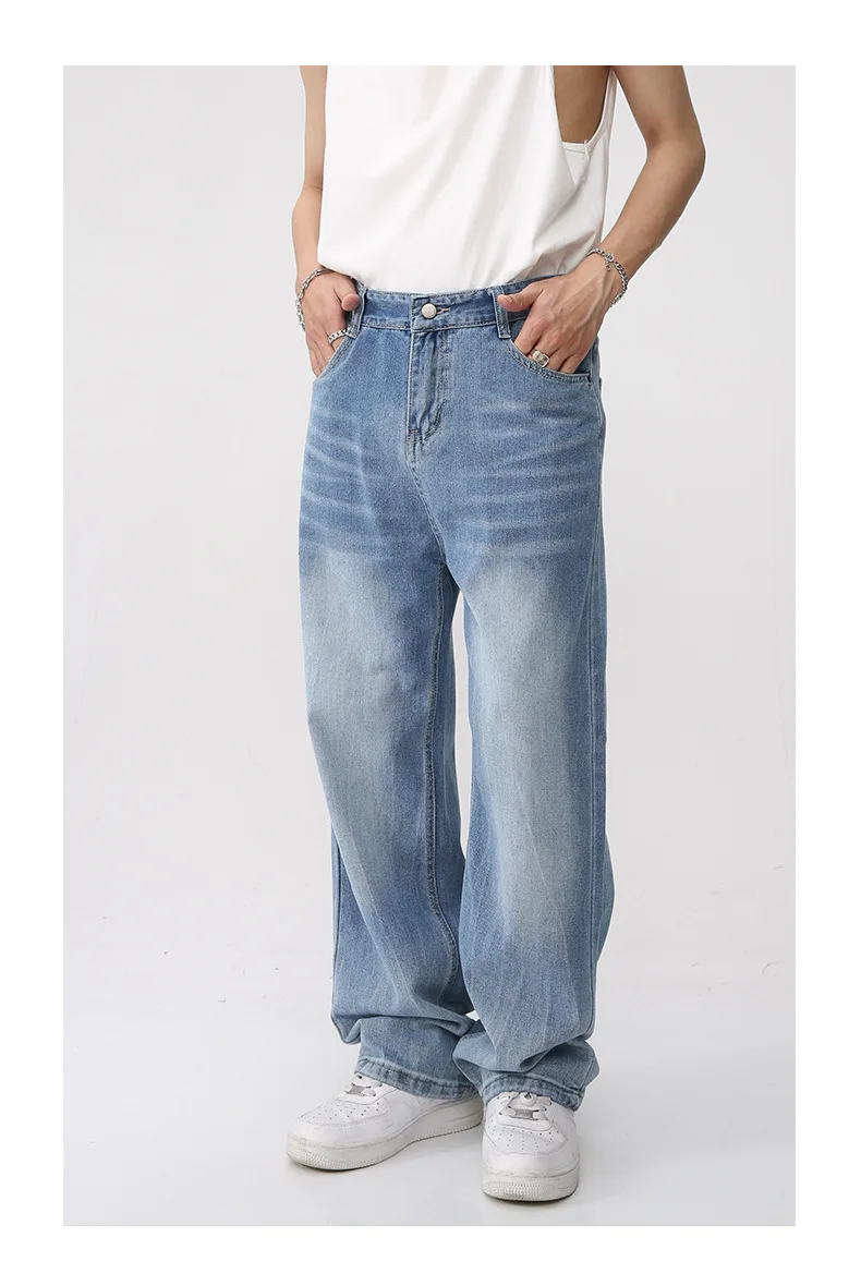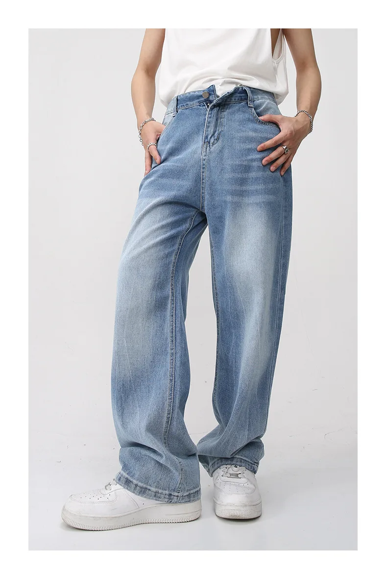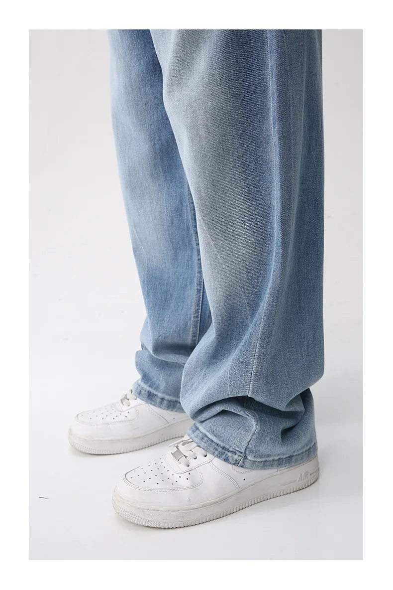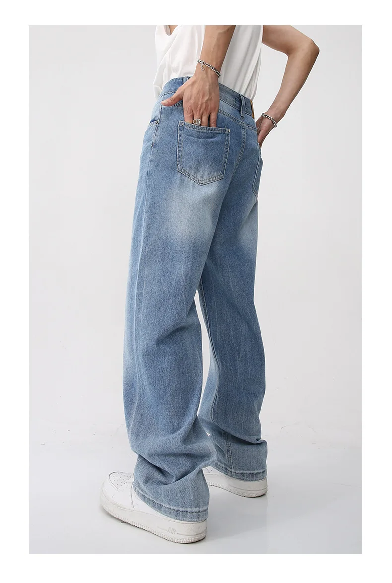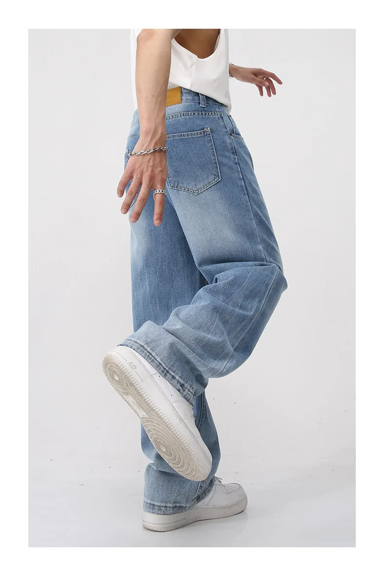 Wiaofellas Gradual Whitening Light Blue Jeans For Men Women All Seasons Unisex Slightly Loose Moustache Effect Denim Pants