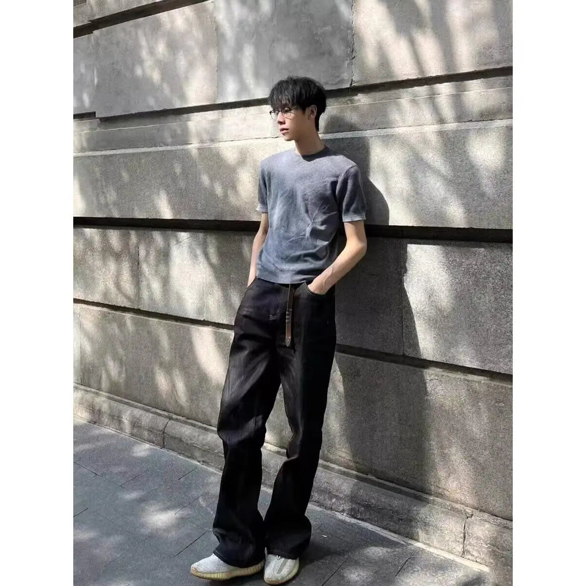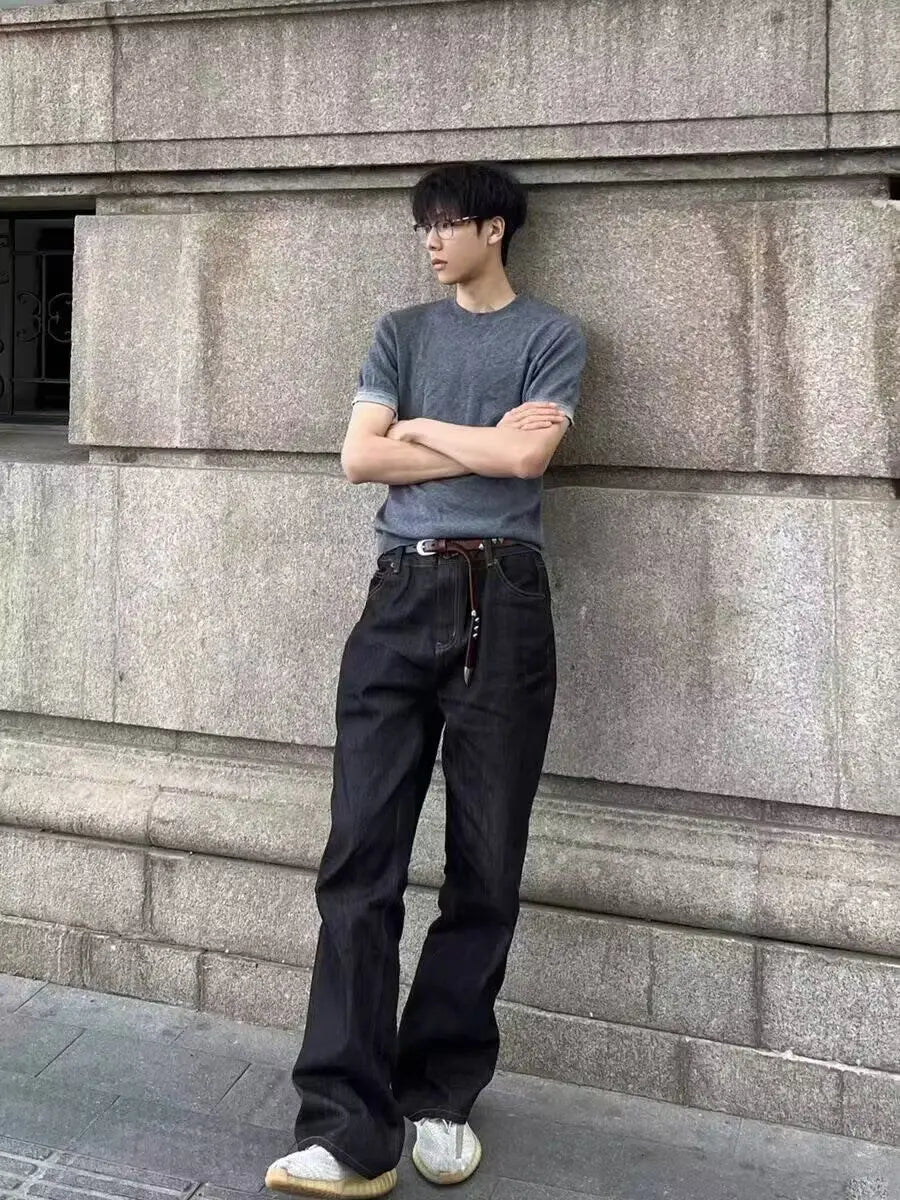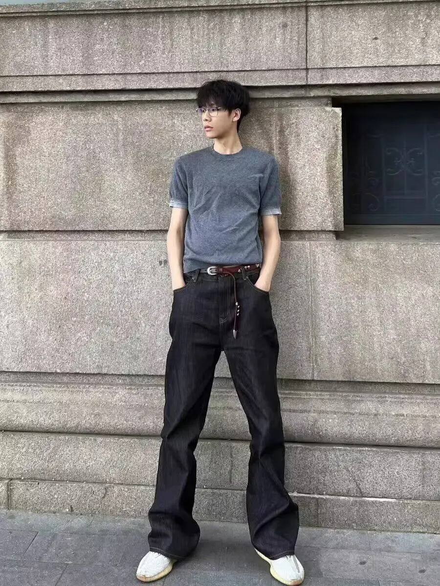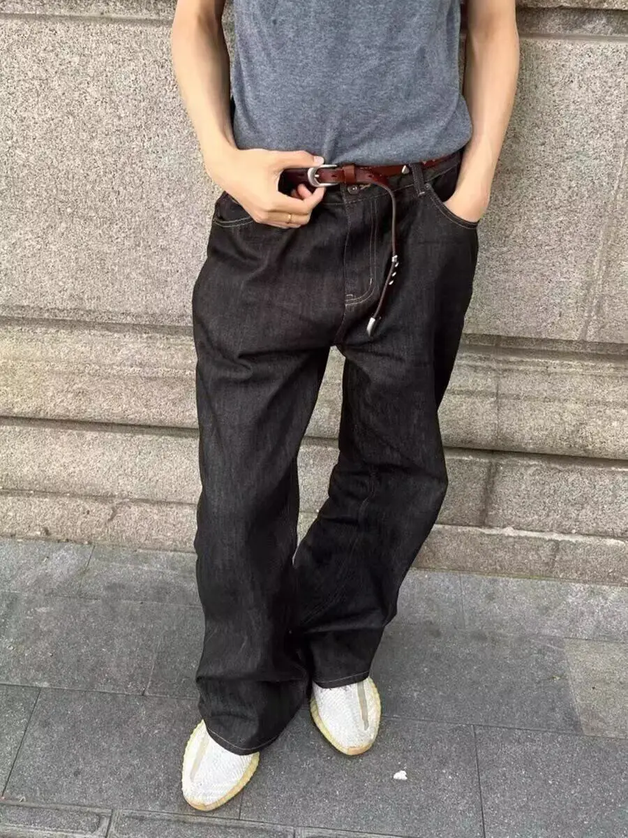 WIAOFELLAS - Retro American Waed adient Blue White Denim Jeans Loose Wide Leg Casual Long Trousers for Men And Women Trendy