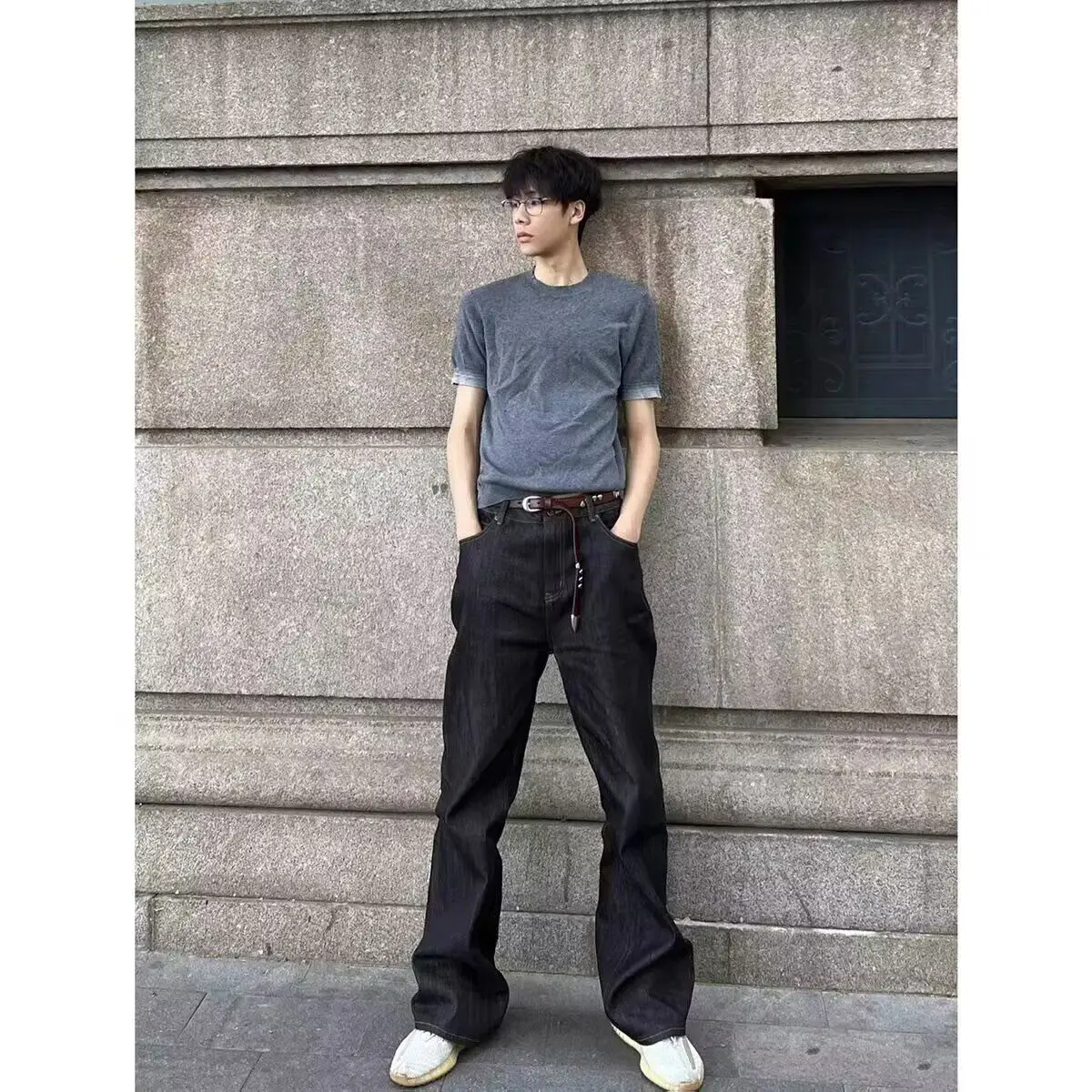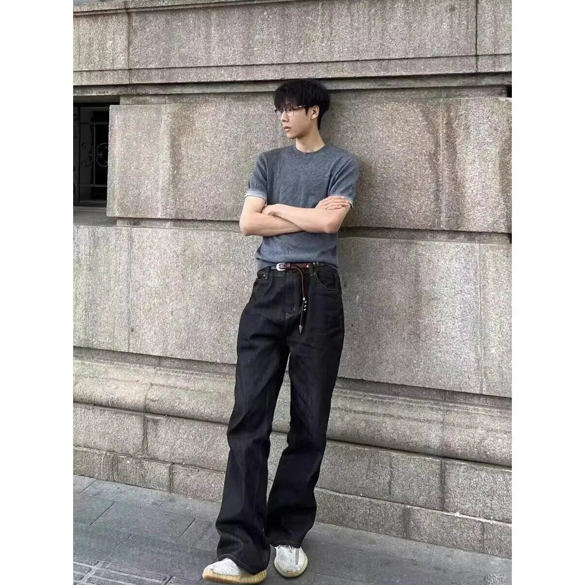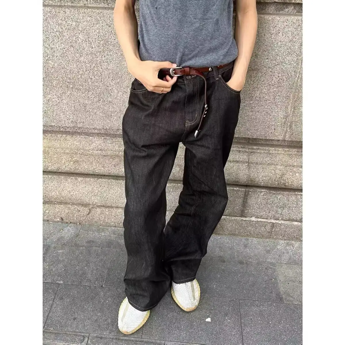 WIAOFELLAS - Retro American Waed adient Blue White Denim Jeans Loose Wide Leg Casual Long Trousers for Men And Women Trendy