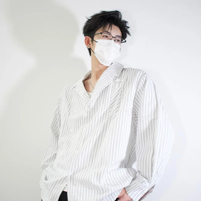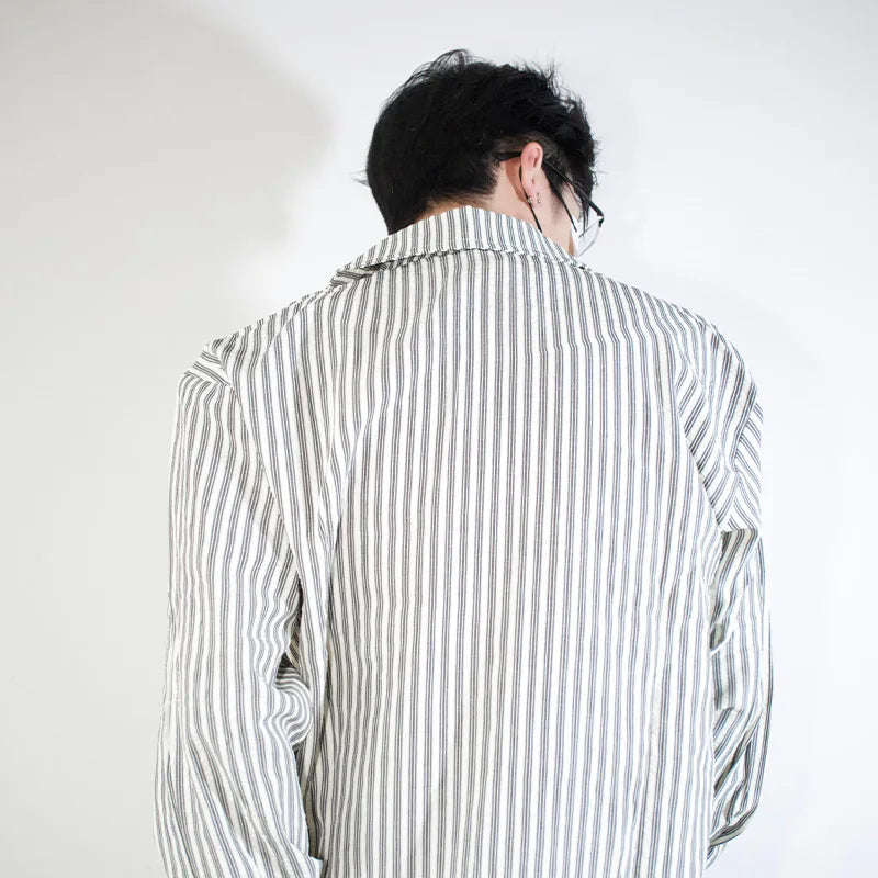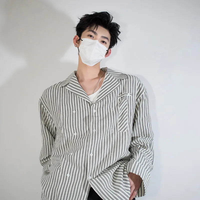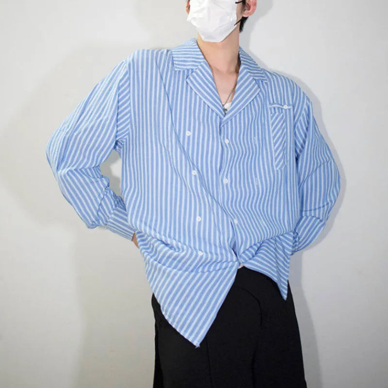 WIAOFELLAS - White Long Sleeved Shirt Men Fashion Society Mens Dress Shirt Korean Loose Blue Striped Shirt Mens Double Breasted Casual Shirt