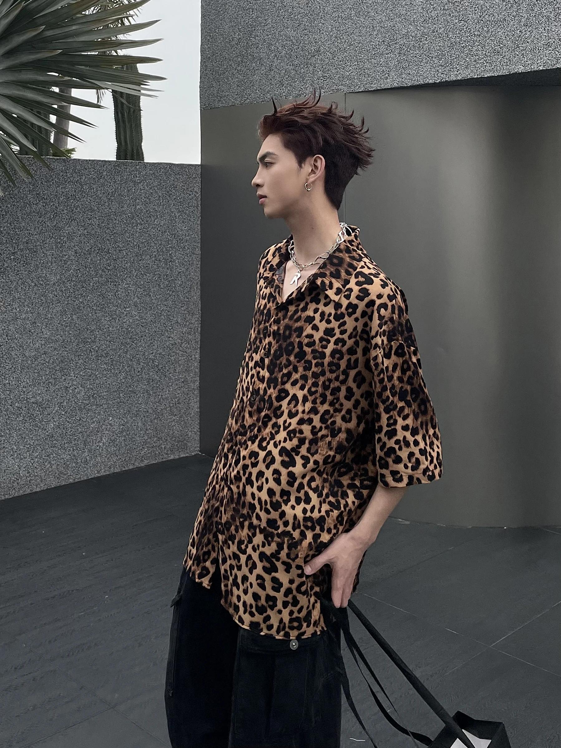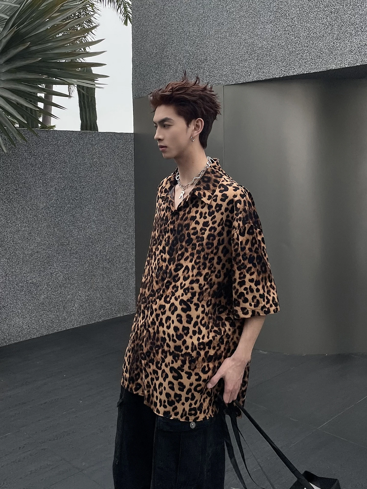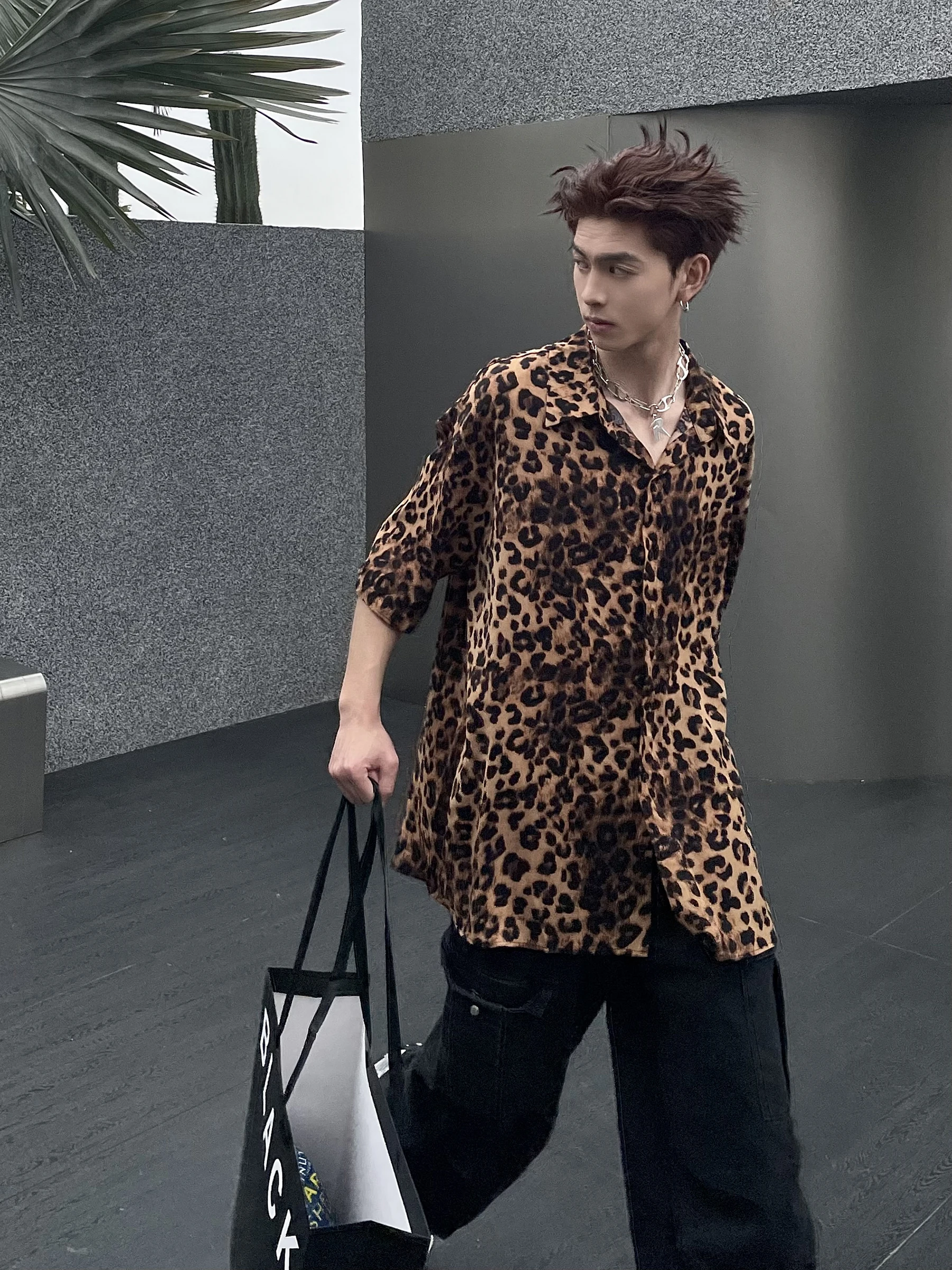 Wiaofellas - M-XXL Lazy style leopard print shirt men's short sleeve blouse summer loose ice silk beach trendy handsome half sleeve tops