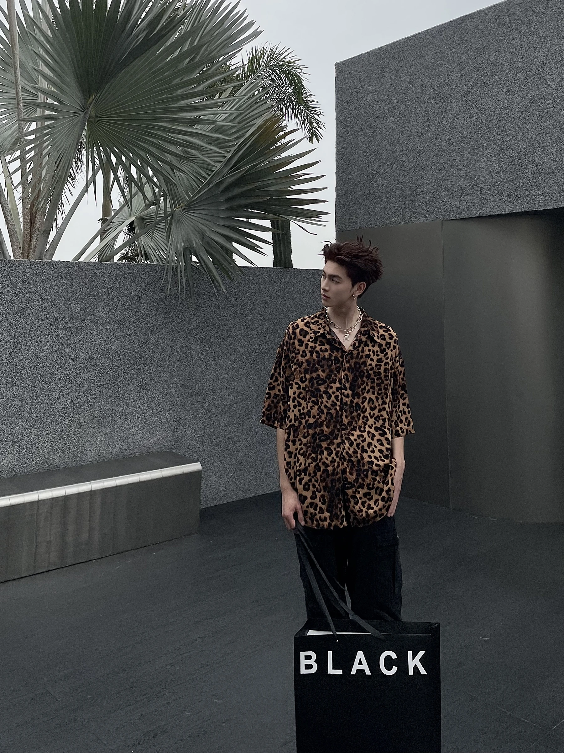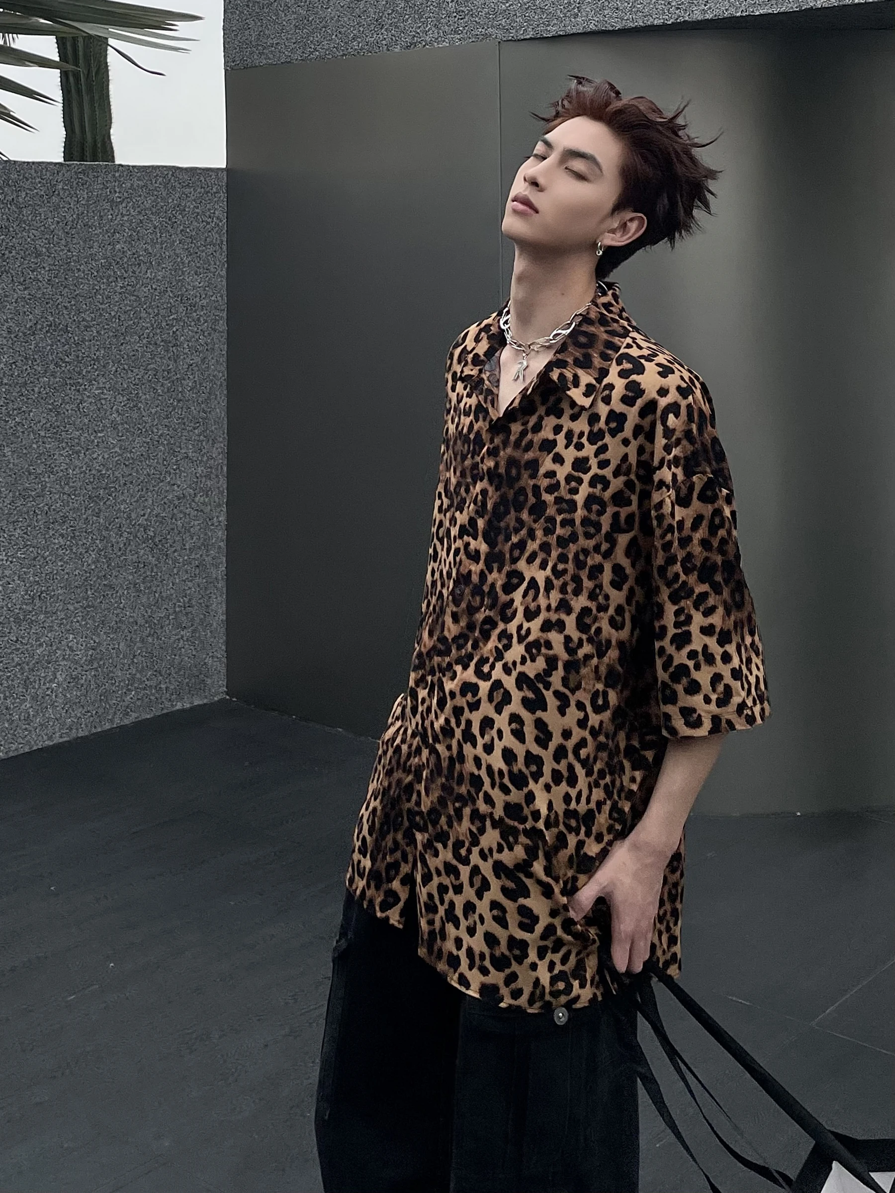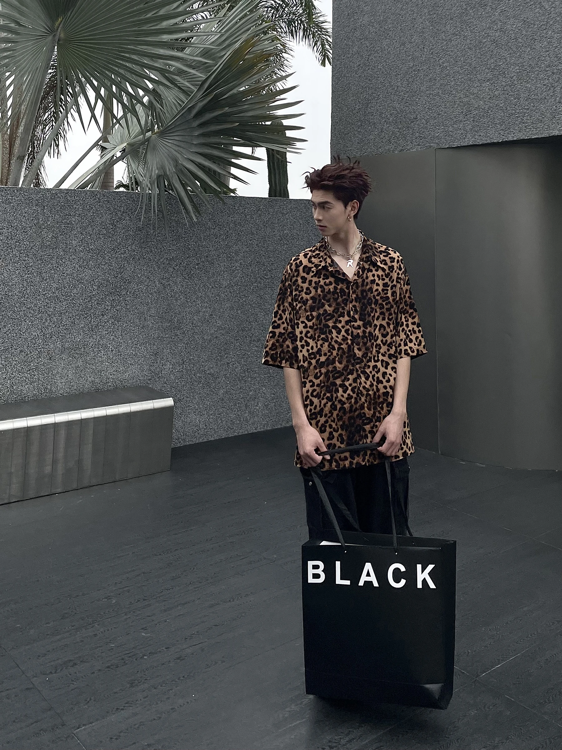 Wiaofellas - M-XXL Lazy style leopard print shirt men's short sleeve blouse summer loose ice silk beach trendy handsome half sleeve tops