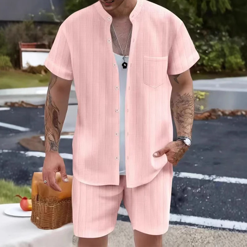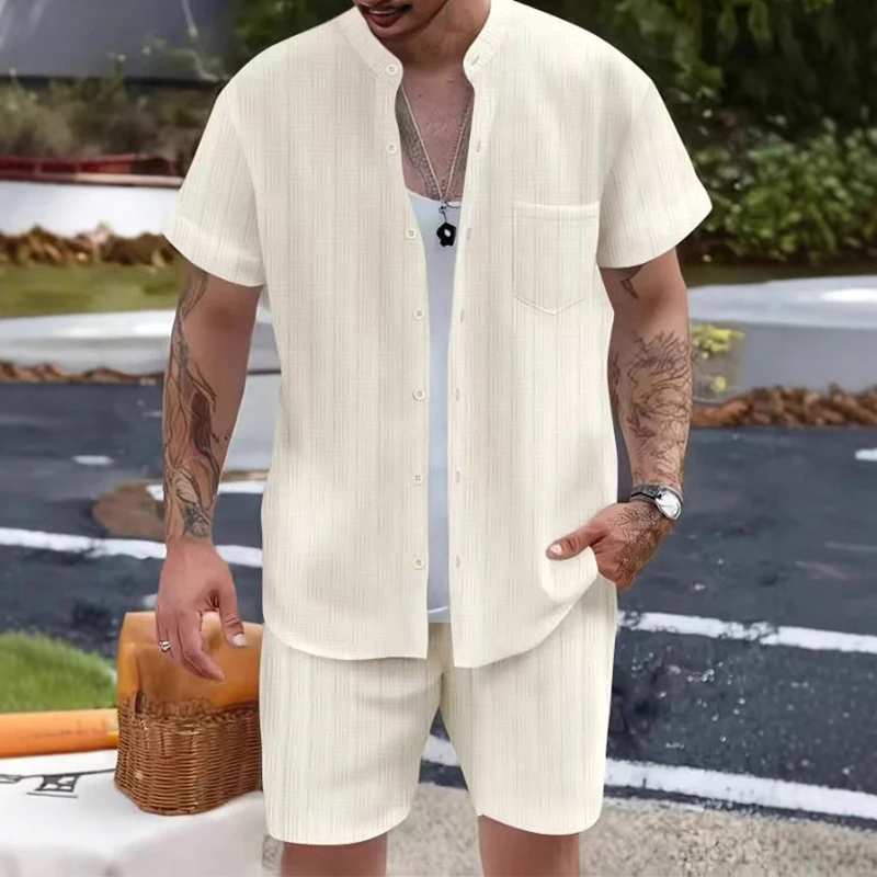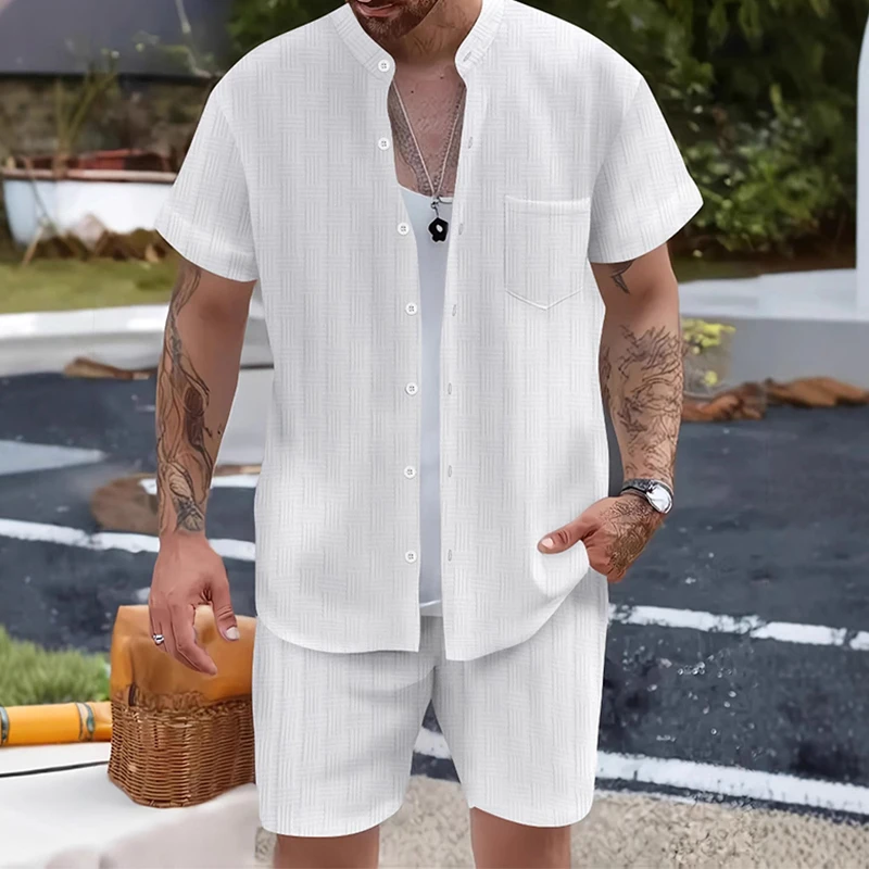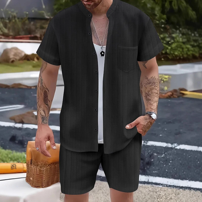 WIAOFELLAS - Seaside Beach Casual Breathable Two Piece Sets Men Summer Fashion Solid Color Shirts And Shorts Outfits Mens Trendy Loose Suits